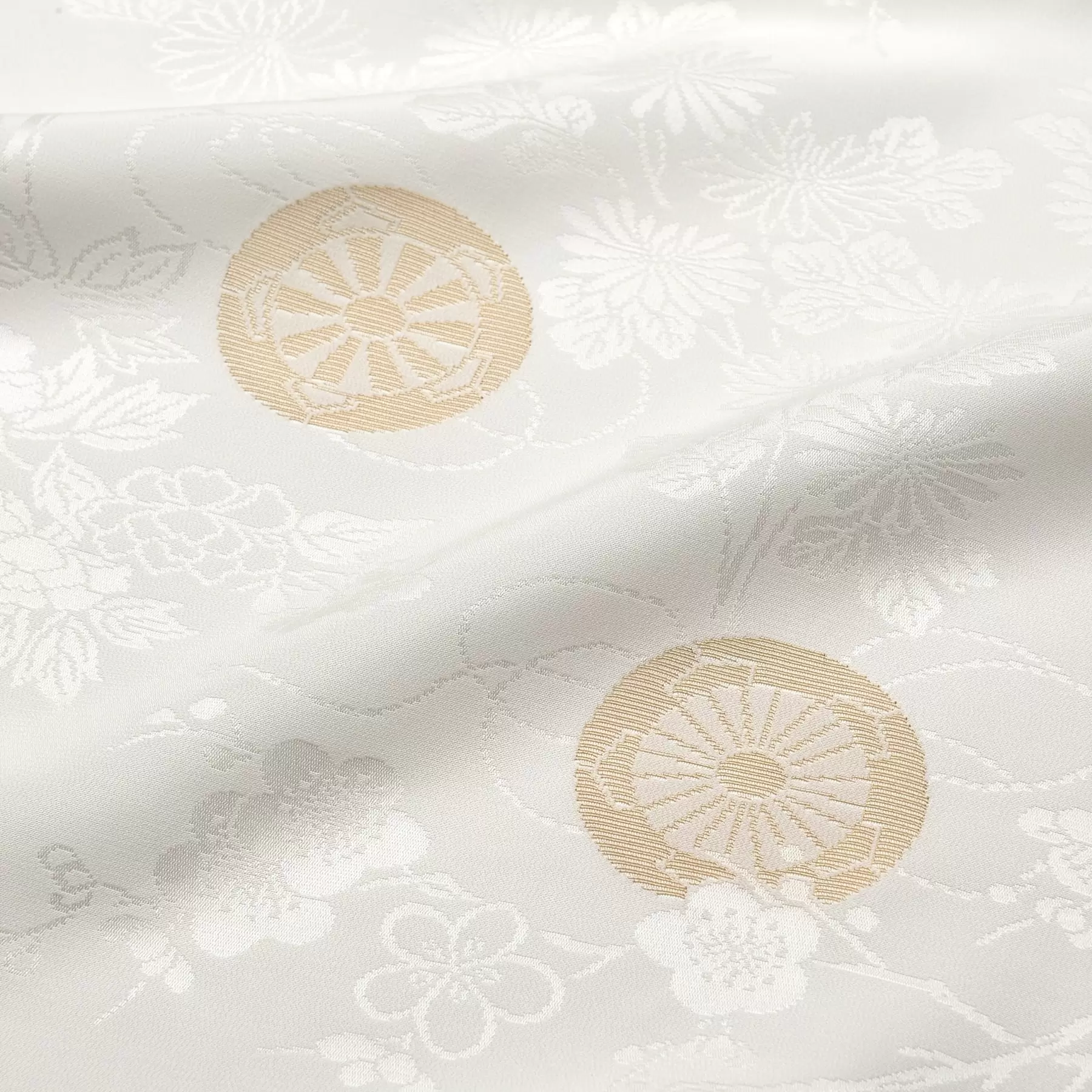 ふっくらとした風合いの生地に、文様化された御所車の車輪と、牡丹、菊、梅の地紋が浮かび上がります。車輪にはバランスよく金糸を織りこみました。華やかさがあり雅な雰囲気の長襦袢です。