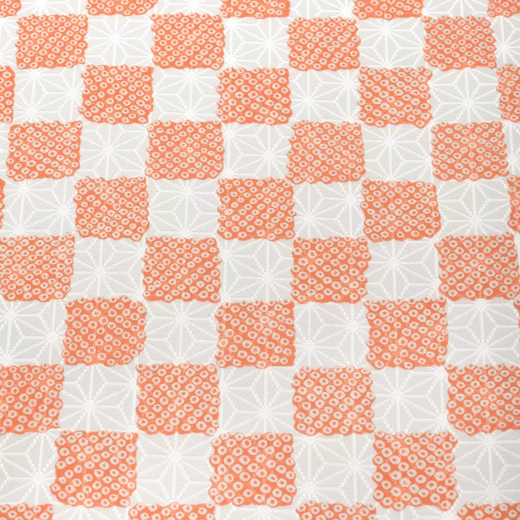 光沢のあるしなやかな生地を市松に染めました。麻の葉の地紋の白い生地の部分に、摺り疋田が入った染の部分がリズミカルに並ぶ長襦袢は、小紋や色無地などお洒落なきものに合わせて軽やかにお召ください。