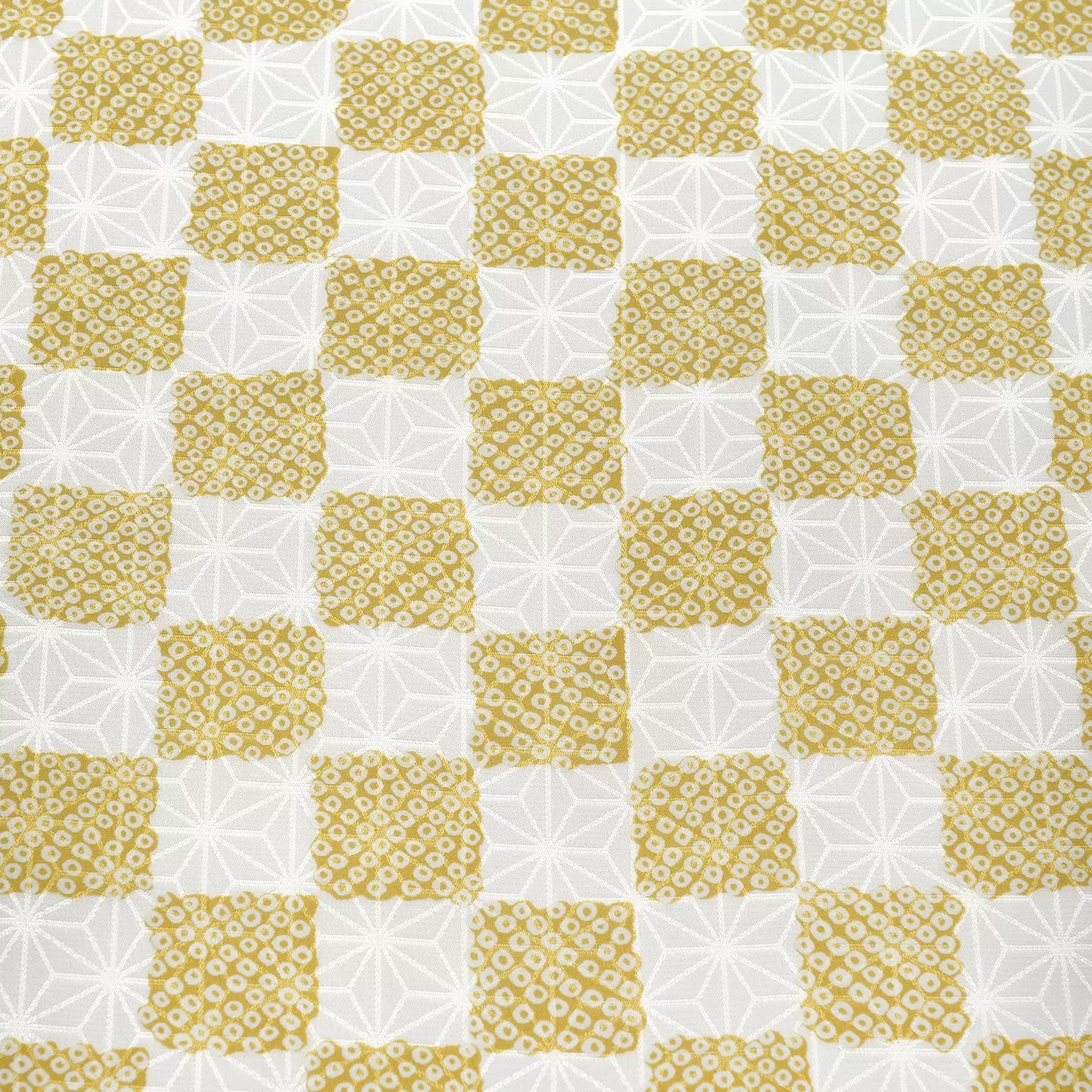 光沢のあるしなやかな生地を市松に染めました。麻の葉の地紋の白い生地の部分に、摺り疋田が入った染の部分がリズミカルに並ぶ長襦袢は、小紋や色無地などお洒落なきものに合わせて軽やかにお召ください。