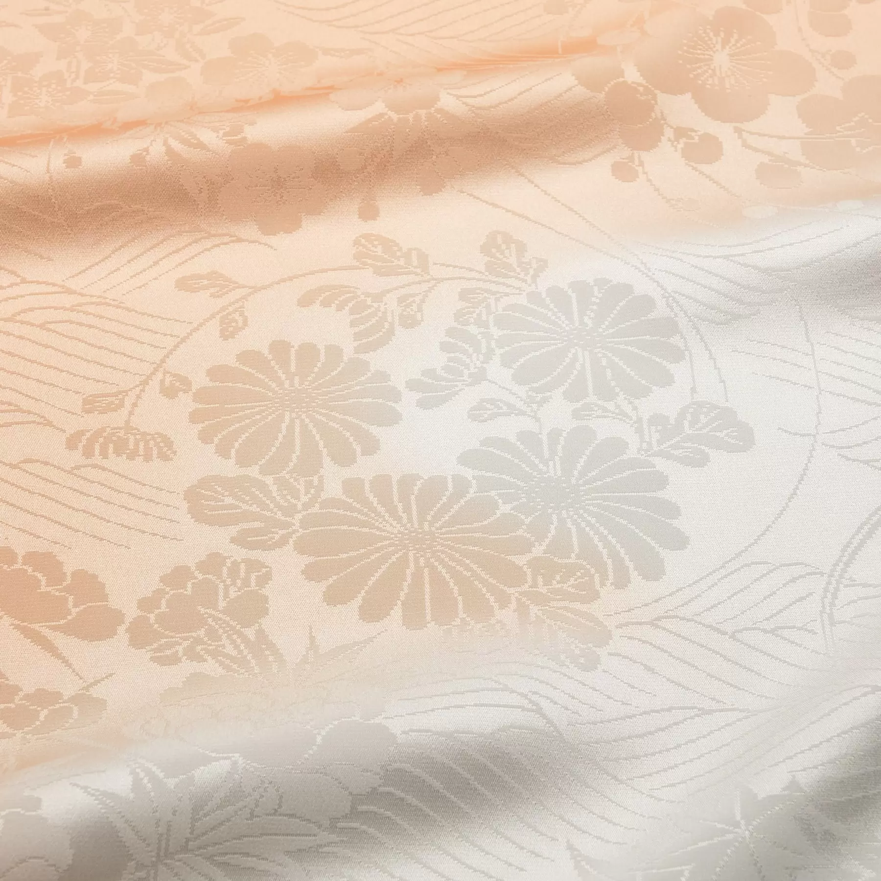 しっとりとした風合いの紋綸子の生地を、オレンジ色で雲のように暈しながら染上げました。愛らしい春秋の花の丸とやわらかい波の地紋が優しく浮かび上がります。袖口、ふり口からちらりとのぞいた時に、優しい印象を与える長襦袢です。