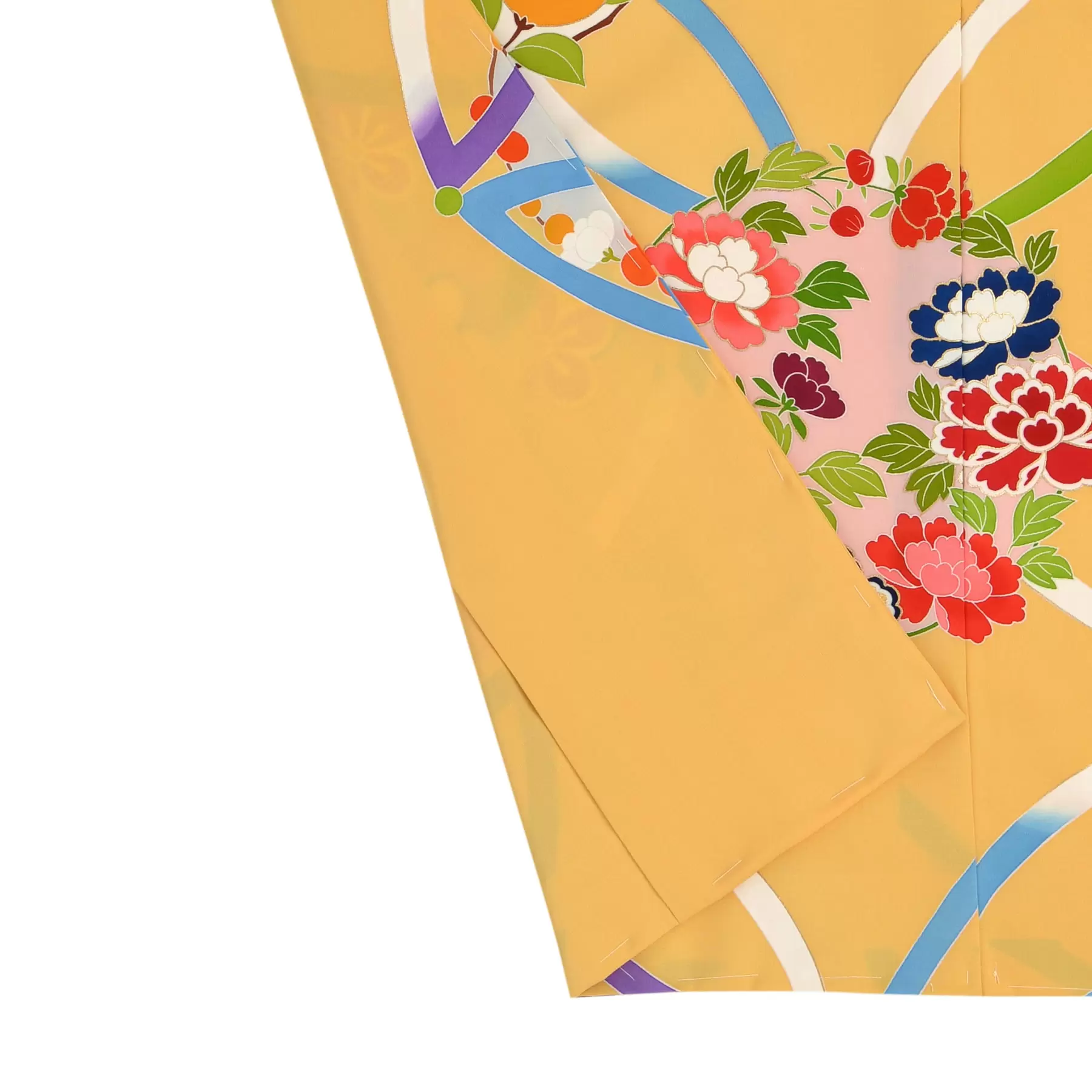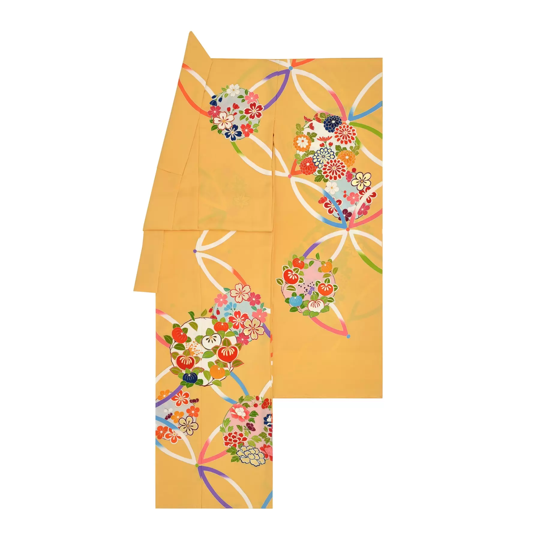 温かな黄色の地色が楽しい気分にさせてくれる振袖です。人やものとの縁を繋ぐ七宝文様と、花の丸のやわらかな曲線のデザインを、紺や赤をアクセントにした配色で引き締めています。これからの人生に幸多かれと願いを込めて作りました。