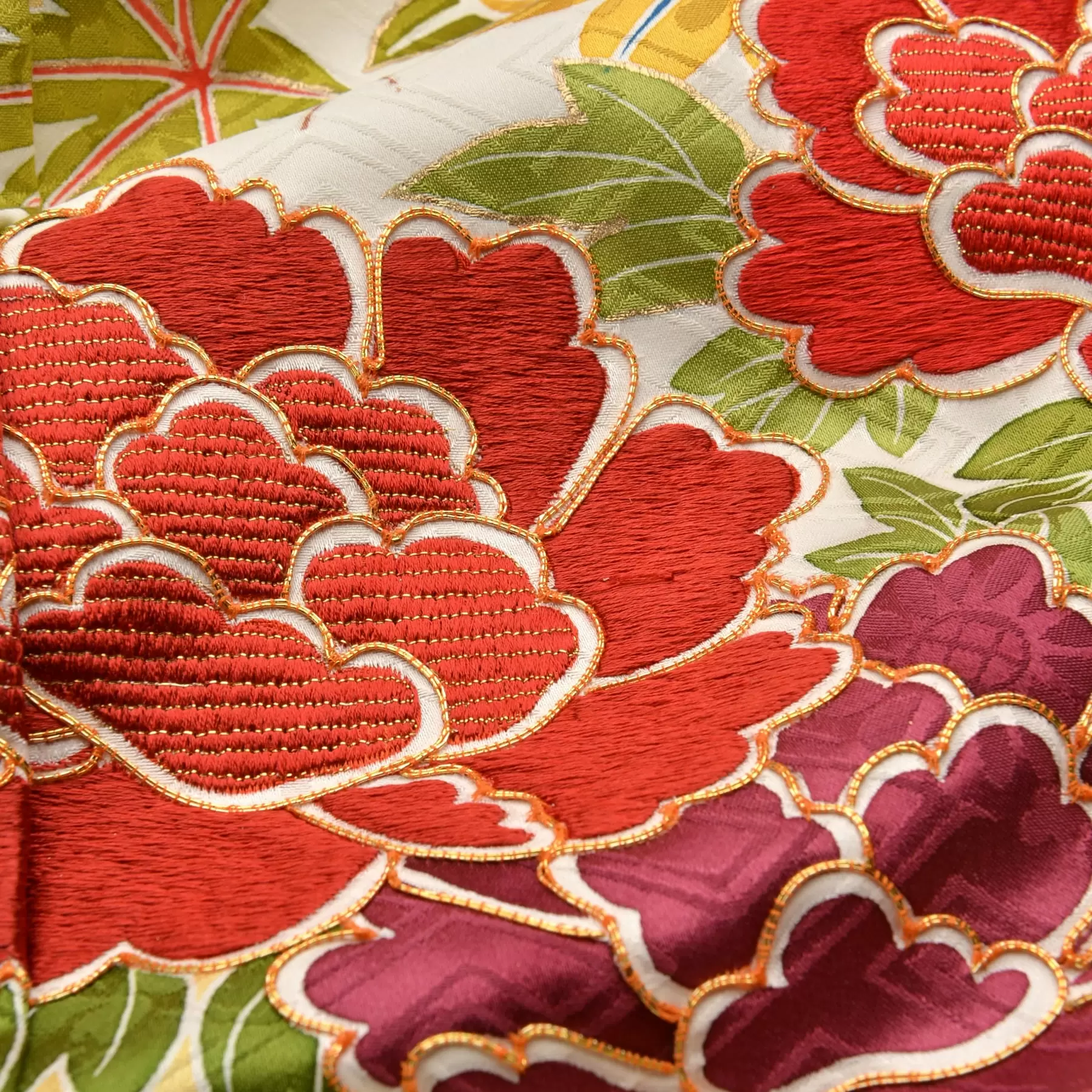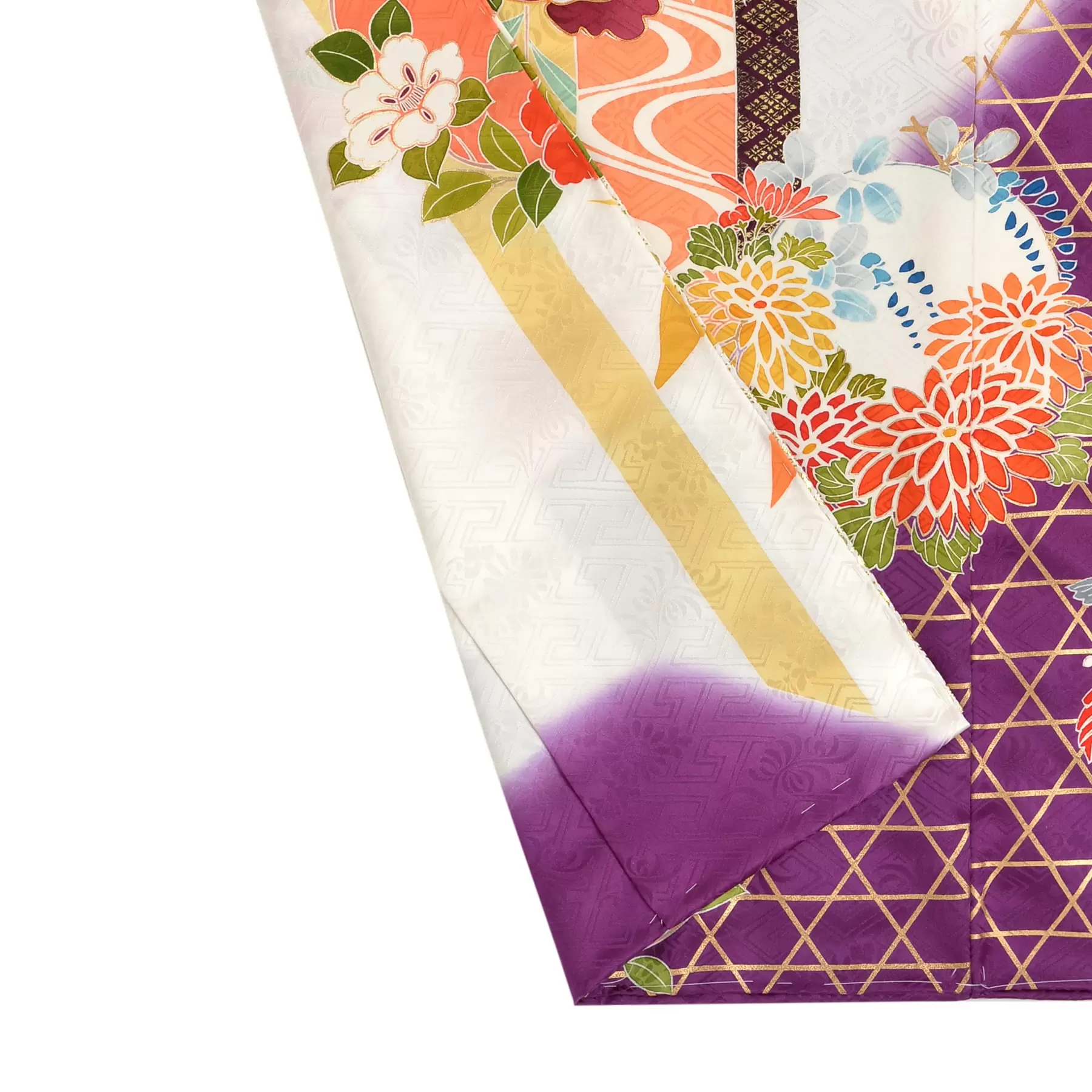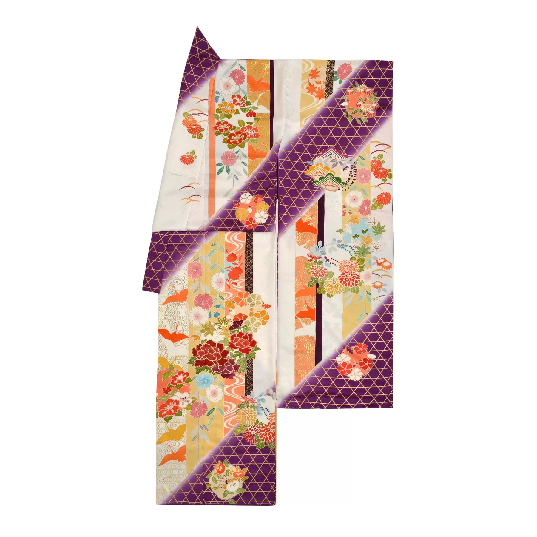 縦縞模様に斜めに流れる染分けが美しく目を引く振袖です。花の丸、籠目、縞、それぞれのモチーフが重層的に重なり合い、きものという一つの空間の中に様々の表情を生み出しています。草花や流水、鶴という柄が美しく配され京友禅の多彩さを堪能できる一枚です。