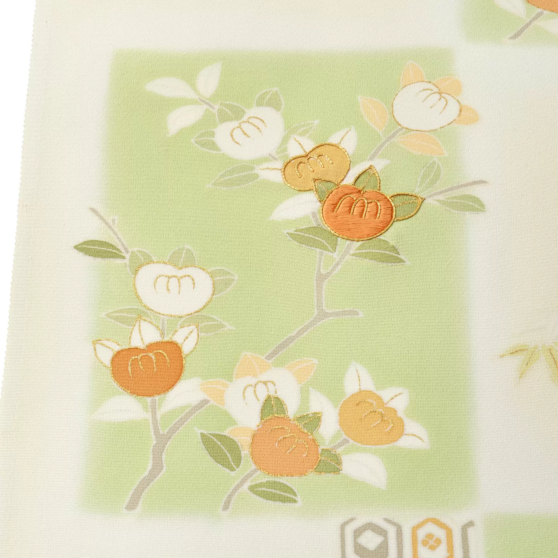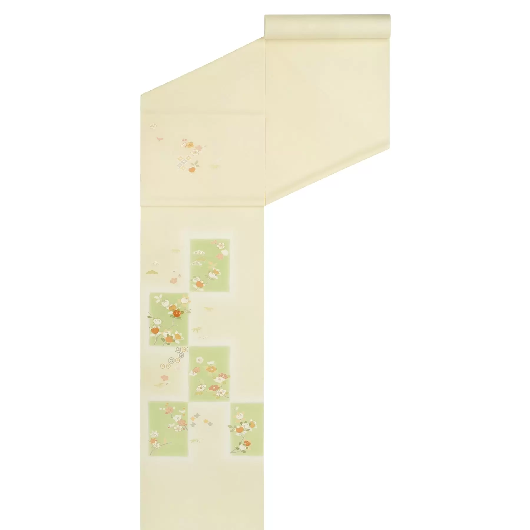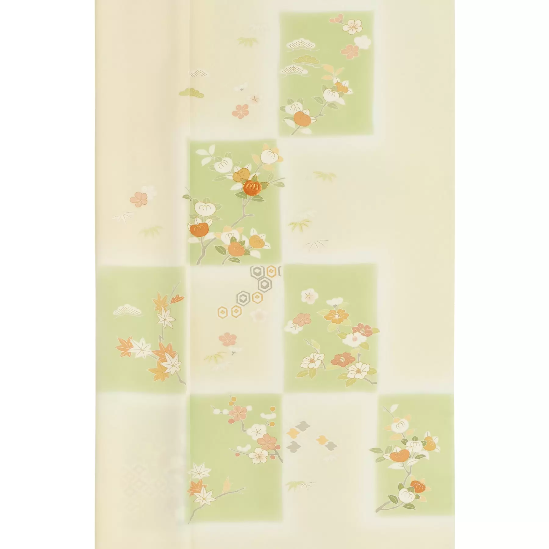 仕立てると裾まわりに柄がふんわりと広がる華やかなデザイン。暈し染めの大きな市松の中に、小袖の文様から取られた四季の花々や吉祥文様が描かれています。優しい地色に浮かび上がるグリーンの市松が、立体感と豪華さを際立たせてくれる千總らしい定番の付下です。式典への参列や、初釜、結婚パーティーなどに最適です。