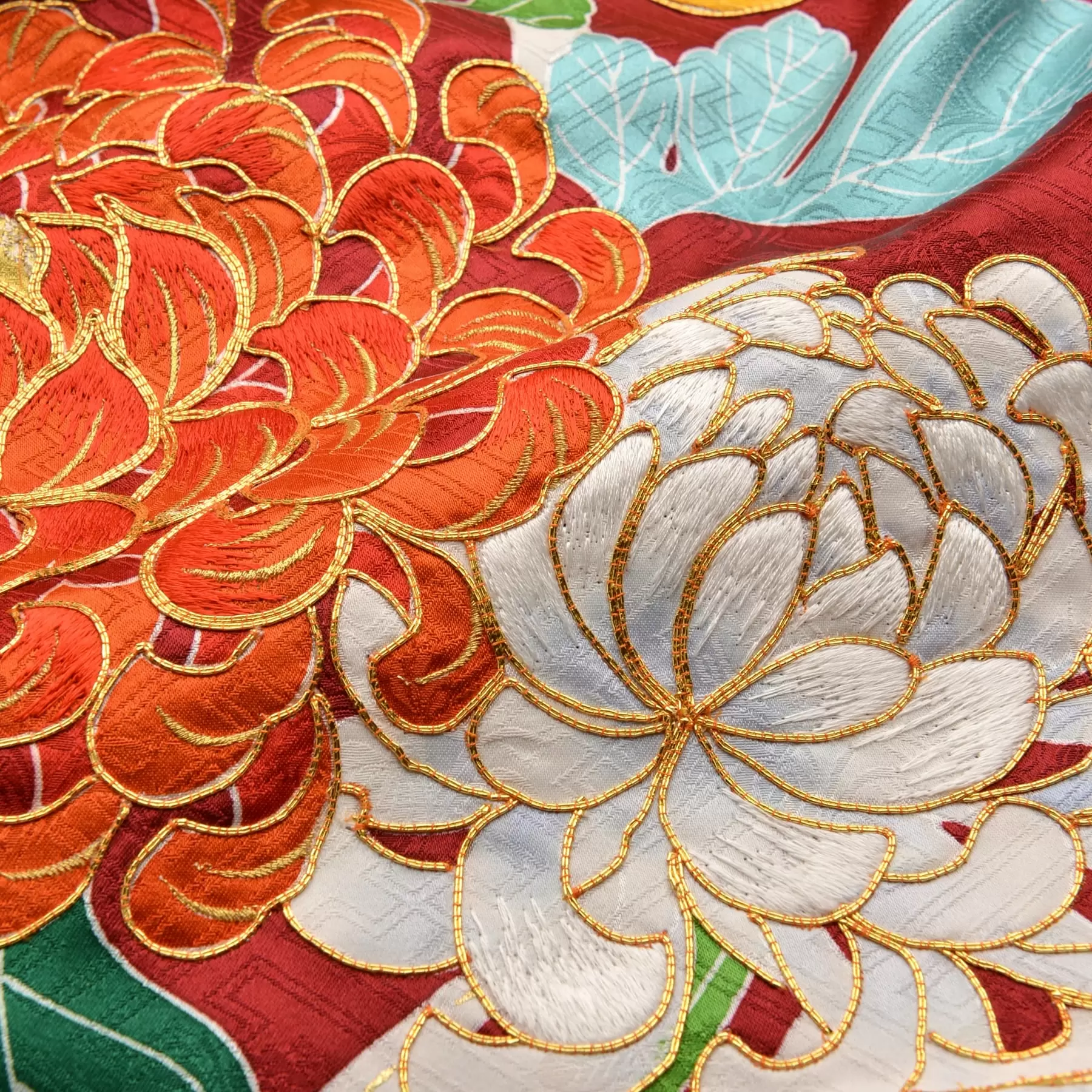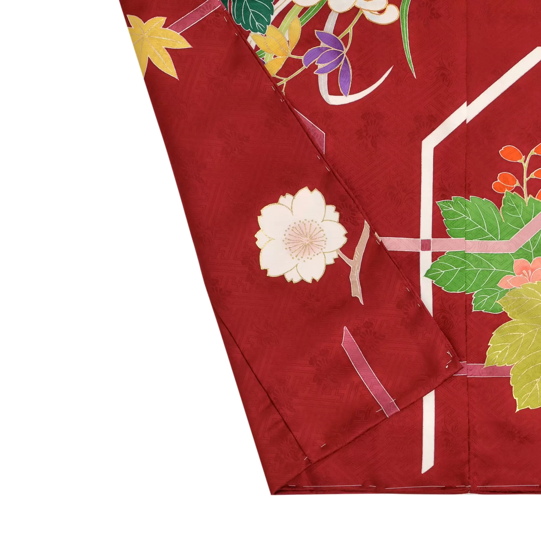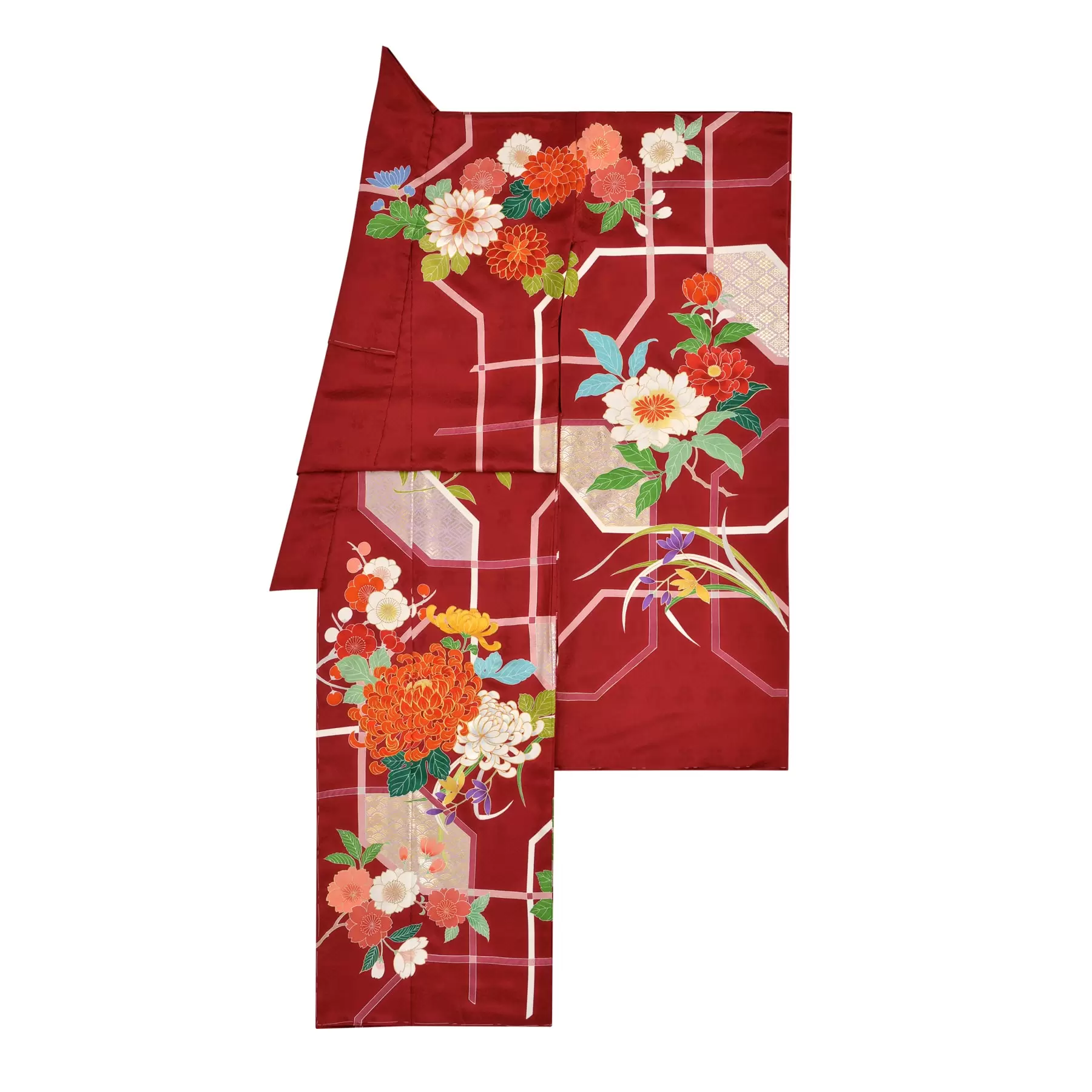 千總の紋に使われている八角形を幾重にも重ね合わせて、線と面の構成の中に優美な花々をデザインしました。深い赤地に京友禅で丁寧に描かれた花々は瑞々しく生命力に溢れ、幾何学的なデザインとの融合が、静と動の対比を作り出しています。人気の赤の振袖の中でも大人っぽくお召しになれる一枚です。