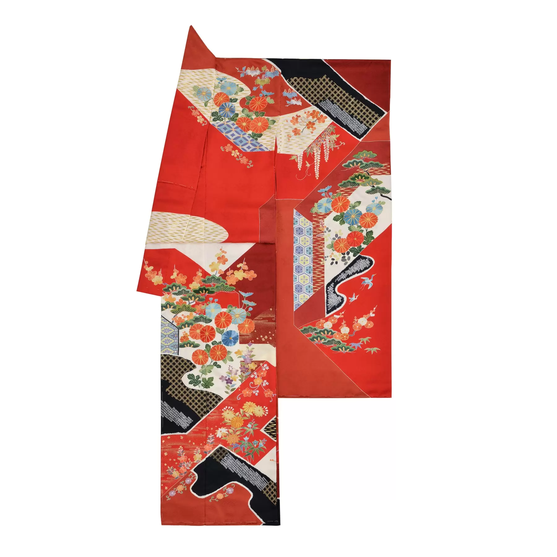 千總の紋にも使われている八角形をデザインのベースに、古来から大切にされてきた日本らしい自然の風景と古典文様を組み合わせました。細やかな刺繍や箔の加飾、黒を効果的に配した絞りの染分けが重厚感を演出。身にまとうと背筋がスッと伸びる凛とした振袖です。