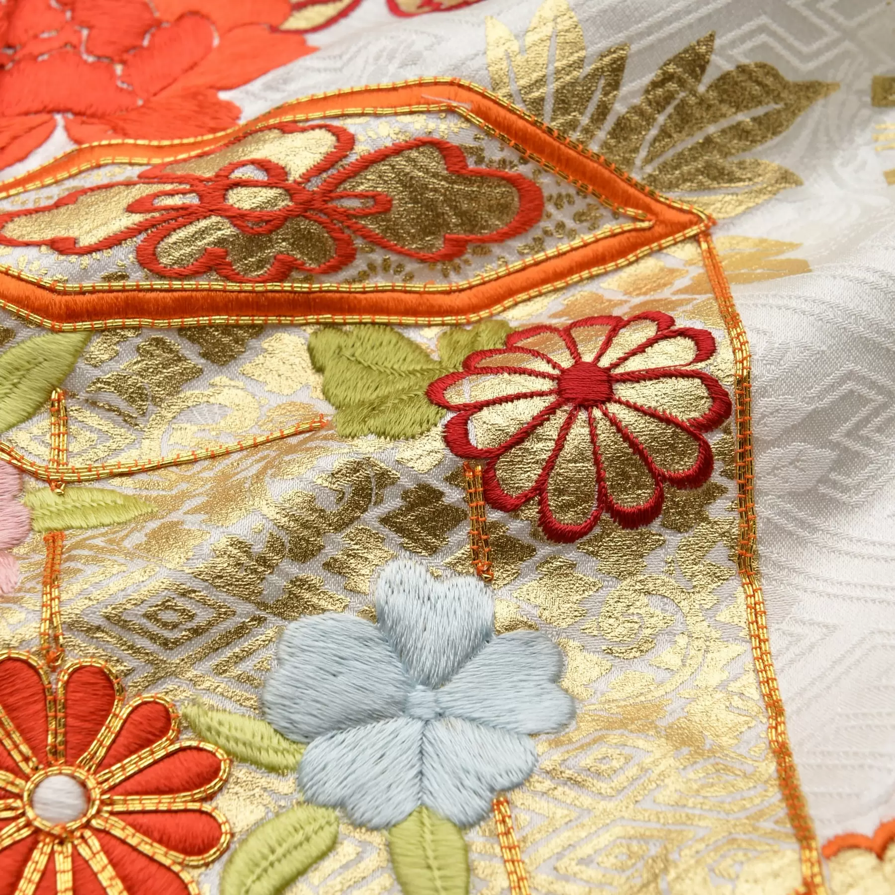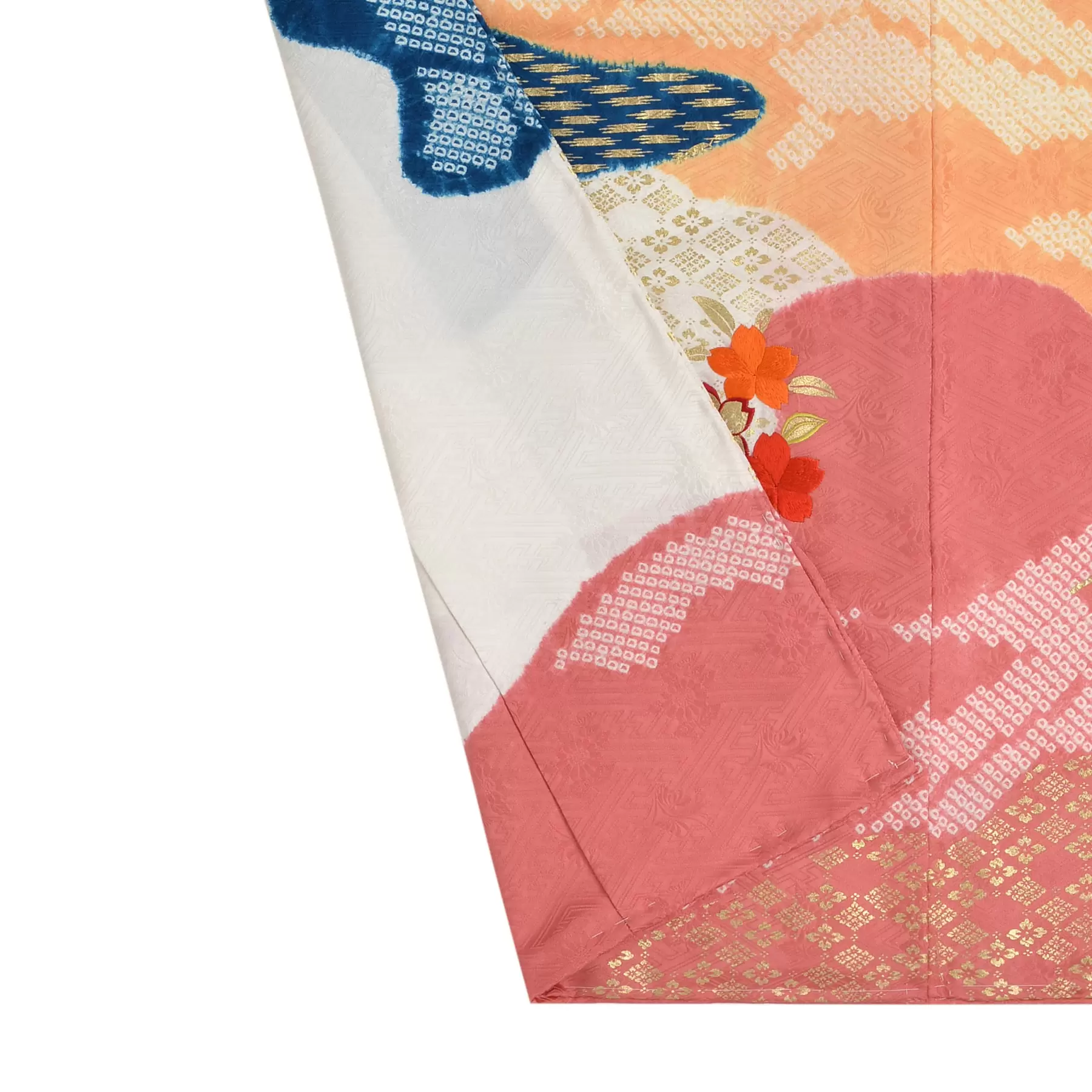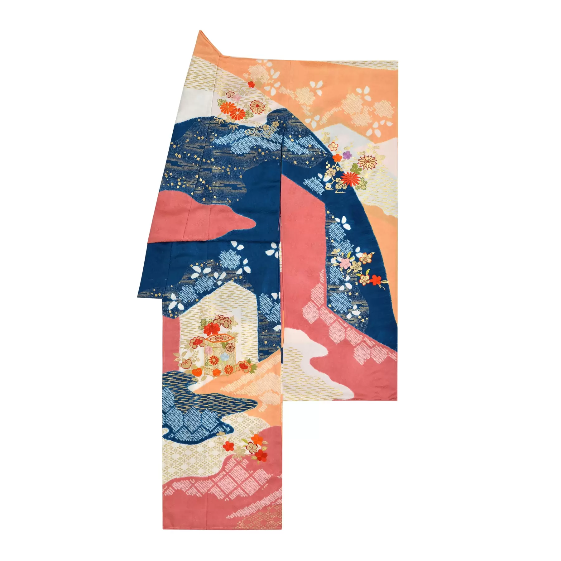 山の稜線、川の流れ、雲のたなびく様などの自然の風景を抽象的に描き出した慶長小袖をベースに、絞りと刺繍の技法で自然の豊かさを描き出した一枚です。多彩な絞りの技法で地色をカラフルに染め上げ、良縁を願う貝桶文様と小花文様で可愛らしさを表現しています。