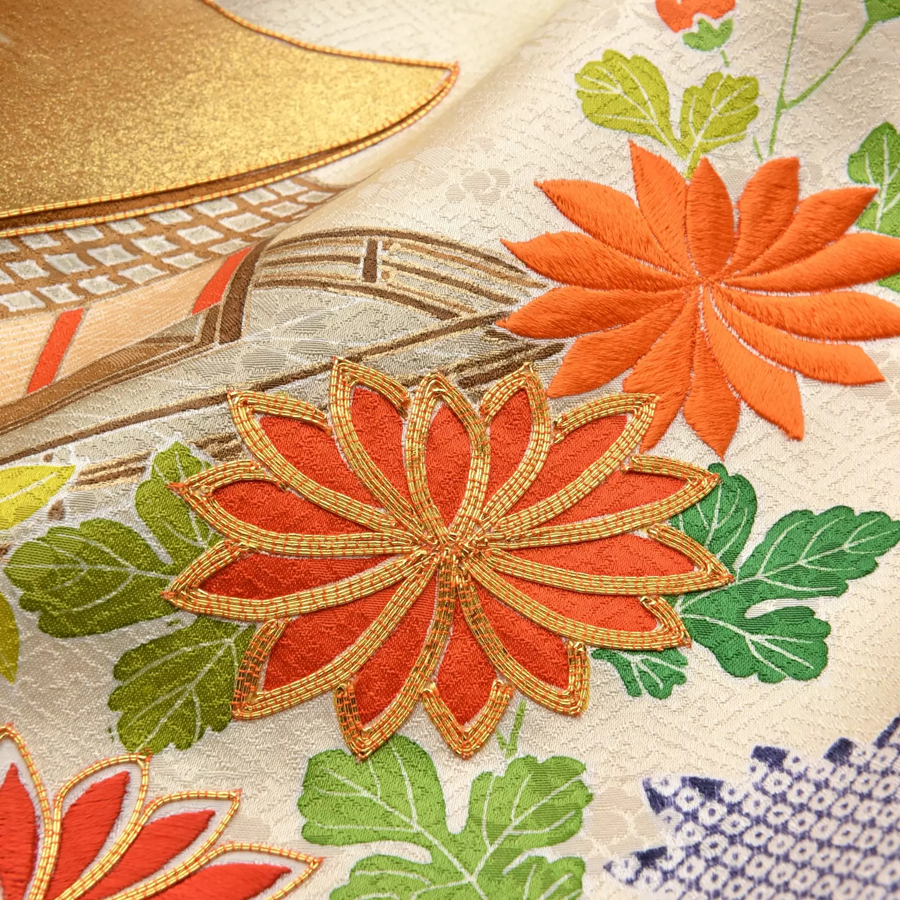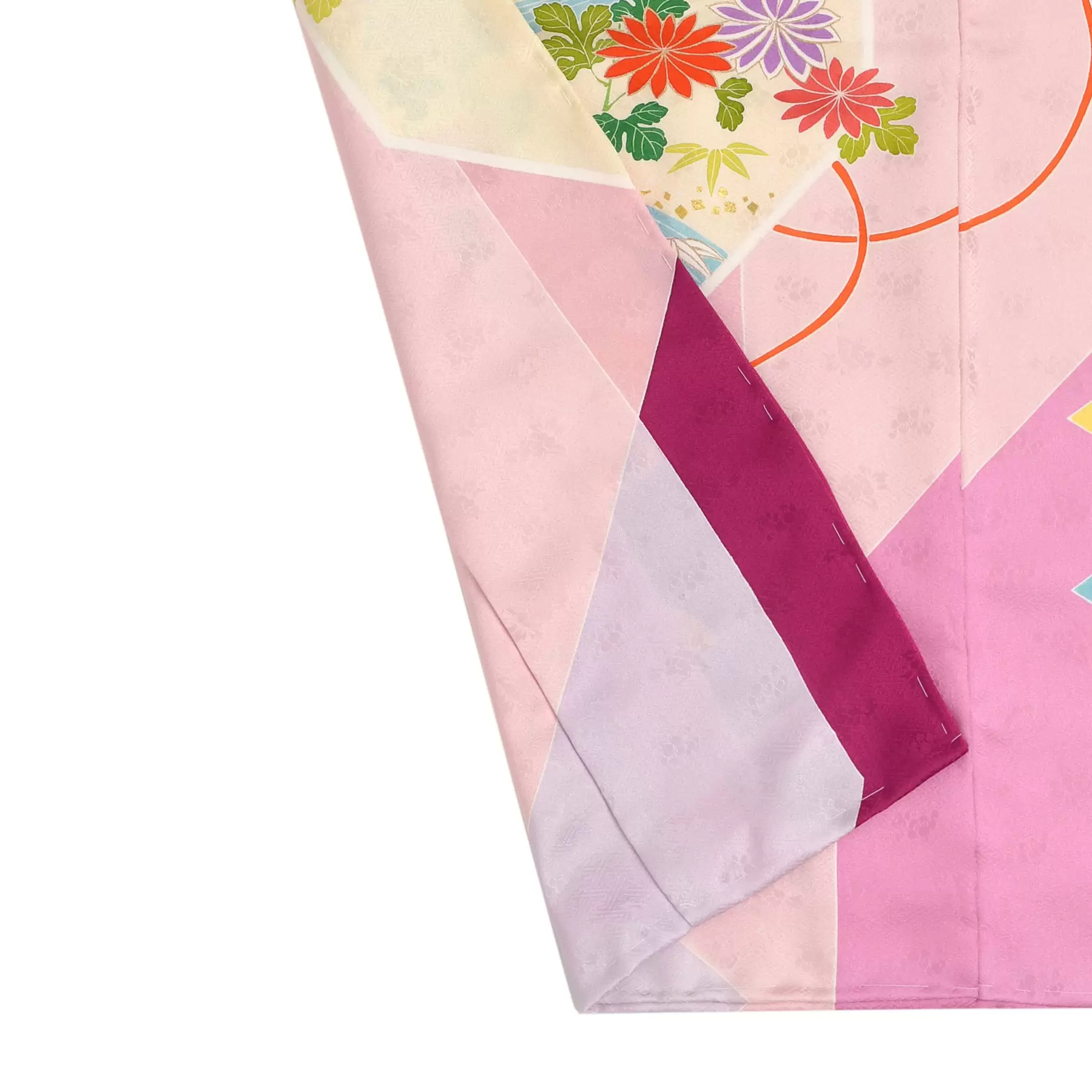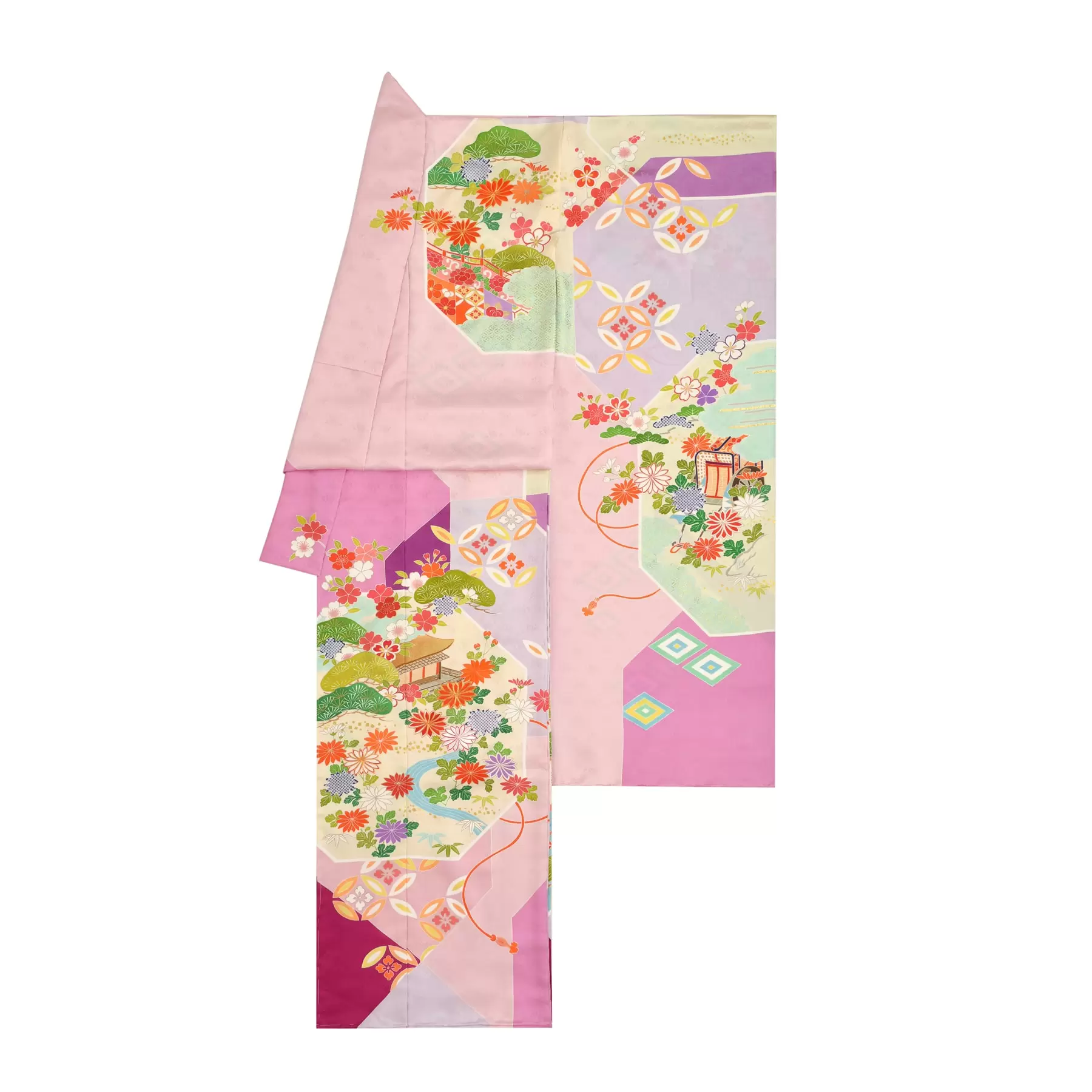 吉祥文様として古くから親しまれている貝桶の柄を真上から見た八角形をモチーフにしています。貝桶の中には平安時代の貴族の生活を忍ばせる雅やかな宮廷風景が広がり、蓋を開けて出てくる夢のような世界は、お嬢様の新しい世界への門出を祝福してくれているようです。繊細に重ねられた色の美しさをお楽しみください。