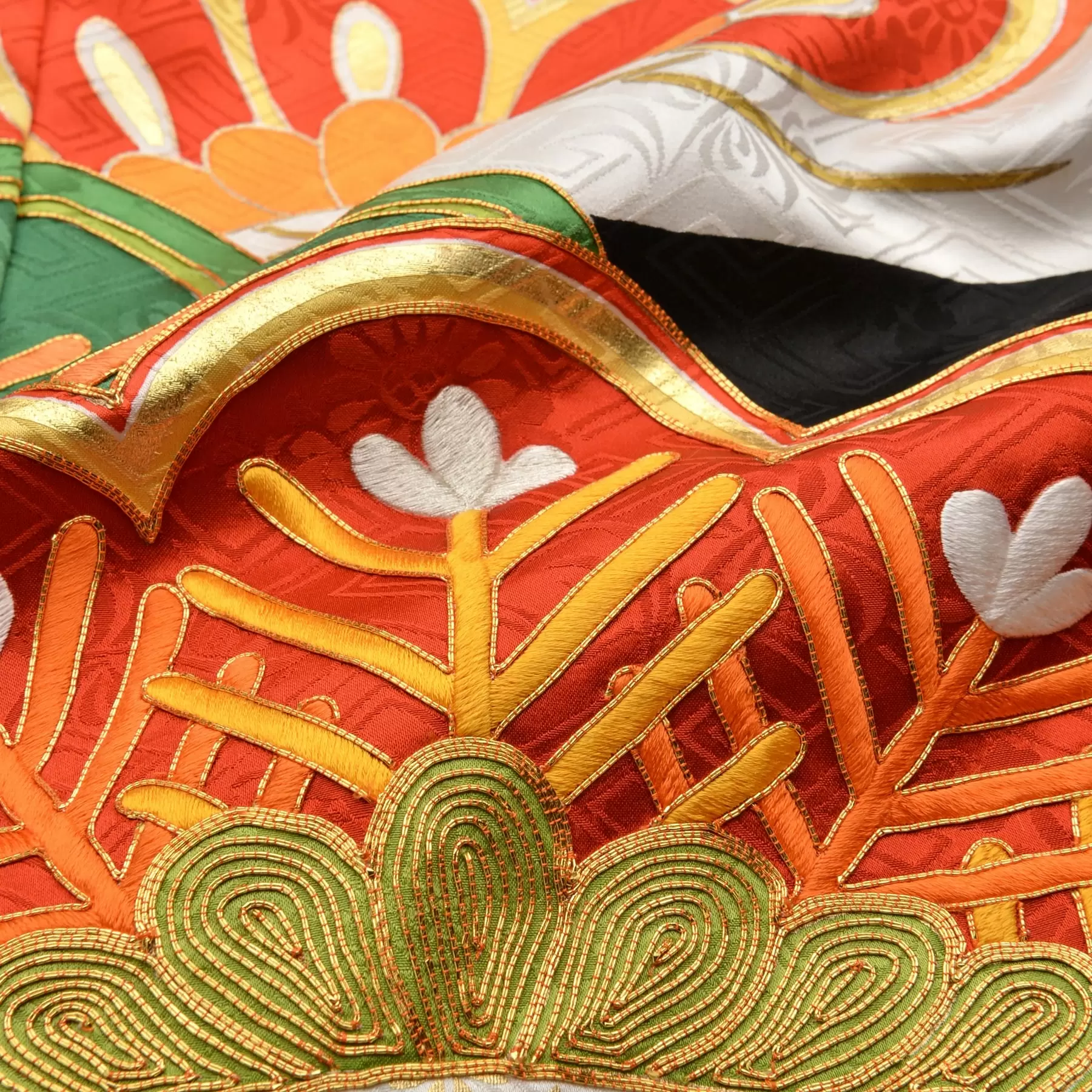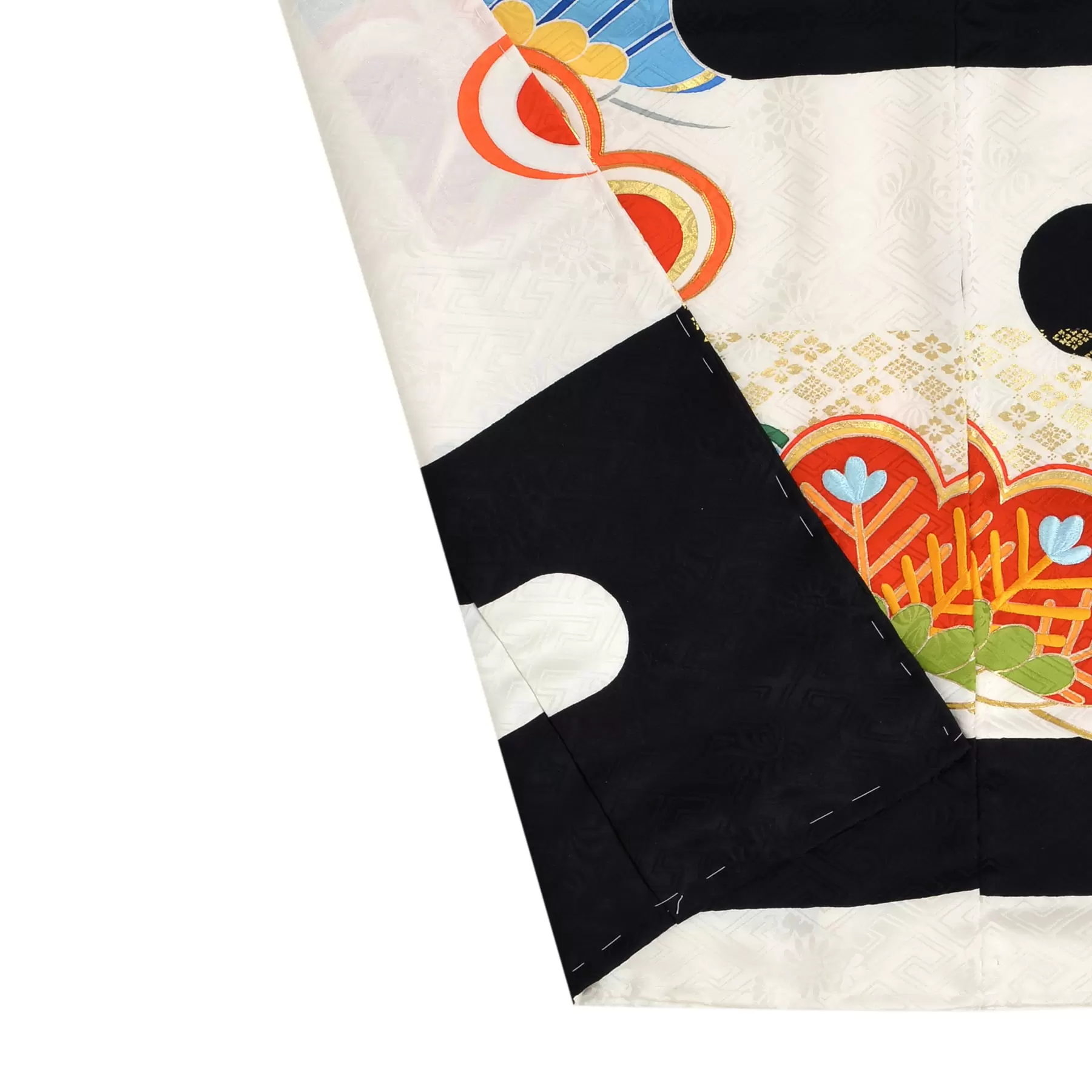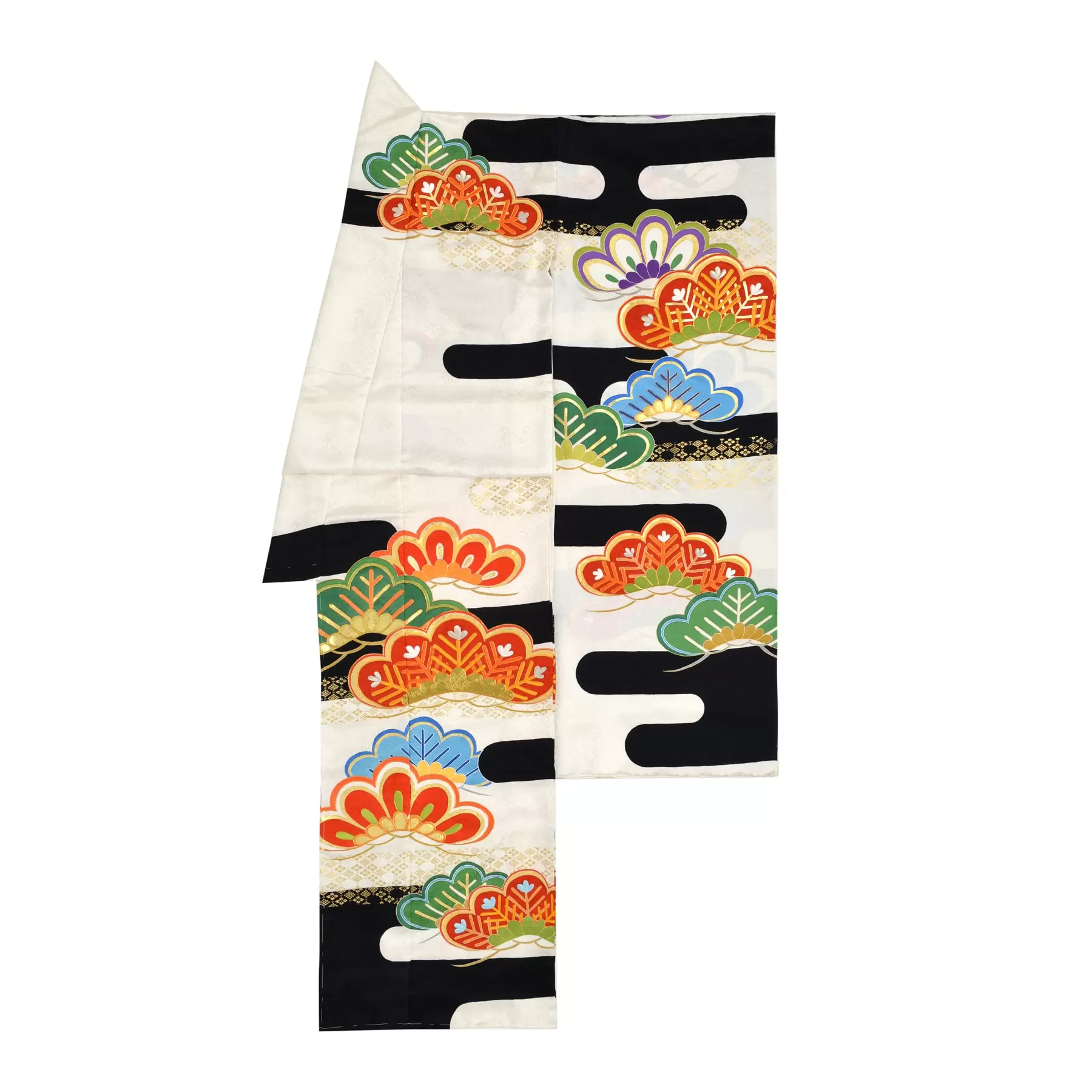 古来から吉祥文様として親しまれてきた松を大胆に表現しました。光沢のある生地とエ霞の白と黒のコントラストの中に、色鮮やかに浮かび上がるカラフルな松の文様。色と構図、それぞれの対比により奥行きのある華やかなデザインになりました。豪華で着映えのする振袖です。