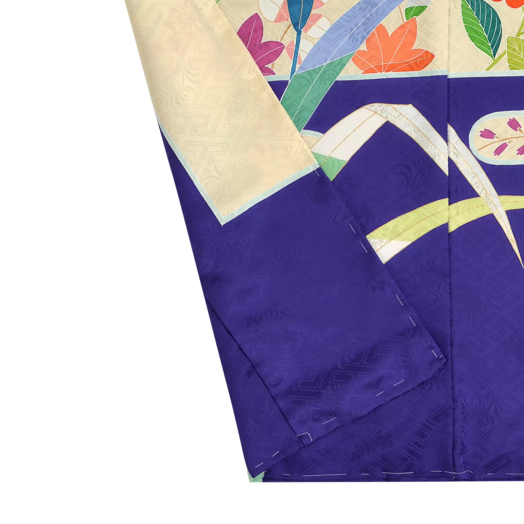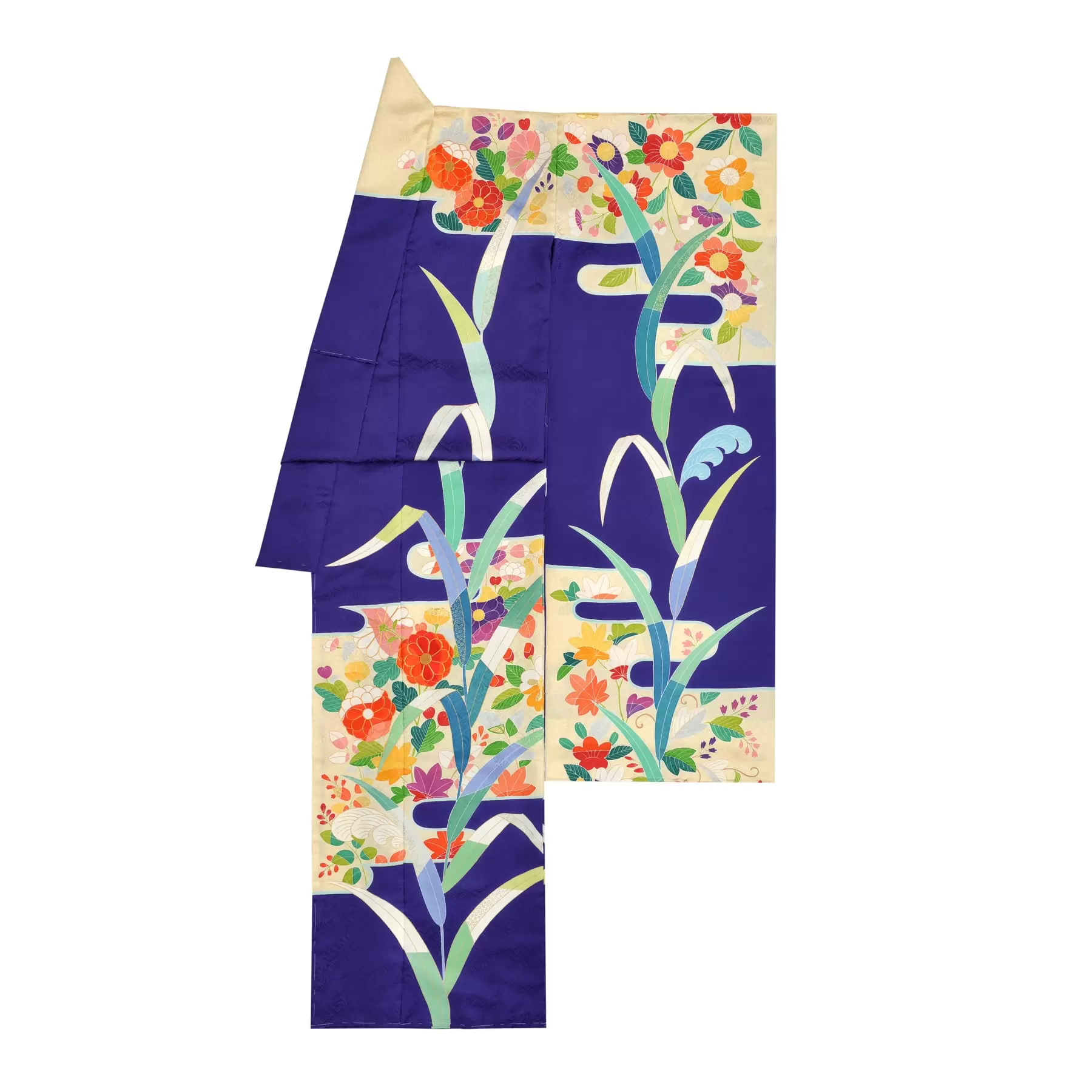 肩と裾に大きく模様を構成するデザインが特徴の桃山時代の小袖を参考にしています。鮮やかな青紫地に浮かび上がる肩と裾の霞の文様の中には、京友禅の技を駆使した色鮮やかな花々が散りばめられとても華やか。縦に伸びるしなやかな芒は、構図に遠近感を与えてくれるととに、着姿をスラリと見せてくれる効果があります。