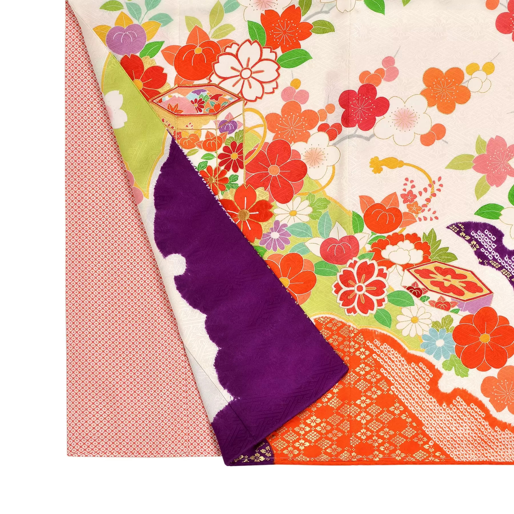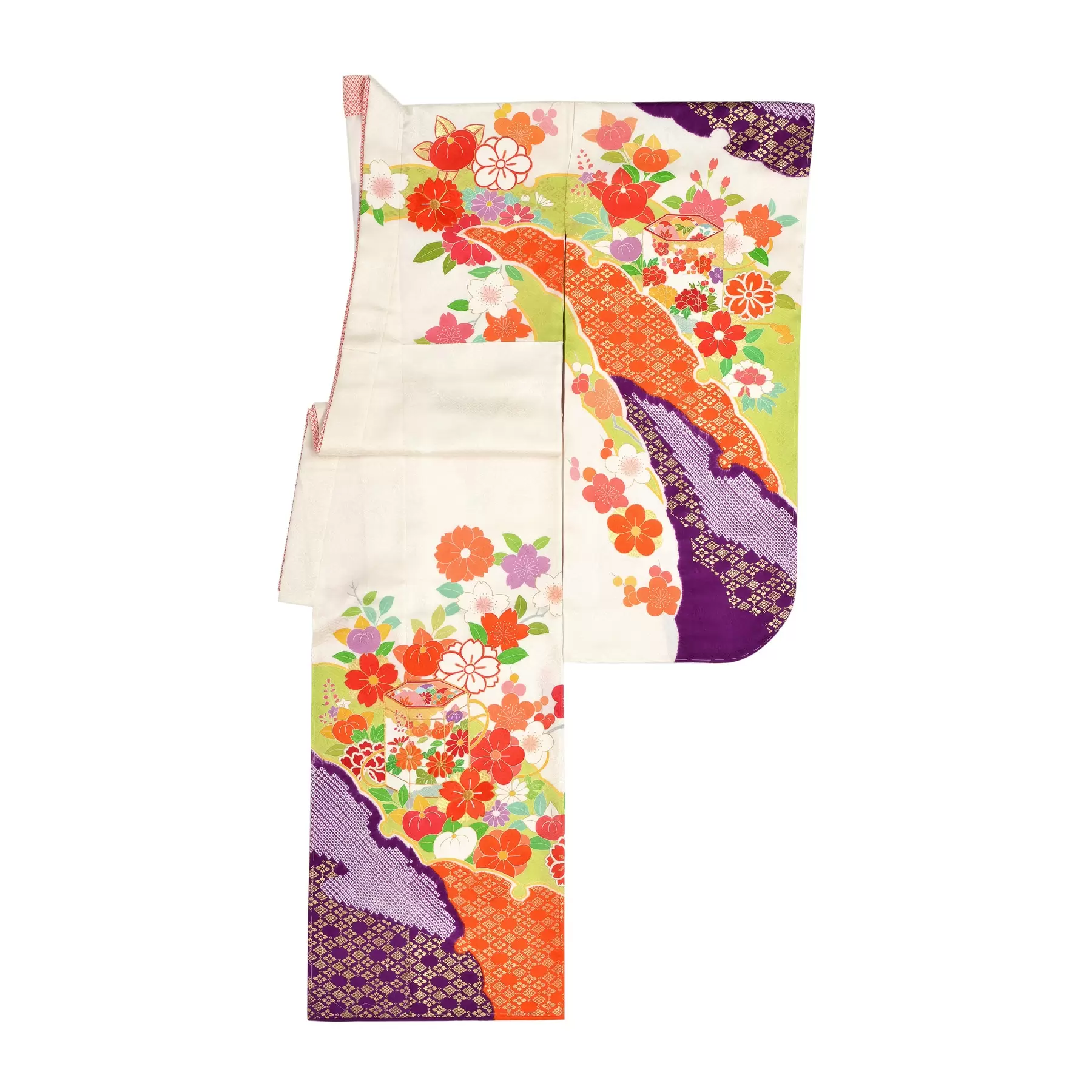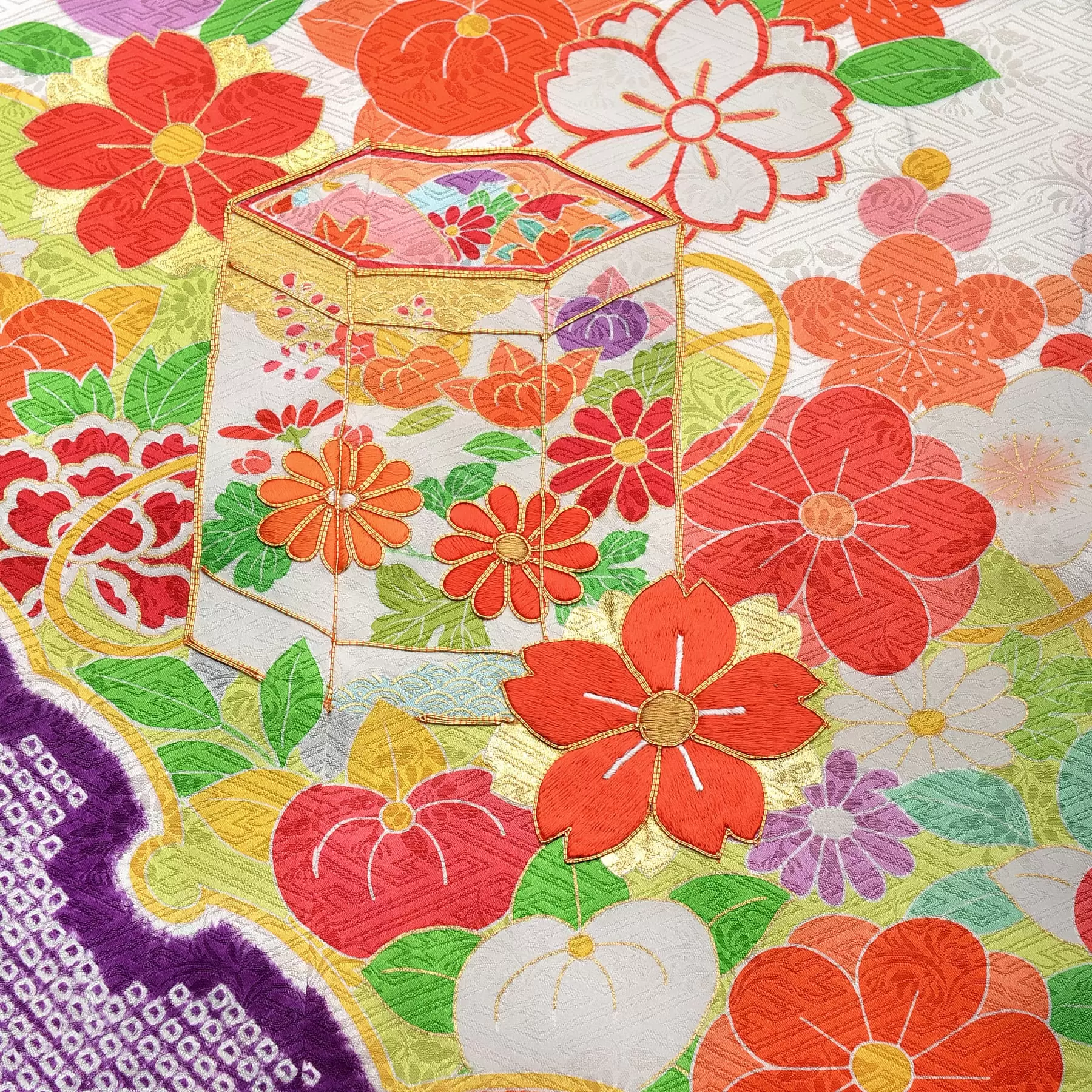 白の地色に浮かび上がる色鮮やかに重なり合う雪輪の向こうに見えるのは、自然の花々が広がる華やかな世界。良縁に恵まれる吉祥文様の貝桶が、これからの成長を見守ってくれています。雪輪に使われている桶出し絞りと小紋箔が華やかさを演出してくれる、重厚感のある一枚です。