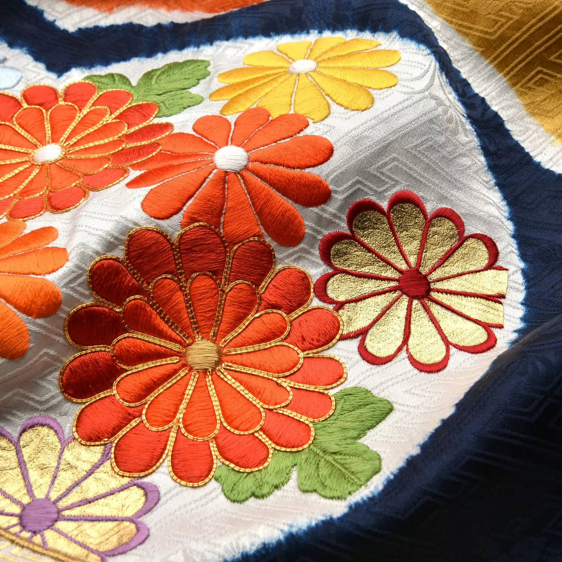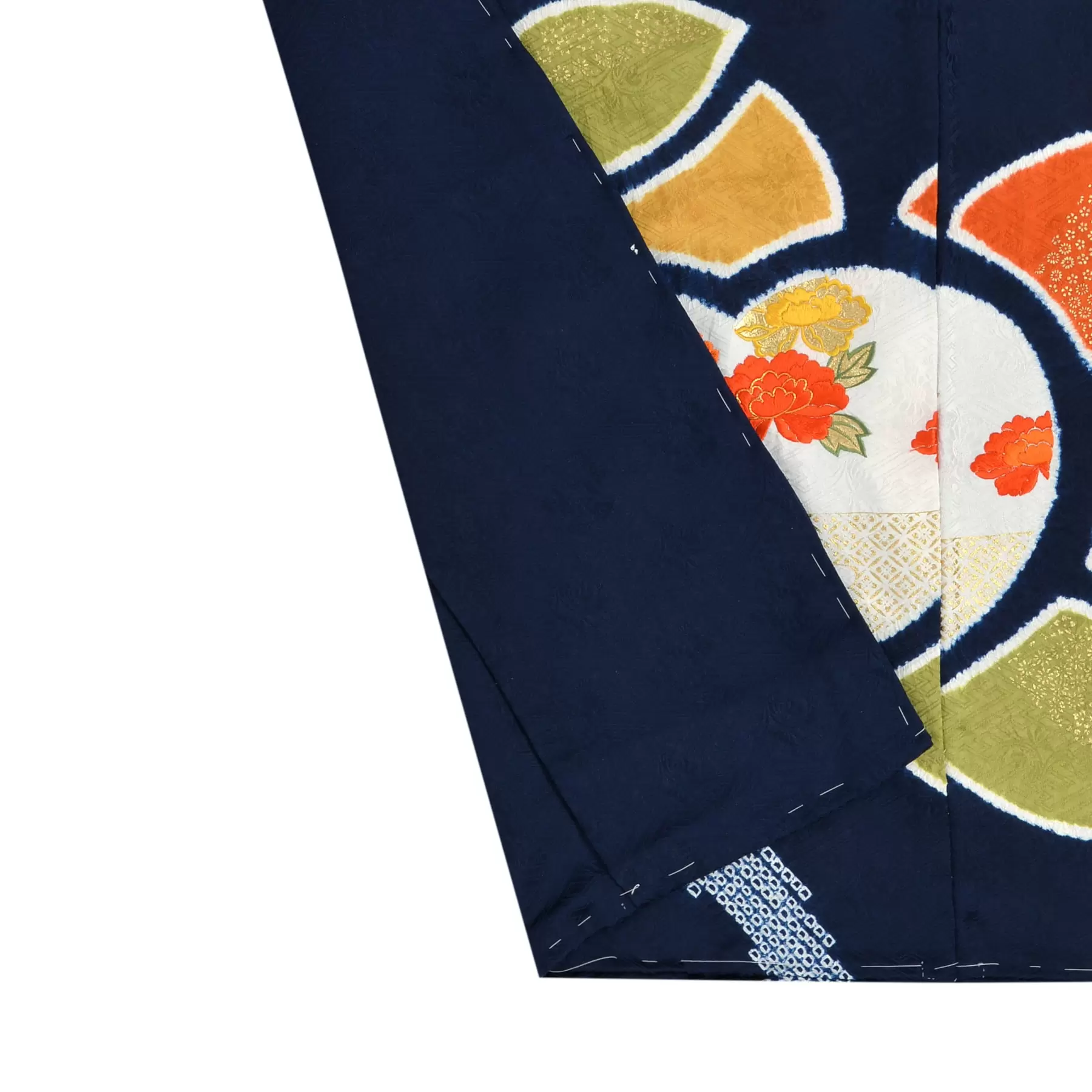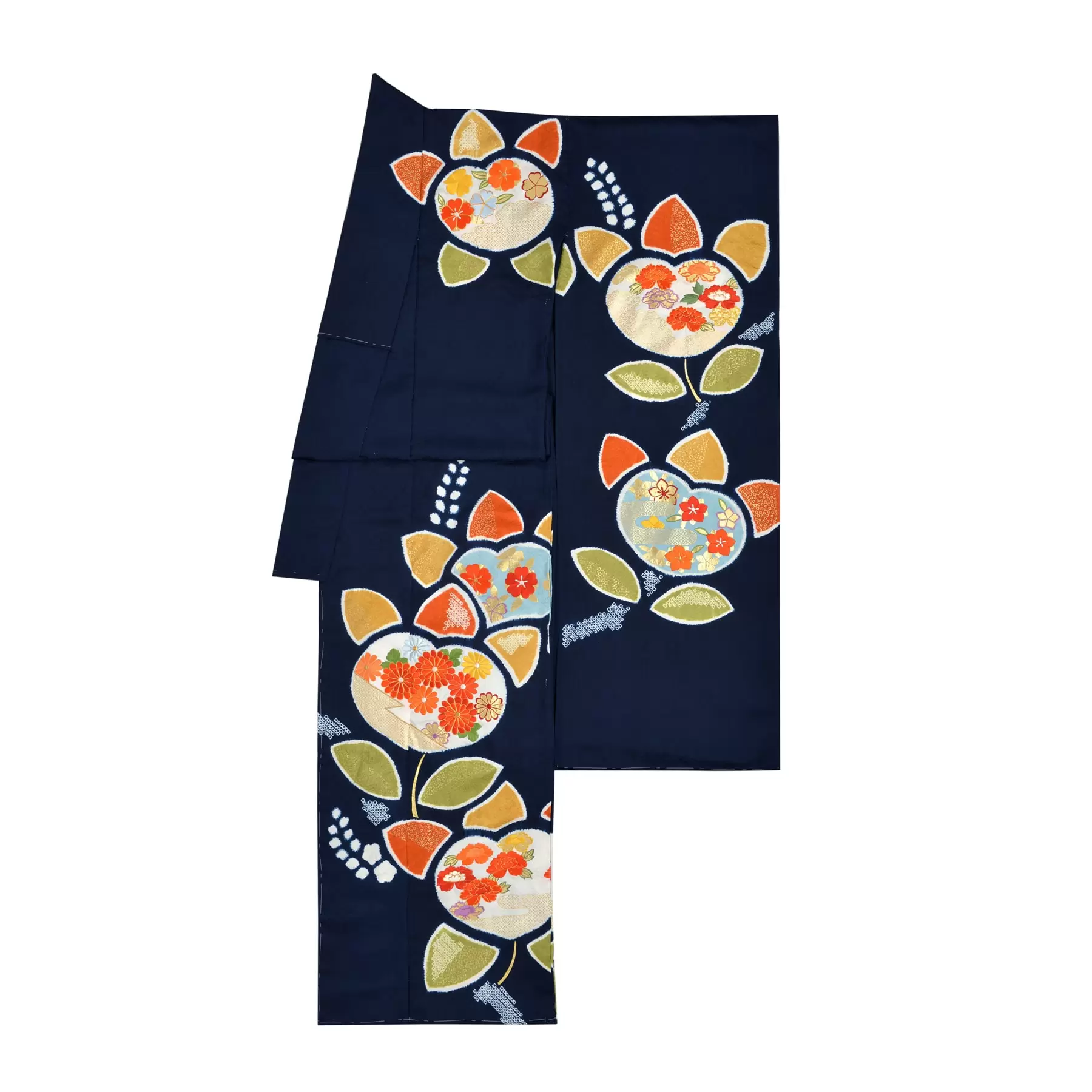千總の紋であり、数少ない日本生まれの吉祥文様である橘を大胆にデザインに用いた振袖です。深い紺の地に、橘の枝や葉の一部を疋田絞り、花は帽子絞り、実は4色の桶出し絞りを使い、カラフルに可愛い色遣いで染め上げました。永遠の繁栄や長寿の象徴である橘と可憐な草花の組み合わせをお楽しみください。