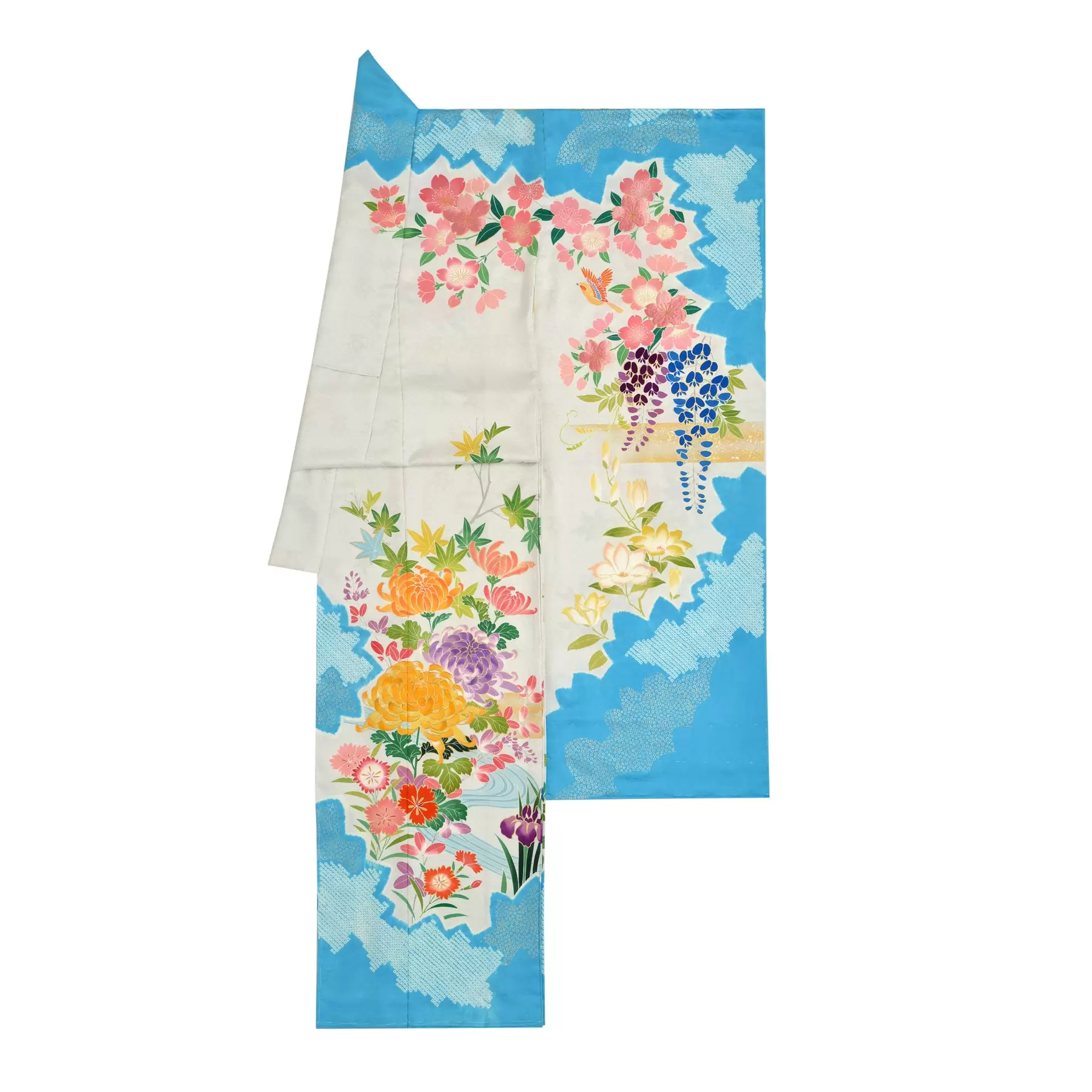 木々のシルエットの向こうに、可憐に咲き誇る四季の花々と鳥のさえずりが聞こえてきそうな幸福な楽園の森を描きました。薄いグレーの地のキャンパスに、日本画を思わせる写実的な草花が映え、瑞々しい若さと大人の女性の華麗さを感じる華やかな振袖です。
