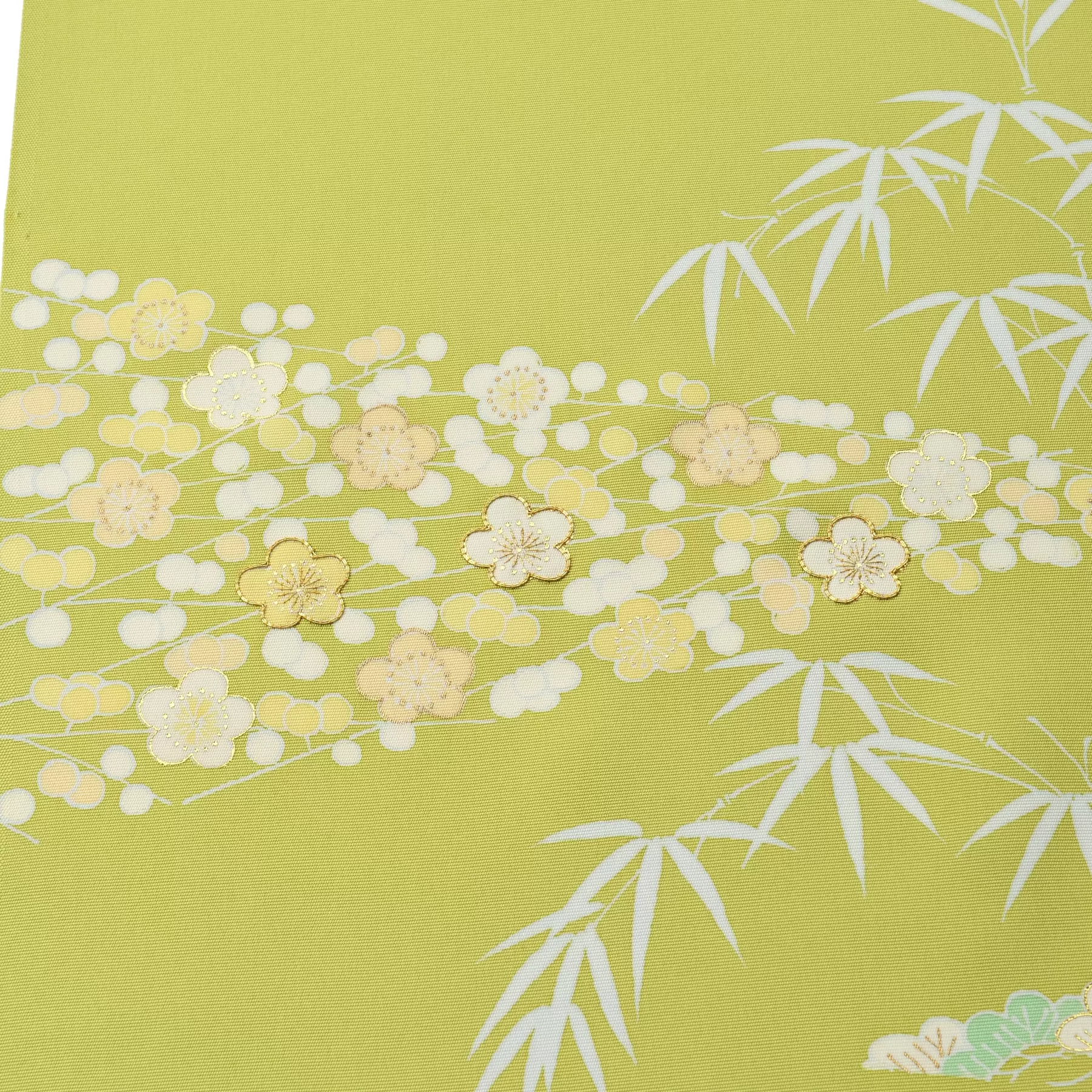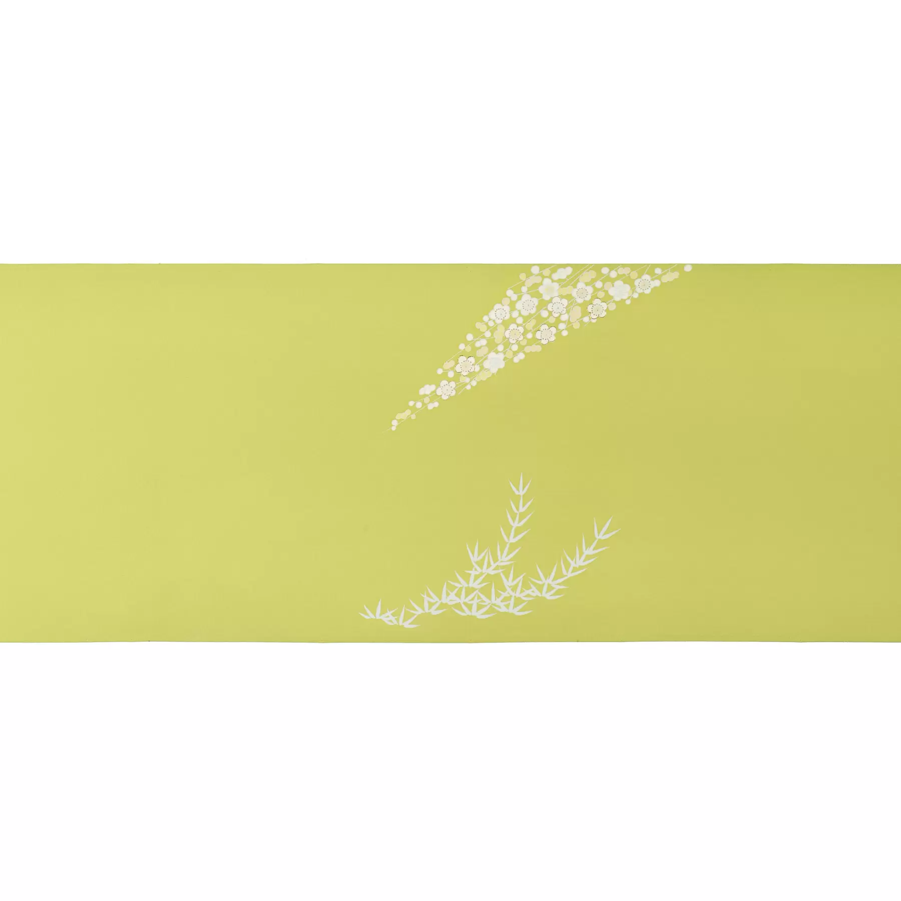 千總の所蔵する江戸時代に作られた打敷(仏壇に飾る荘厳具の一種)「松竹梅鶴亀文様」の直線と曲線が有機的に絡む特徴的なデザインをベースにして作りました。三角形の梅と松が対角に重なりあう中を、しなやかな竹が貫いている面白い構図の松竹梅です。