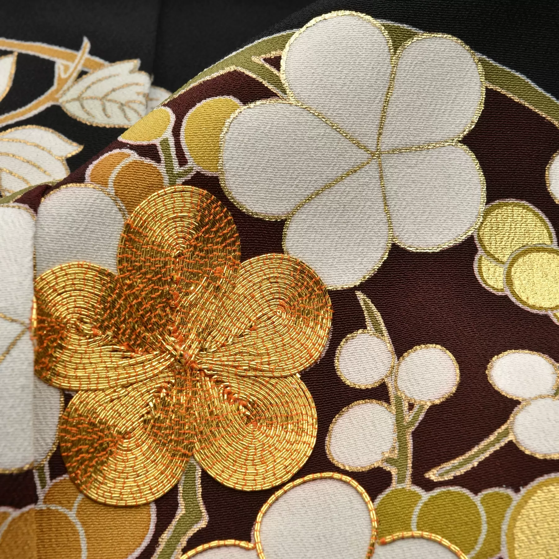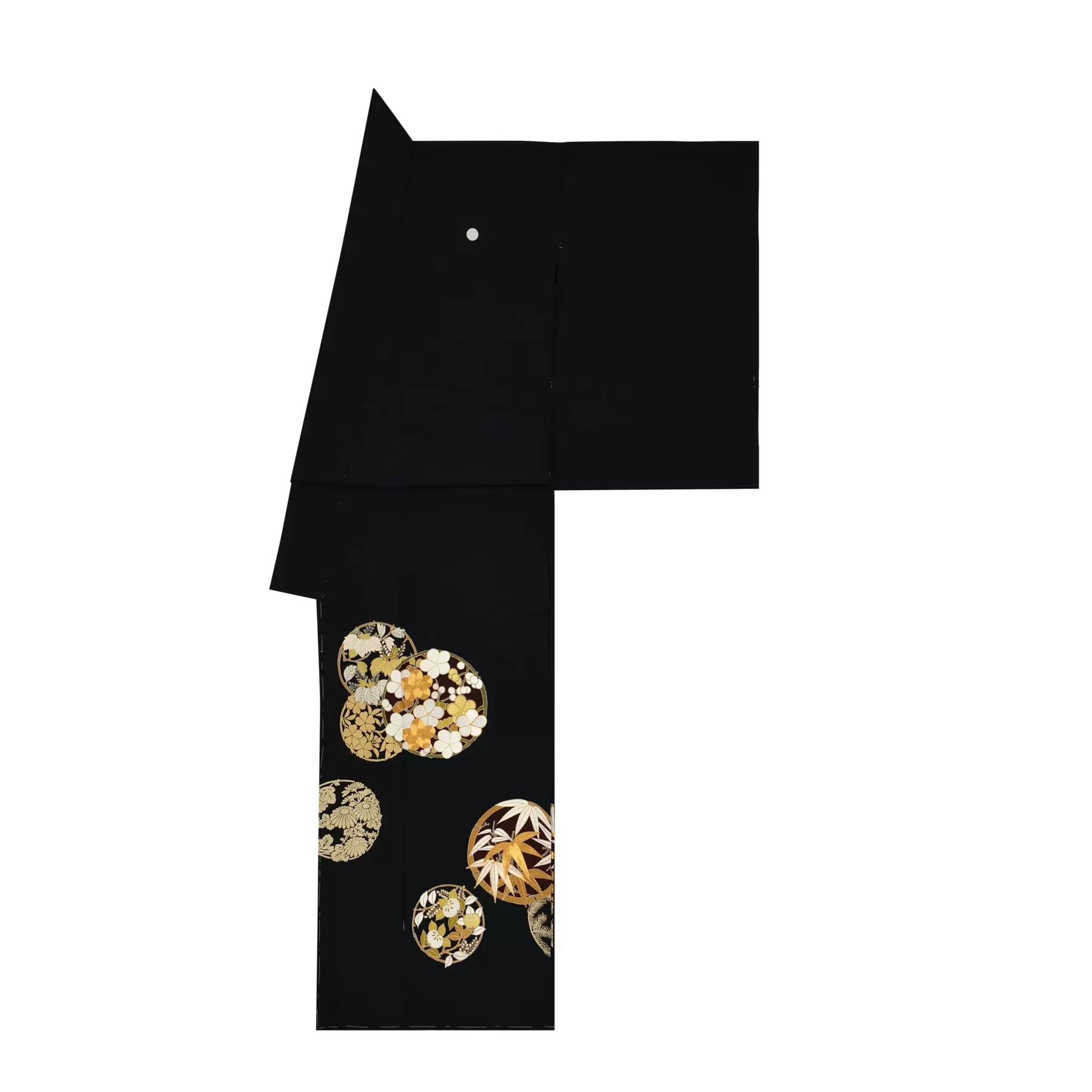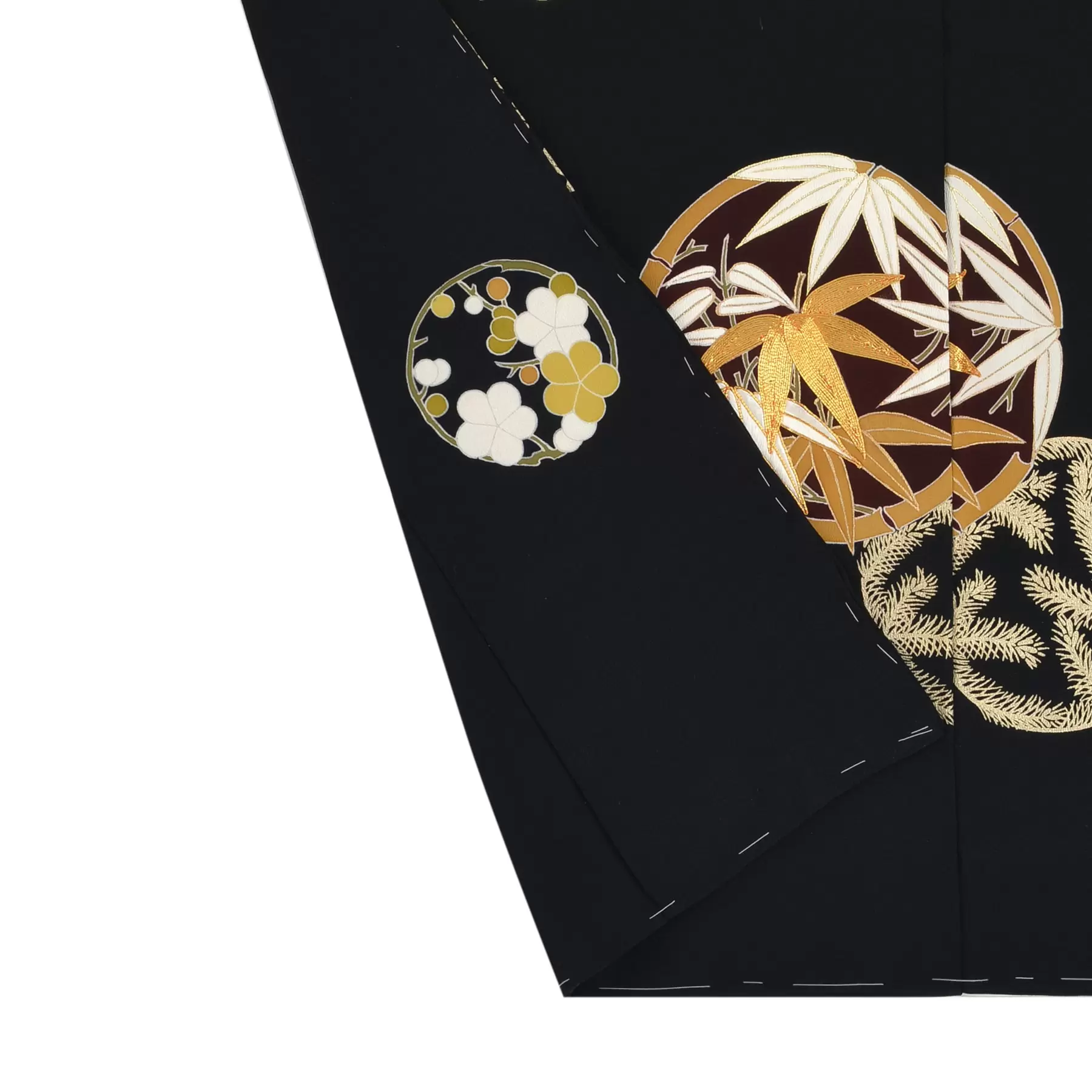 松竹梅、橘、草花を丸く形づくる花の丸文様でデザインしました。一つ一つの花の丸を、重ねたり大小を組み合わせたりしながらリズムが出るように配置し、全体がより綺麗に映えるようにと、文様と文様の空間の構成にもこだわりました。豪華さともにすっきりとした粋な雰囲気を感じさせる黒留袖です。