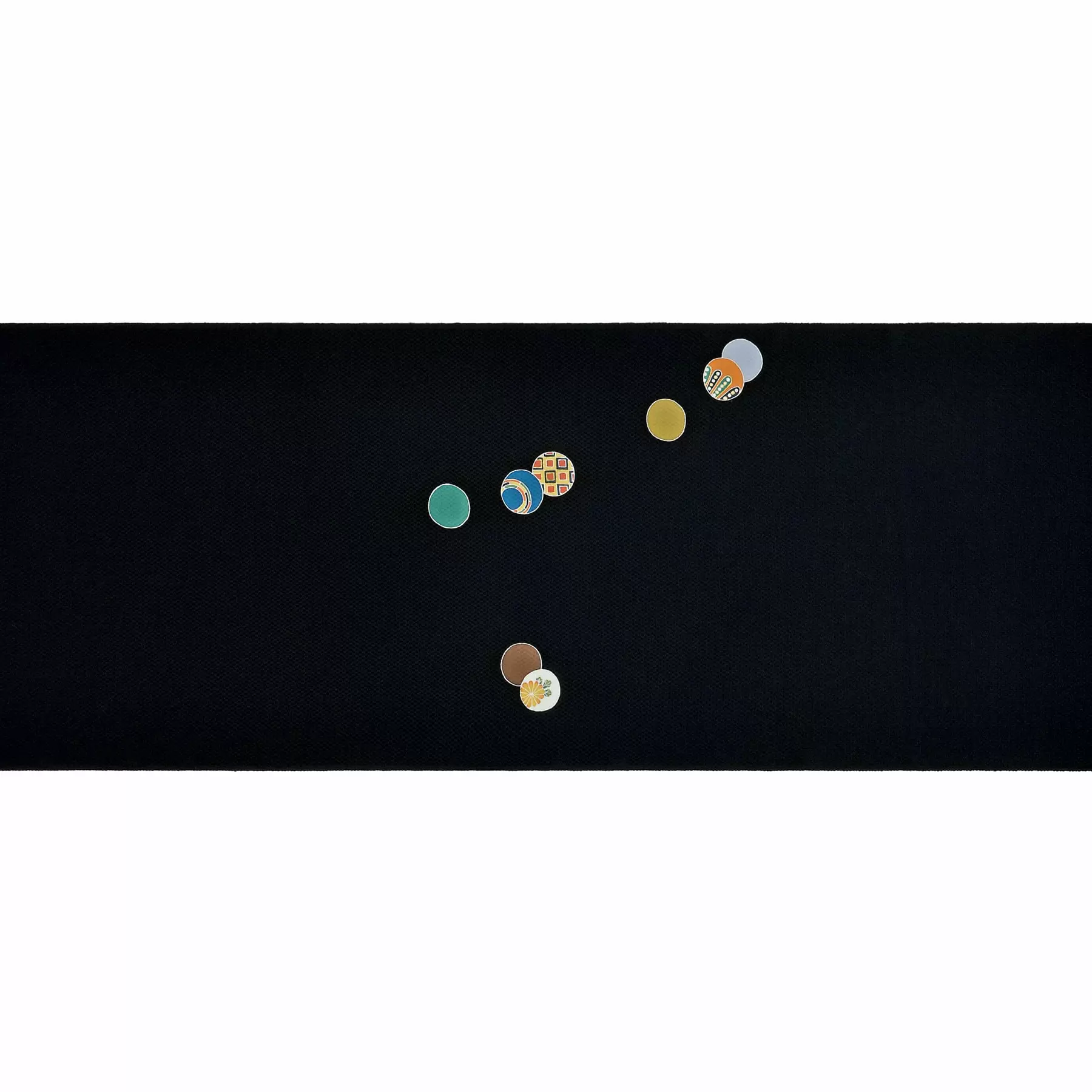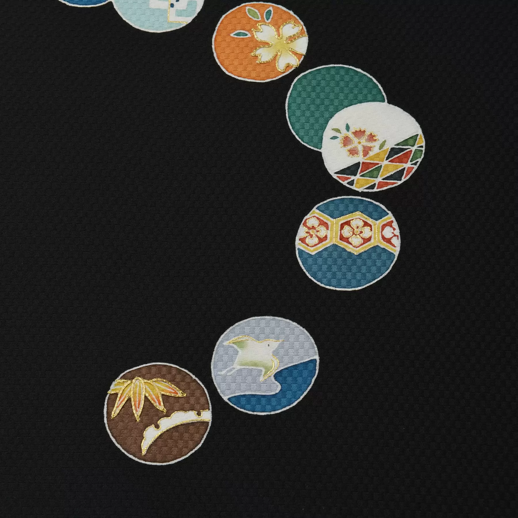 シャープな黒の地色の上を踊る色取り取りの小さな丸が可愛らしい、コーディネートがしやすい染め帯です。