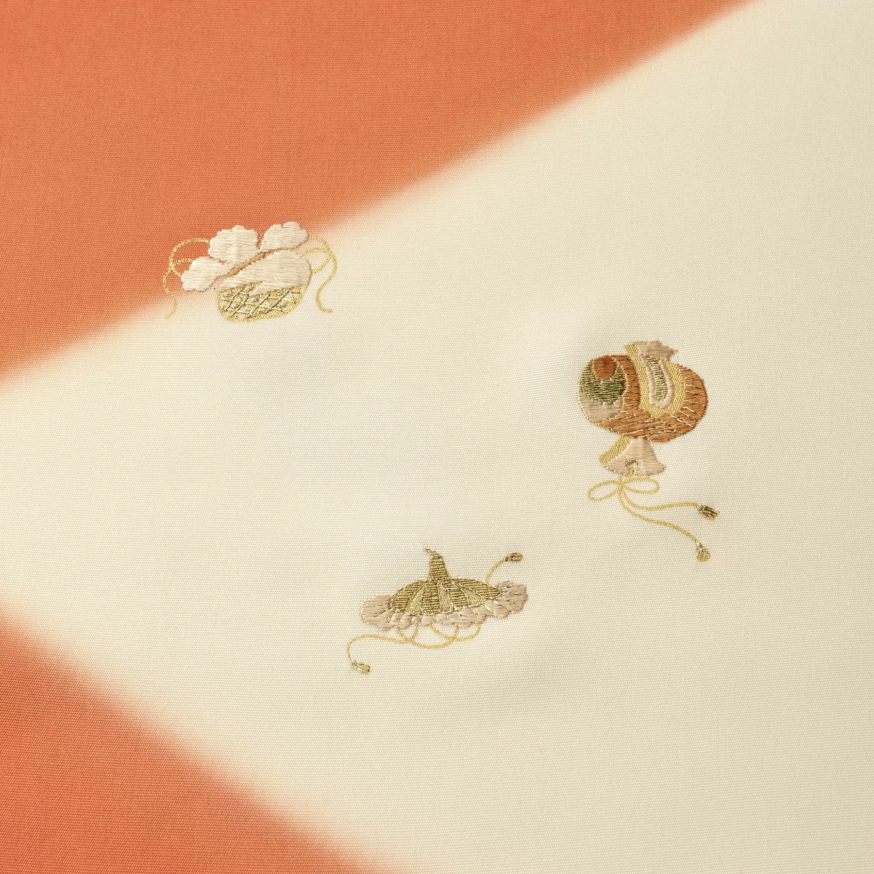 暈しで表現された大きな方勝、金と色糸を組み合わせ濃淡の変化を付けて繊細に手刺繍で描かれた打ち出の小槌や巾着。捻りを効かせた遊びゴコロのある宝尽くしのデザインです。