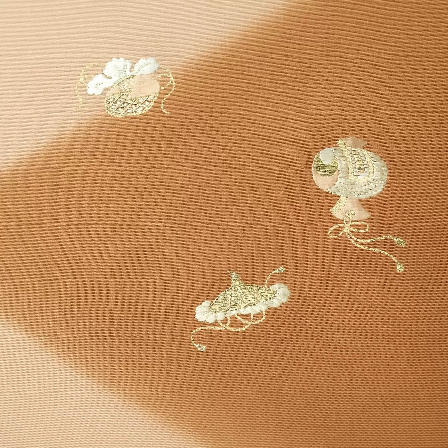 暈しで表現された大きな方勝、金と色糸を組み合わせ濃淡の変化を付けて繊細に手刺繍で描かれた打ち出の小槌や巾着。捻りを効かせた遊びゴコロのある宝尽くしのデザインです。