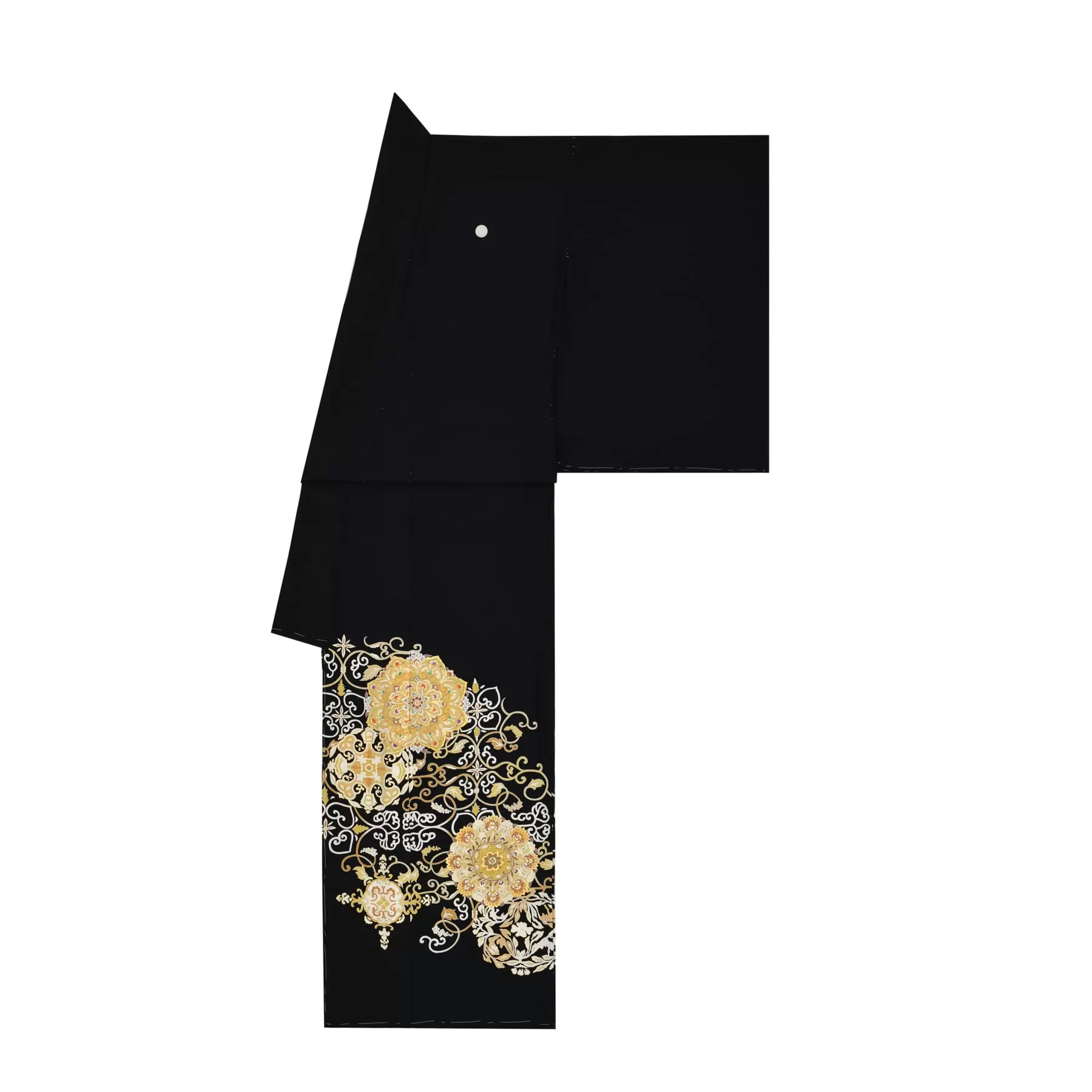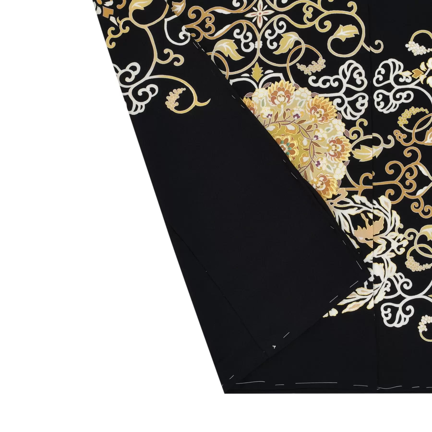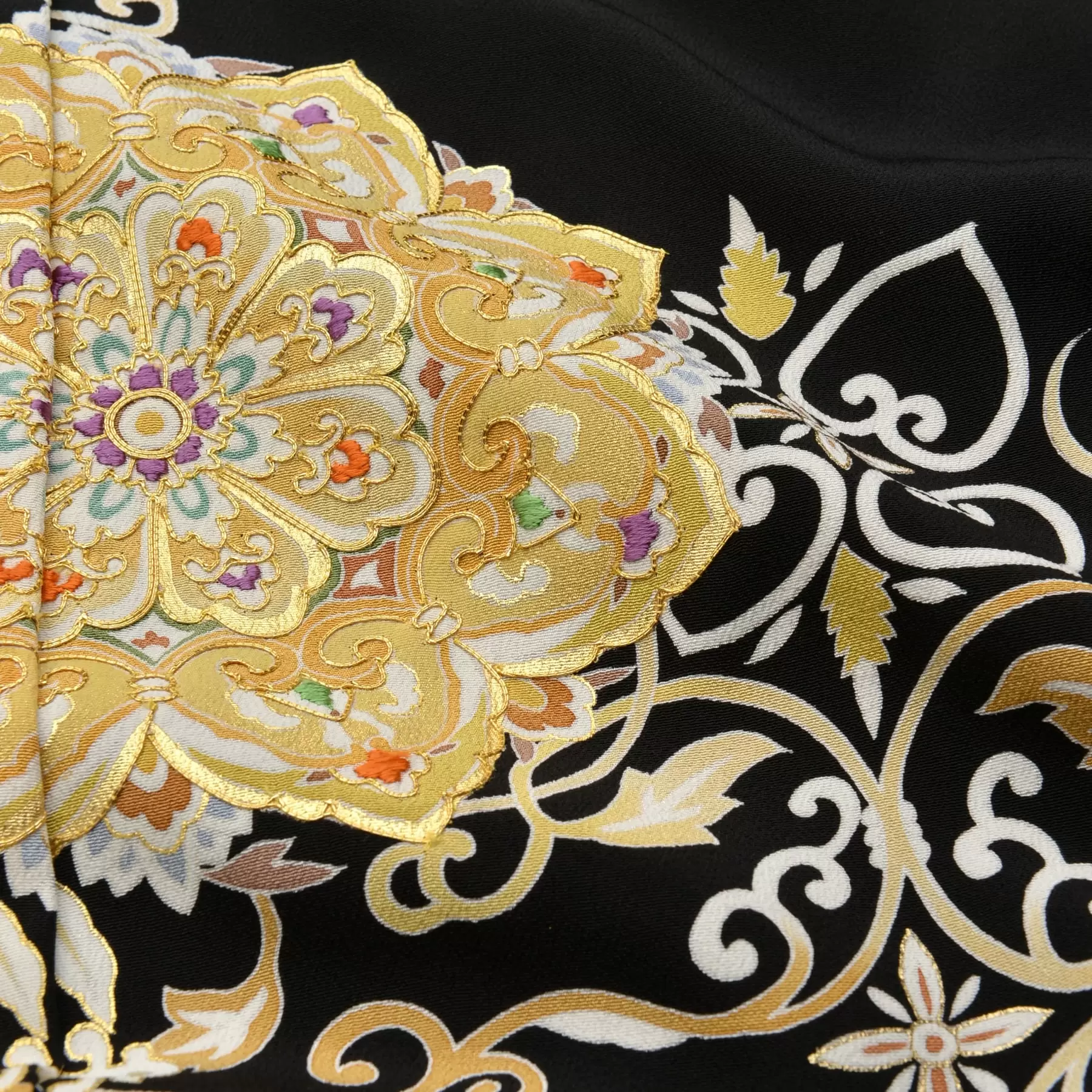 奈良時代に大陸より渡来した葡萄唐草文様と華紋柄を合わせデザインしました。京友禅の多彩な技法を使い繊細に表現された葡萄唐草文様と、金彩と刺繍で豪華に加飾した華紋柄の対比が美しく、エレガントな雰囲気を醸し出しています。