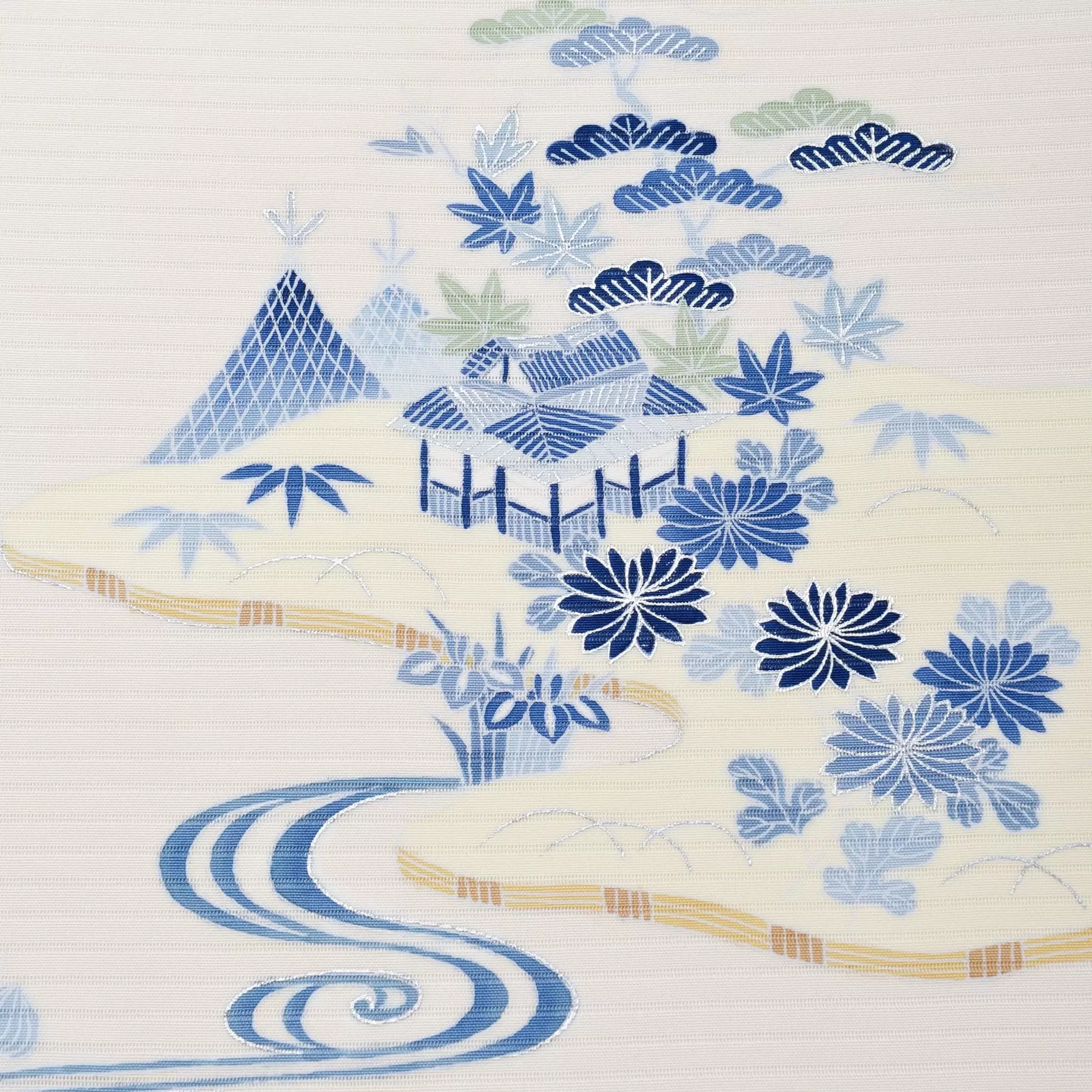 水辺の風景を細かな文様で表した茶屋辻文様は、もともとは夏の正装である麻の着物に藍一色で描かれていました。江戸時代のままの茶屋辻の雰囲気を伝える藍の濃淡と、余白の調和が美しく、軽やかな印象の夏の染め帯に仕上がりました。