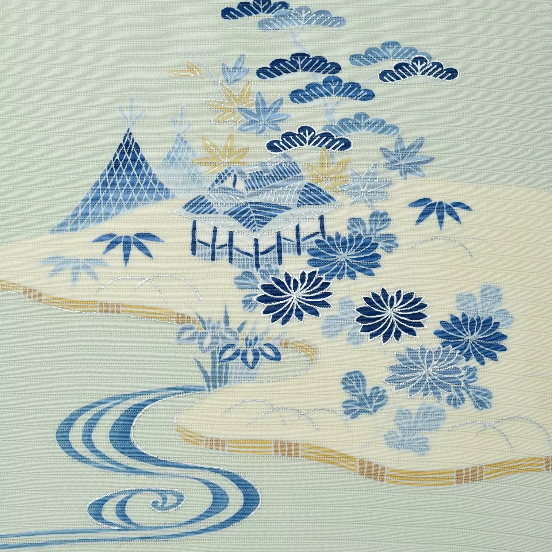 水辺の風景を細かな文様で表した茶屋辻文様は、もともとは夏の正装である麻の着物に藍一色で描かれていました。江戸時代のままの茶屋辻の雰囲気を伝える藍の濃淡と、余白の調和が美しく、軽やかな印象の夏の染め帯に仕上がりました。