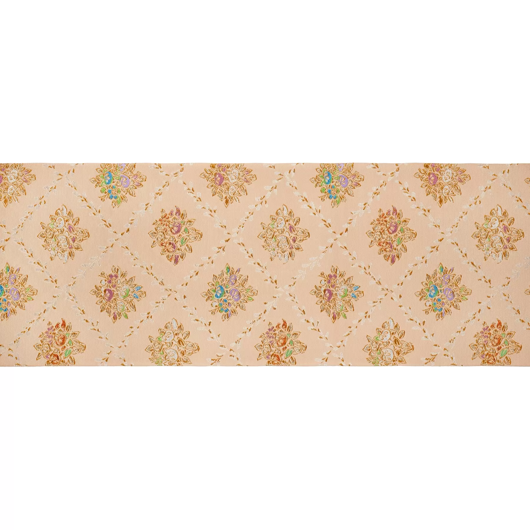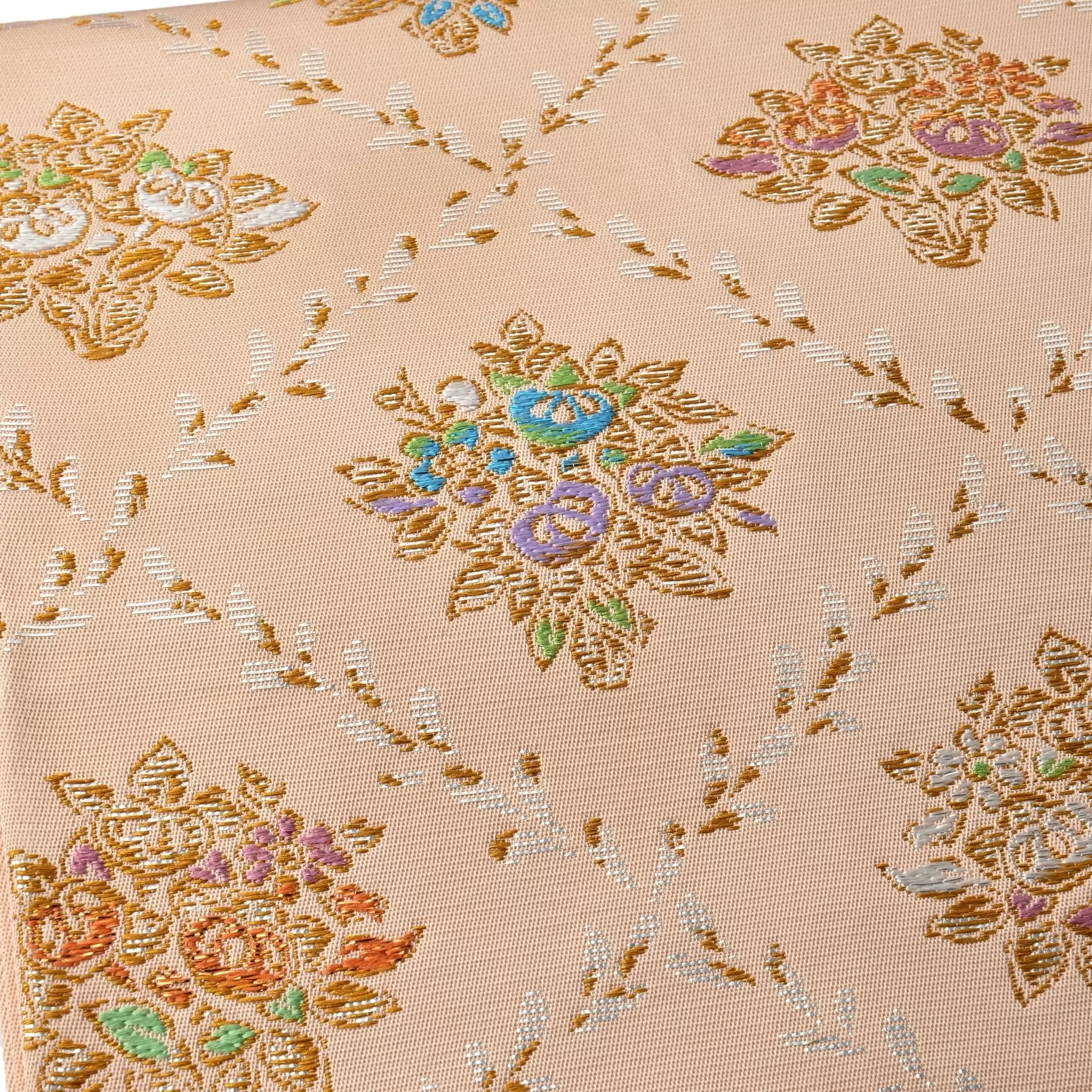 宮大工であった千總の遠祖が春日大社に納めていた威儀物の「千切台」を元にデザインしました。葉をつなげた斜めの格子の中心に浮き上がるのは橘、梅、菊の花飾り。織物でありながら柔らかい筆のタッチが感じられるように工夫しました。金箔糸を撚って作った鮮やかな色糸が、煌めきを与えてくれる華やかな袋帯です。