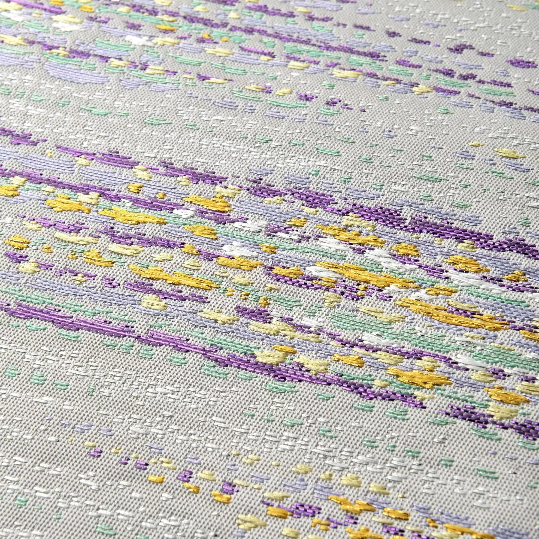 空を美しいグラデーションで染める霞のイメージでデザインしました。紫とグレーの基調色に様々な色を織り交ぜ、ふっくらした立体感が出る畔織や滑らかで光沢感の出る朱子織を併用し、ふわっとした幻想的な袋帯に仕上げました。