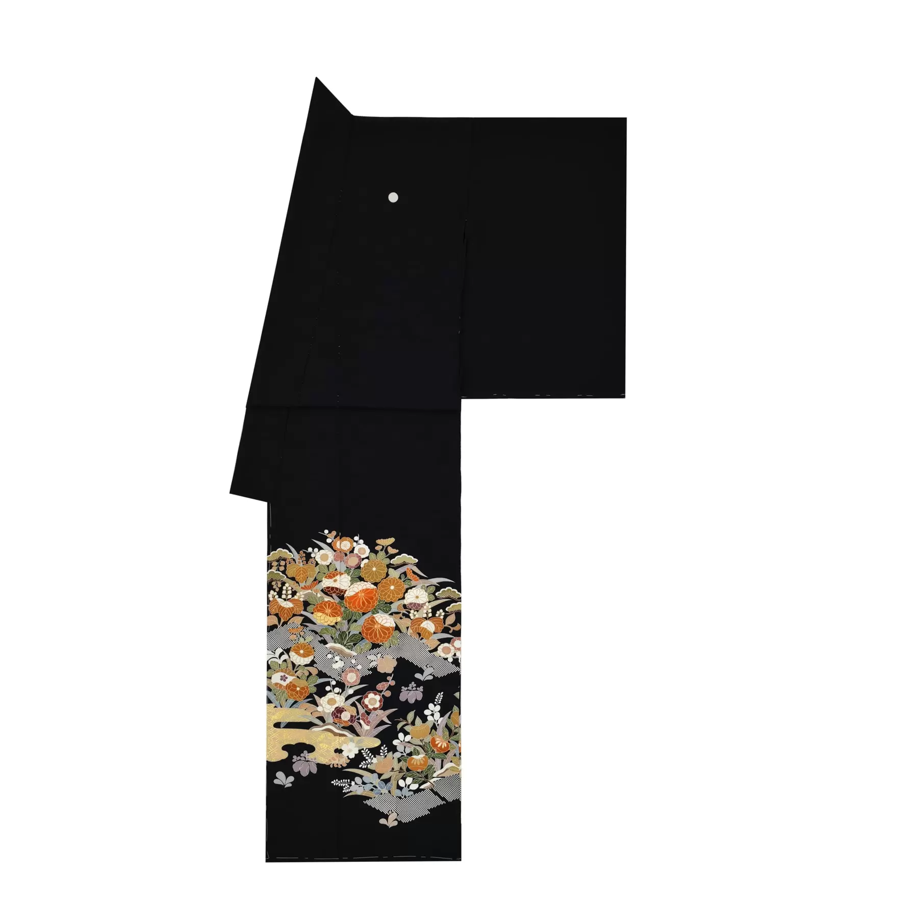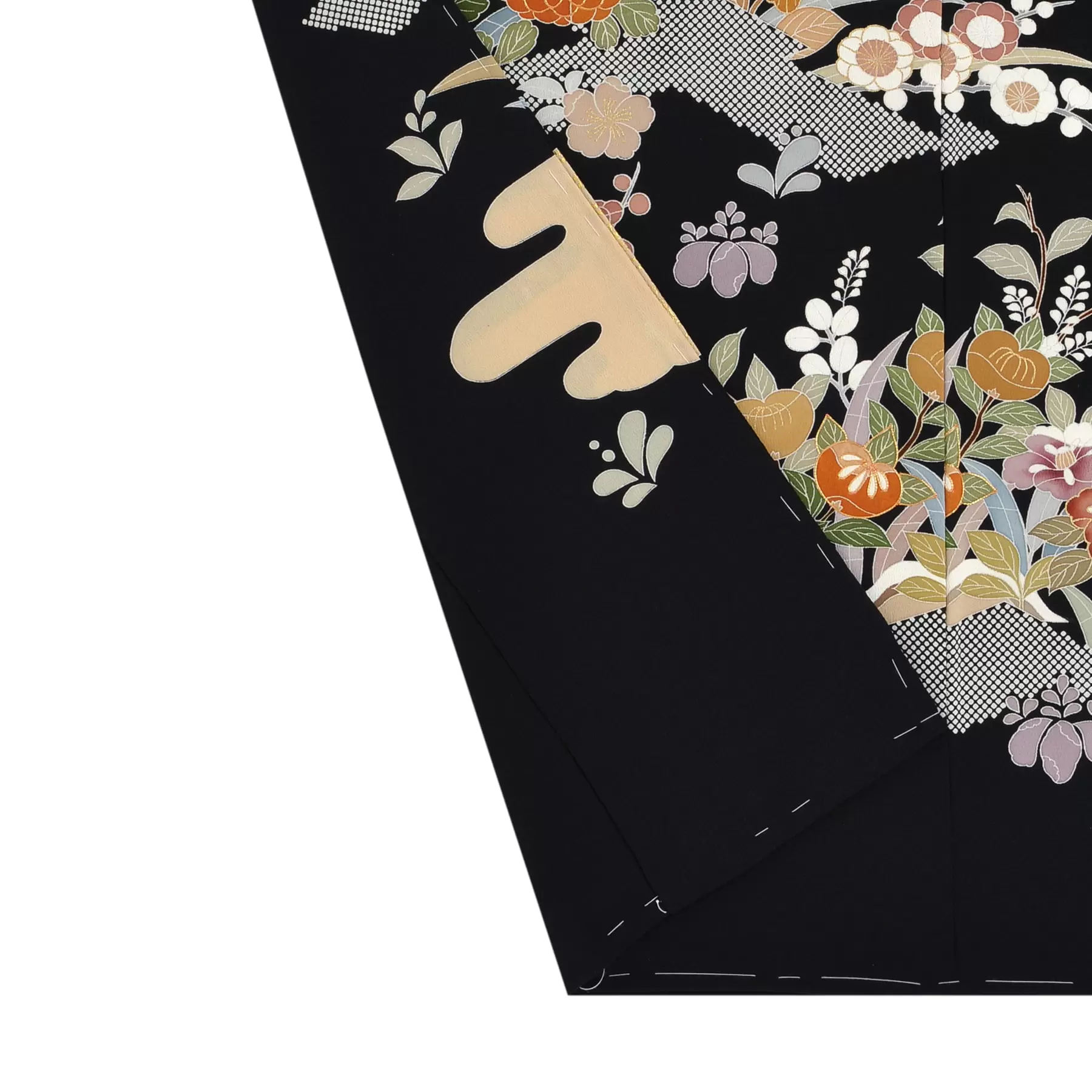一つのモチーフの中に多彩な表現を使い、豪華さと優雅さを表現した桃山時代の衣裳を参考にデザインしました。小振りの草花を裾全体に組み合わせ輪郭線を残す、京友禅らしい手仕事の美しさが映えています。上質な品格が漂う一枚です。