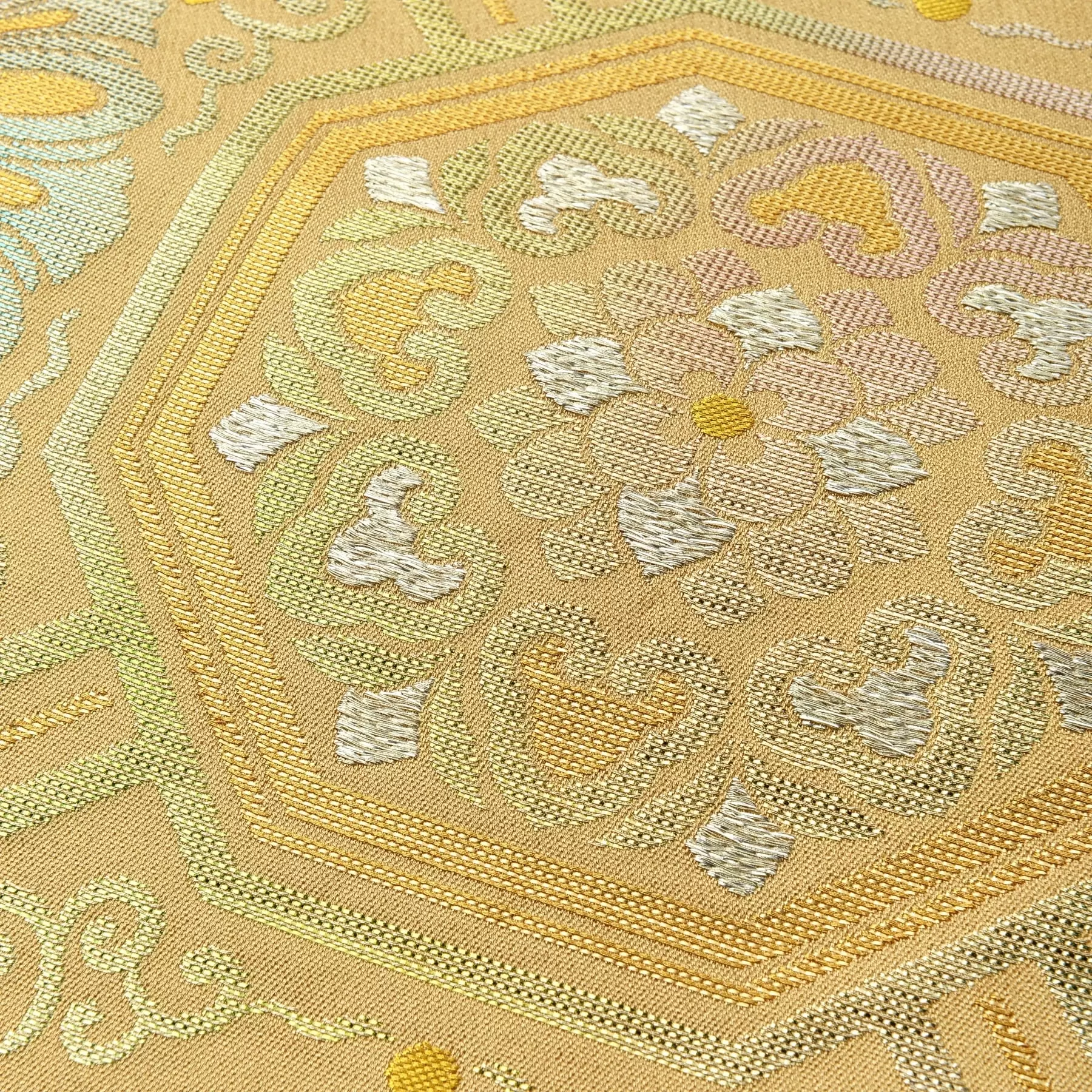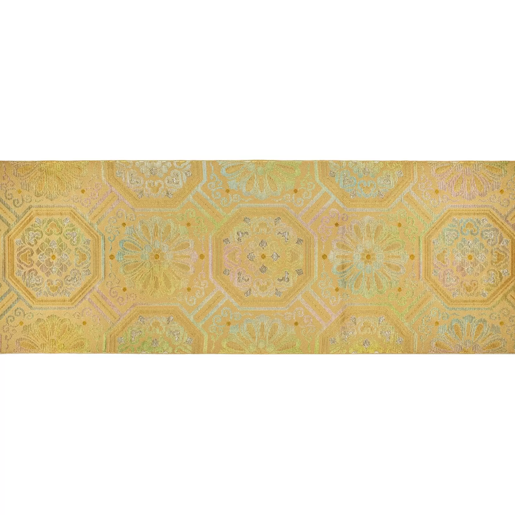 八角形と四角形を連続でつなげた古典的な蜀江文様を、千總の紋である「千切紋」を元に新たにデザインしました。水色、グリーン、ピンクのグラデーションが入った箔の糸を効果的に用い、角度によって色の変化が生まれるように作り上げました。様々な織組織を組み合わせることで立体感が生まれ、留袖から振袖、訪問着に使える格調高い袋帯です。
