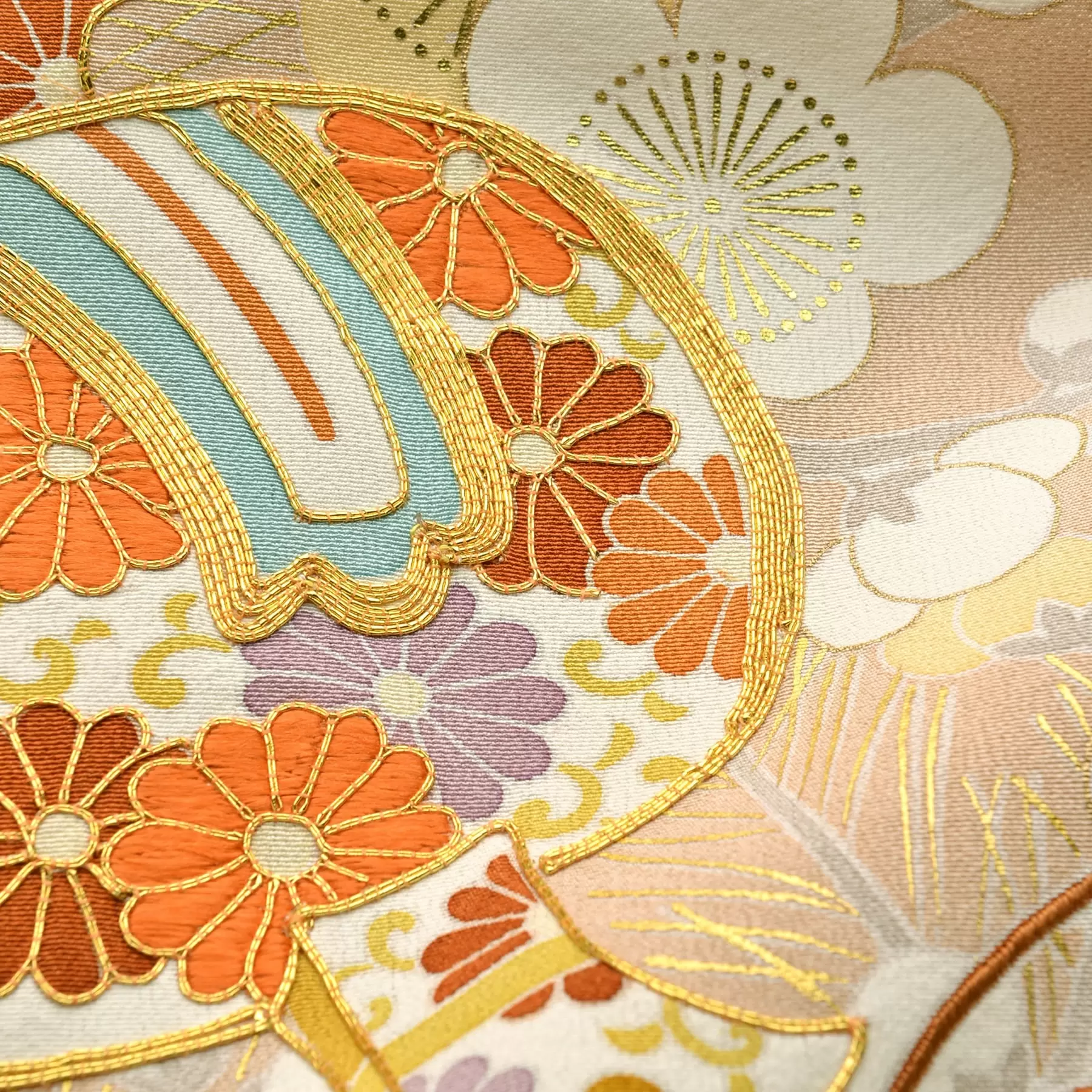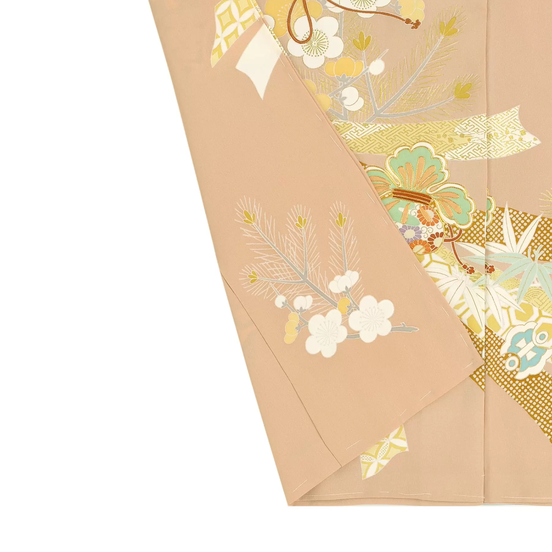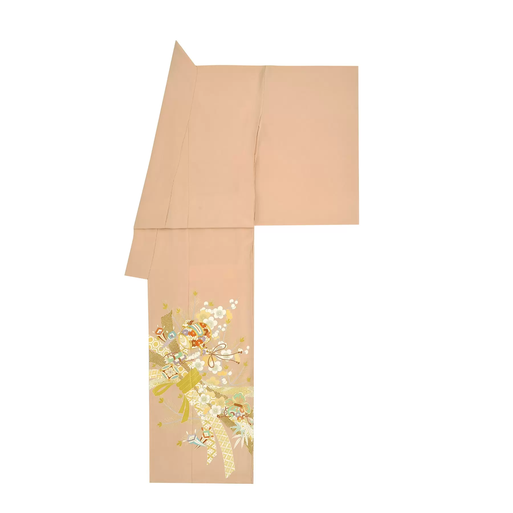 代表的な古典文様の束ね熨斗に小宝文様を合わせ、若松と梅花を添えたデザインで表現しました。落ち着いた肌色の地色にそれぞれの文様同士を主張しすぎない色遣いで描き、全体を見事に調和させています。お祝いの場に優しい美しさを添えてくれる色留袖です。