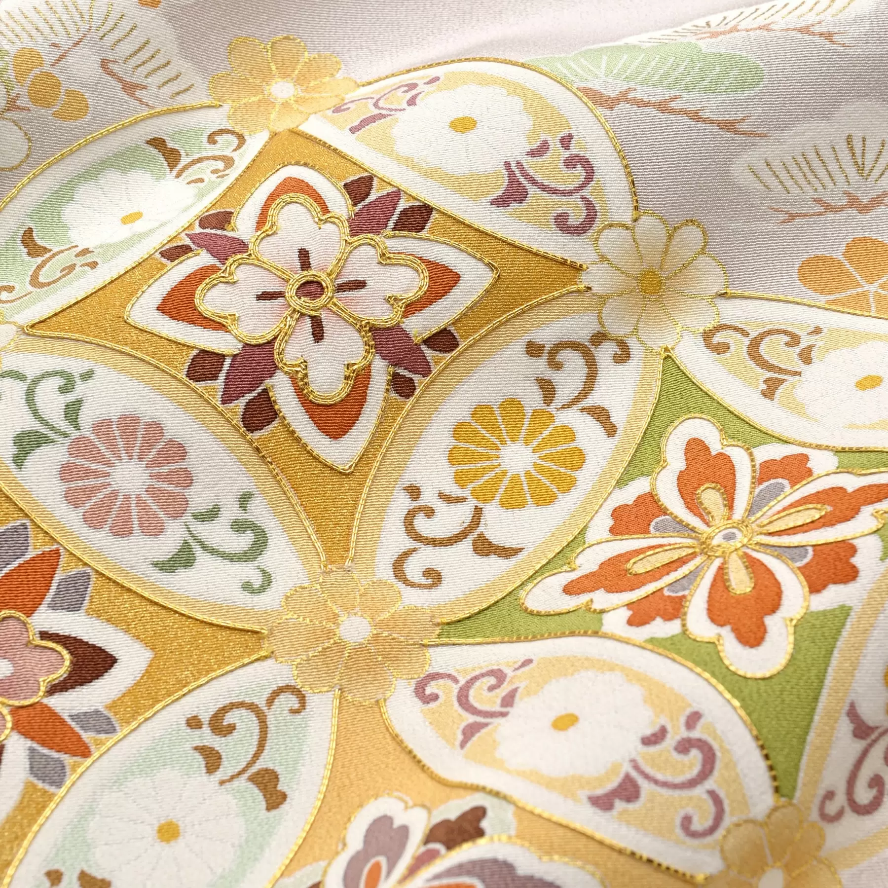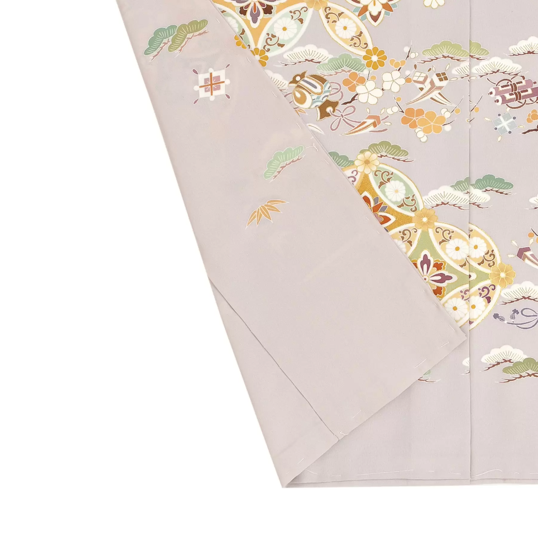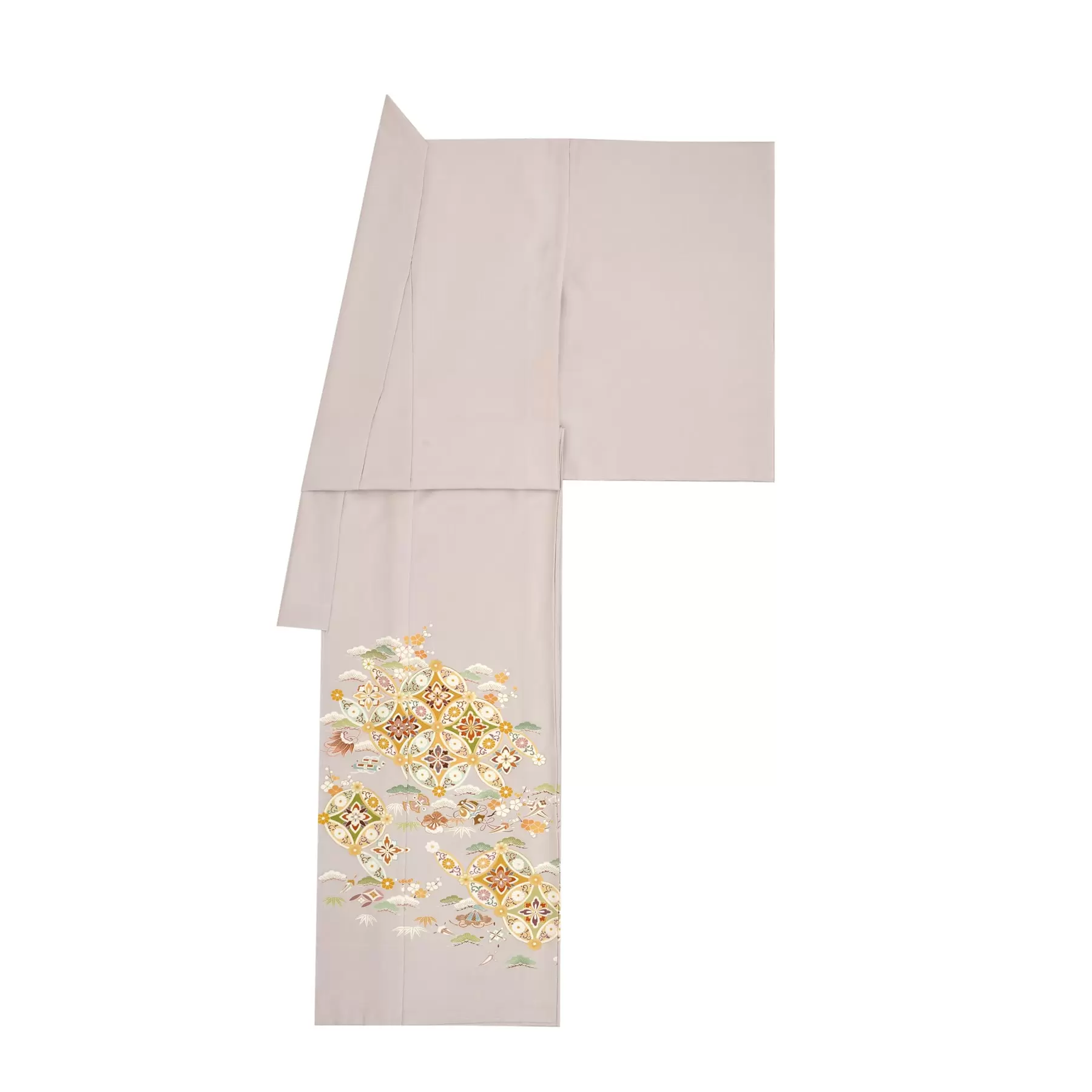 永遠を表す七宝文様に小宝文様を添えてデザインしました。落ち着きのある桜鼠色の地色に調和するよう、七宝文様を淡彩と濃色の色彩で描き上げ、小宝文様はさらに地色に溶け込むような趣で優しく表現しています。すっきりとお召しになれる一枚です。