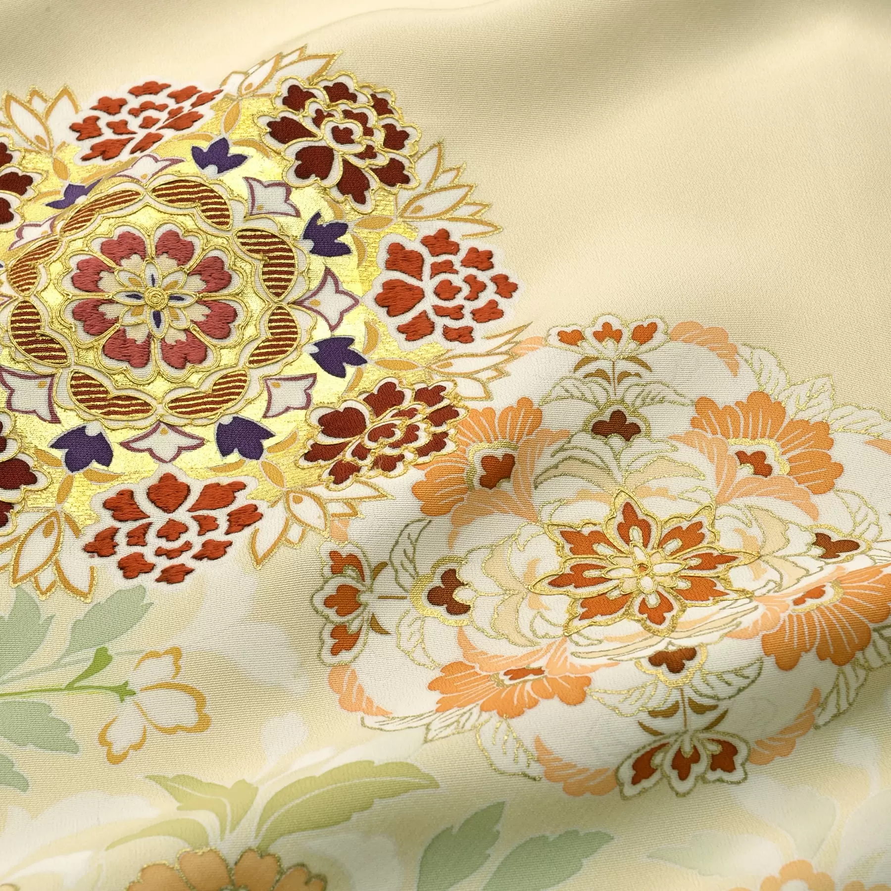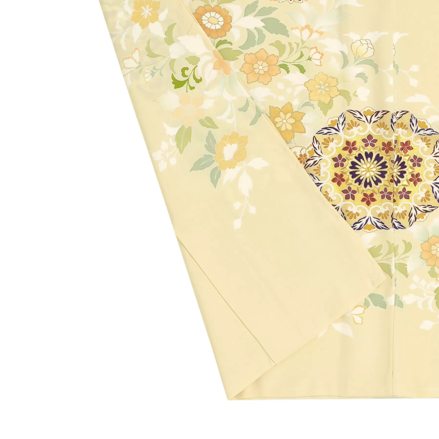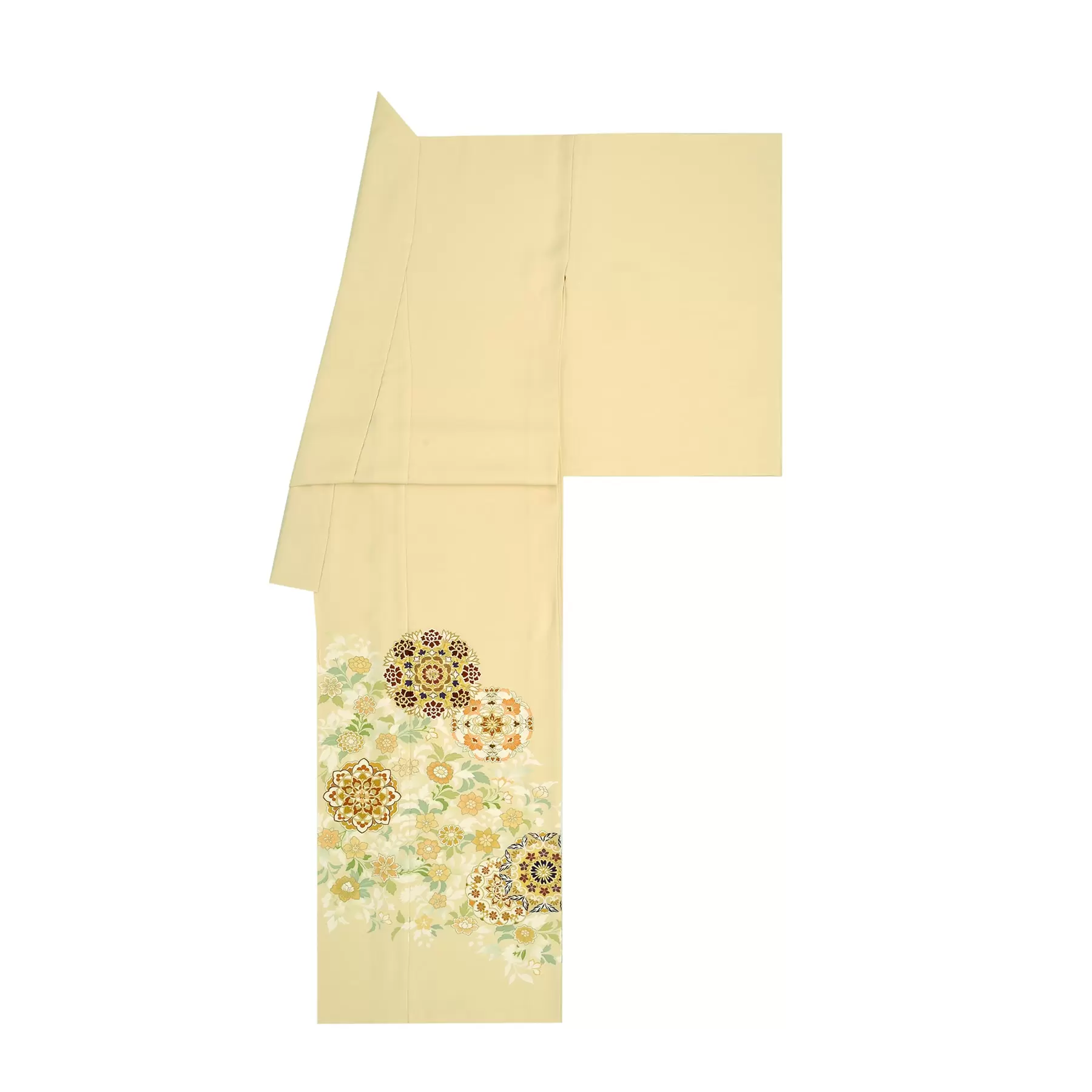 奈良時代に大陸より伝来した唐花文様と華紋柄を組み合わせてデザインしました。淡いきれいなクリームの地色に合わせて、唐花文様は淡い色調で、ポイントになる華紋柄はくっきりとした色調で描き、美しく調和されるように表現しています。若々しい明るさのある色留袖です。