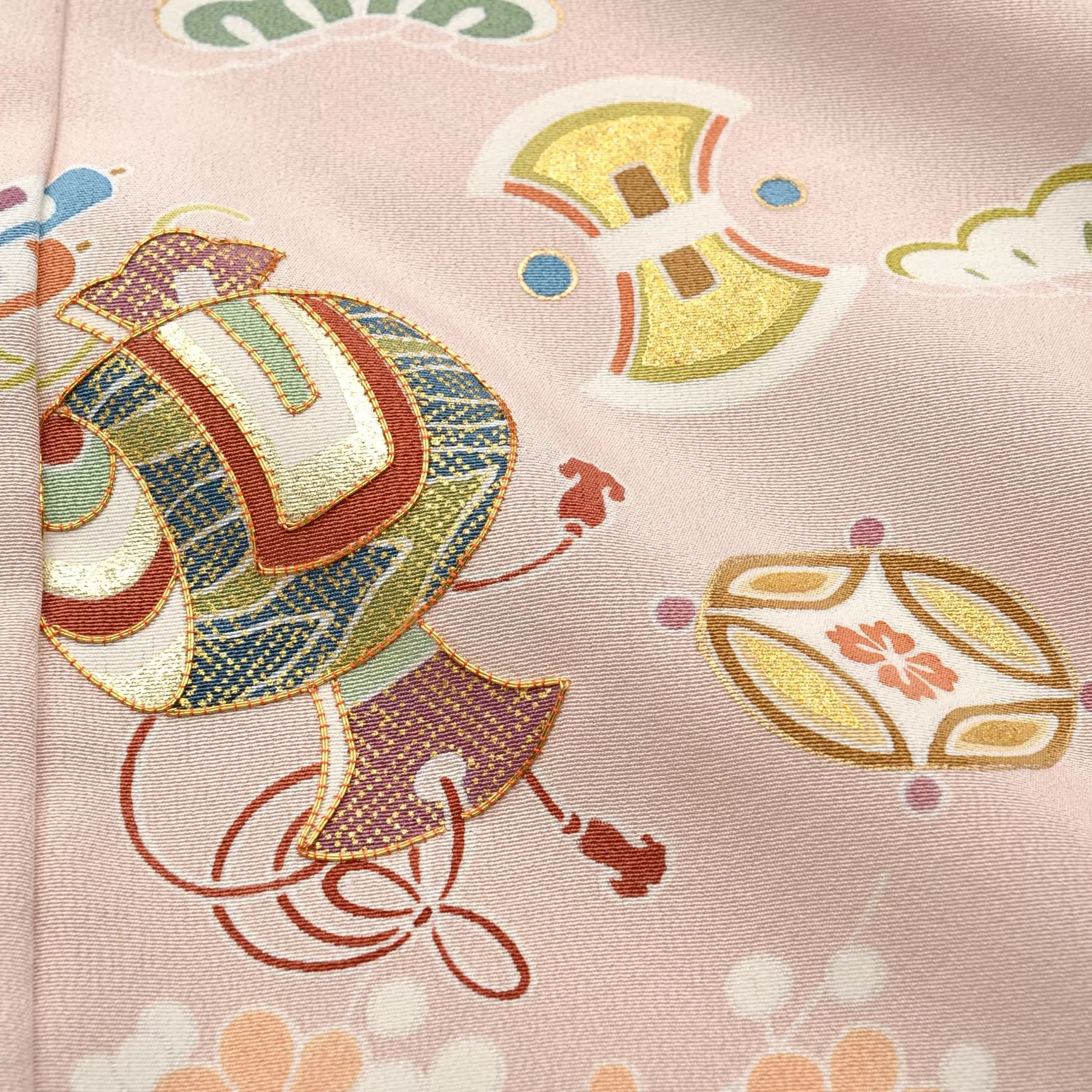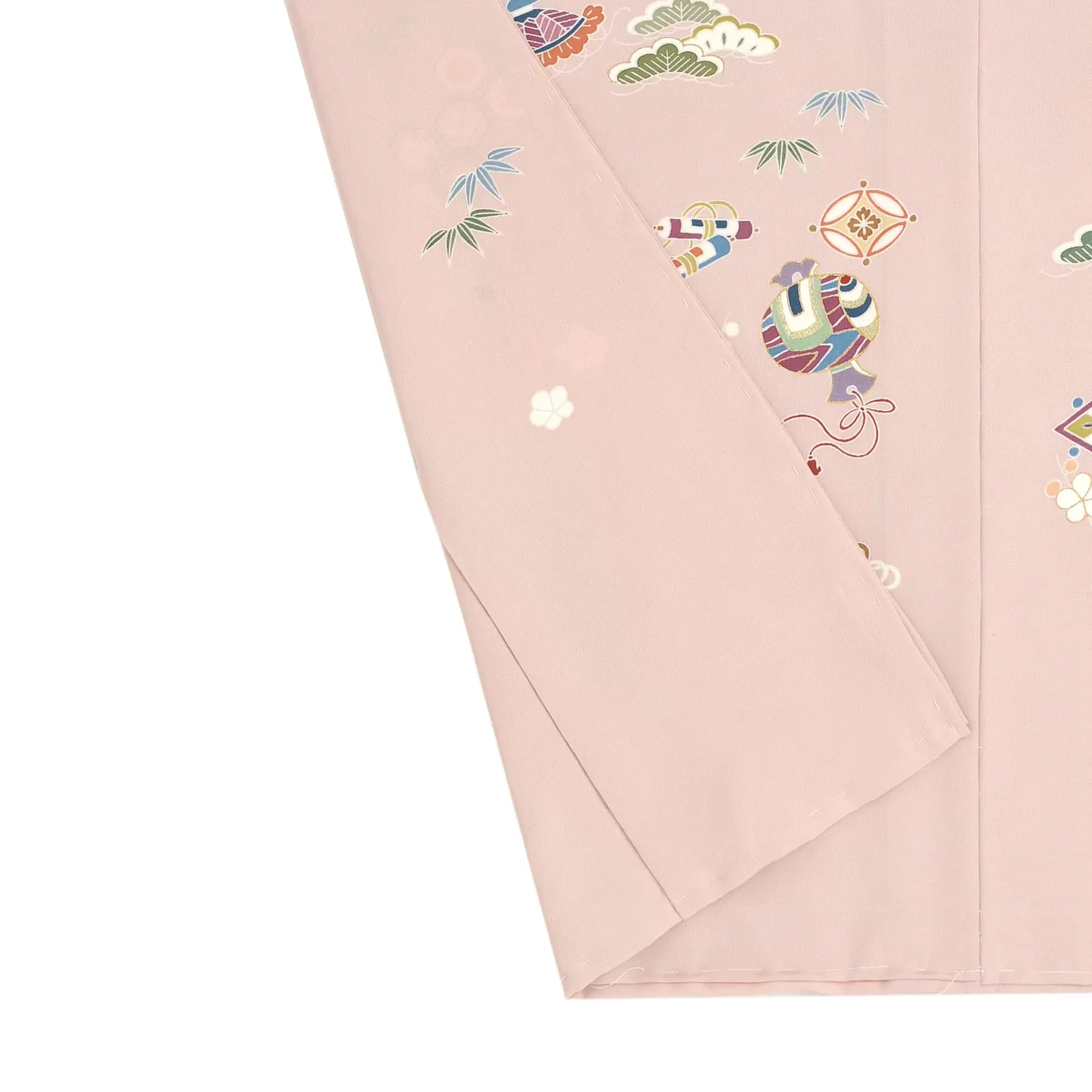 縁起の良いものを集めて福徳を呼ぶ吉祥文様である宝尽くしや、松竹梅、亀甲などのおめでたい文様を、淡いピンクの地色の上に、彩とりどりに散りばめました。お祝いの気持ちを表す文様でもある宝尽くしは、晴れの場にふさわしい彩りをそっと演出してくれる一枚です。