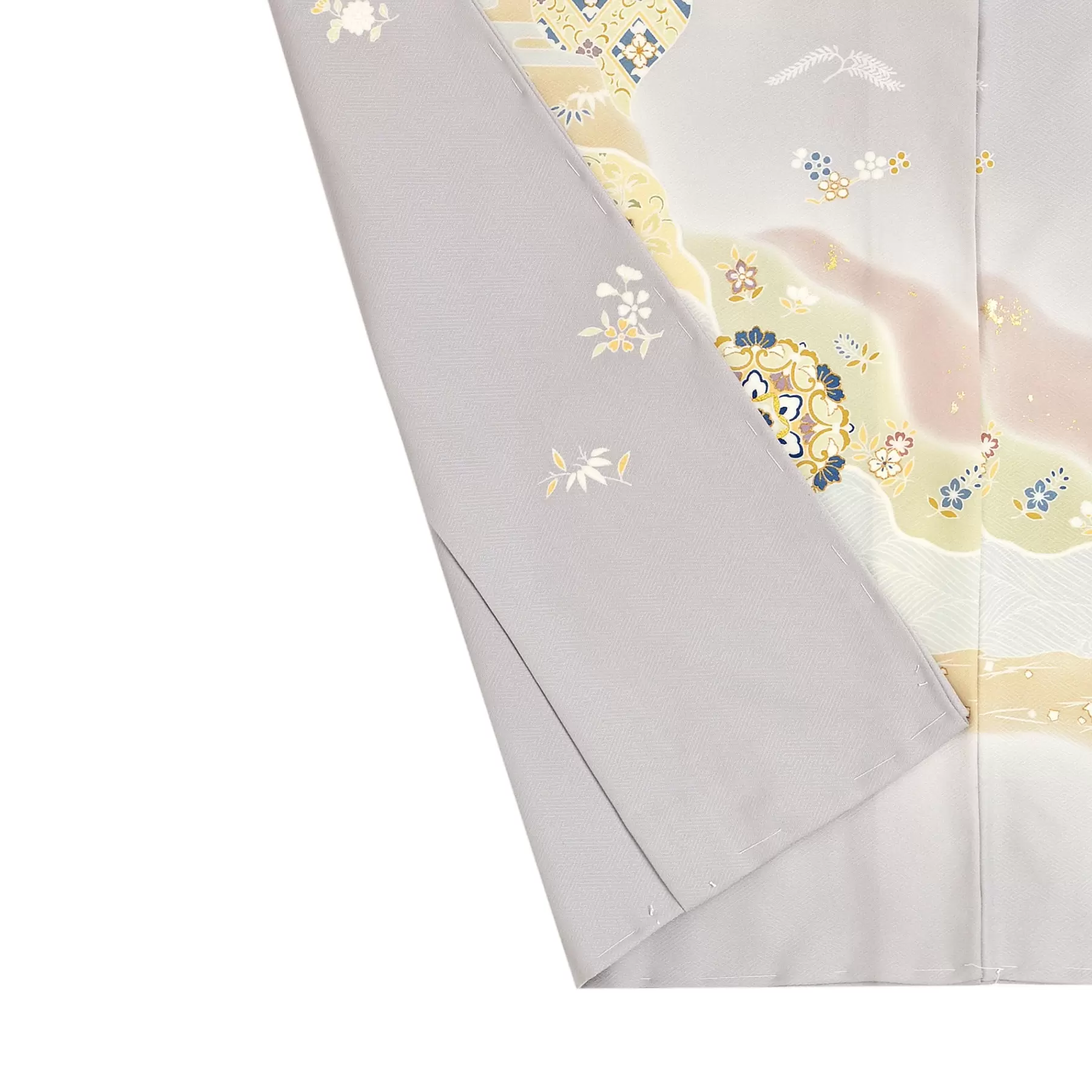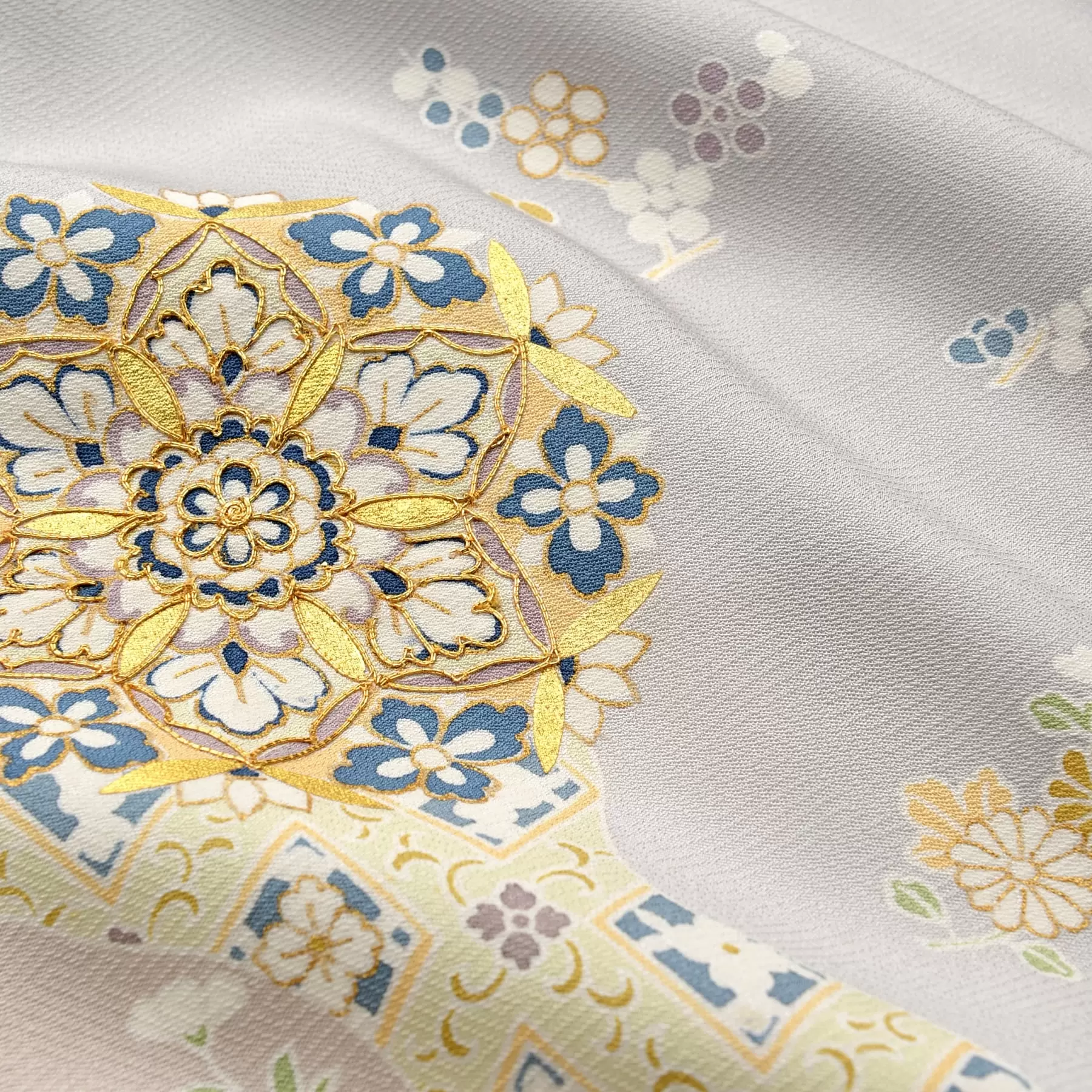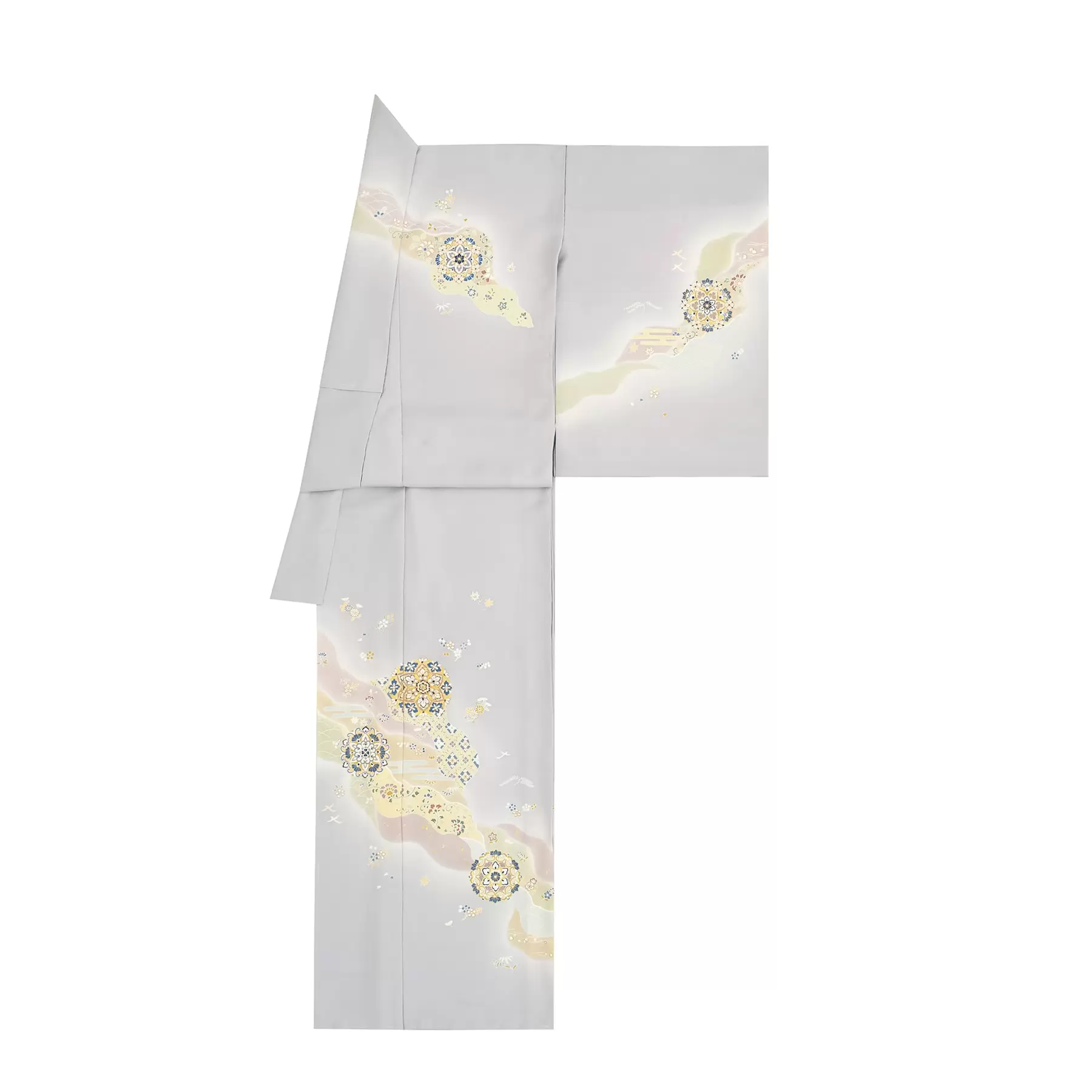 優しい色彩の流れを表現する料紙文様に、異国の煌めきが漂う華紋柄を合わせたエレガントな訪問着です。すっきりとした地色の印象に合わせて、料紙文様を同系色で染め分け、華紋の柄は寒色で表現しました。