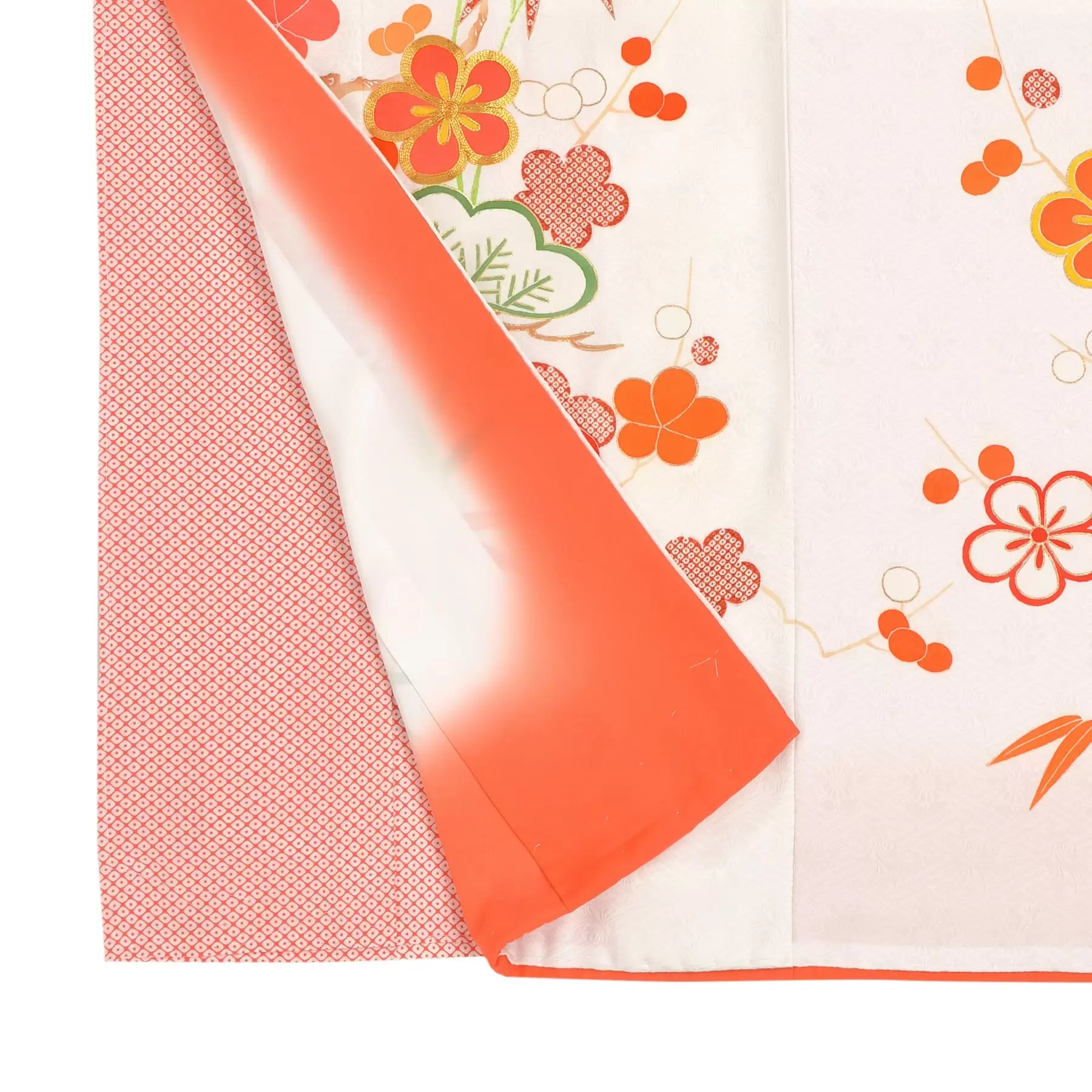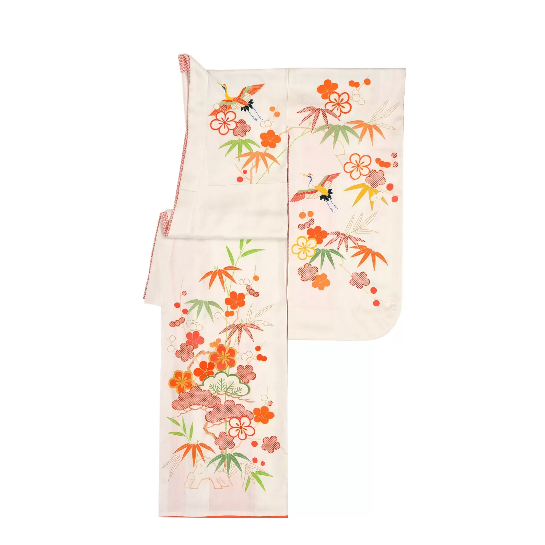 伝統的な松竹梅と鶴の文様を縦に伸び上がるようにデザインしたおめでたい祝着です。一つのモチーフを様々な技法で描くことで遠近感を演出し、紅白に描き分けられた梅を全体にバランスよく配してポイントにしています。永遠性を意味した松竹梅と羽ばたいていく鶴にこれからの健やかなご成長の想いが込められています。
