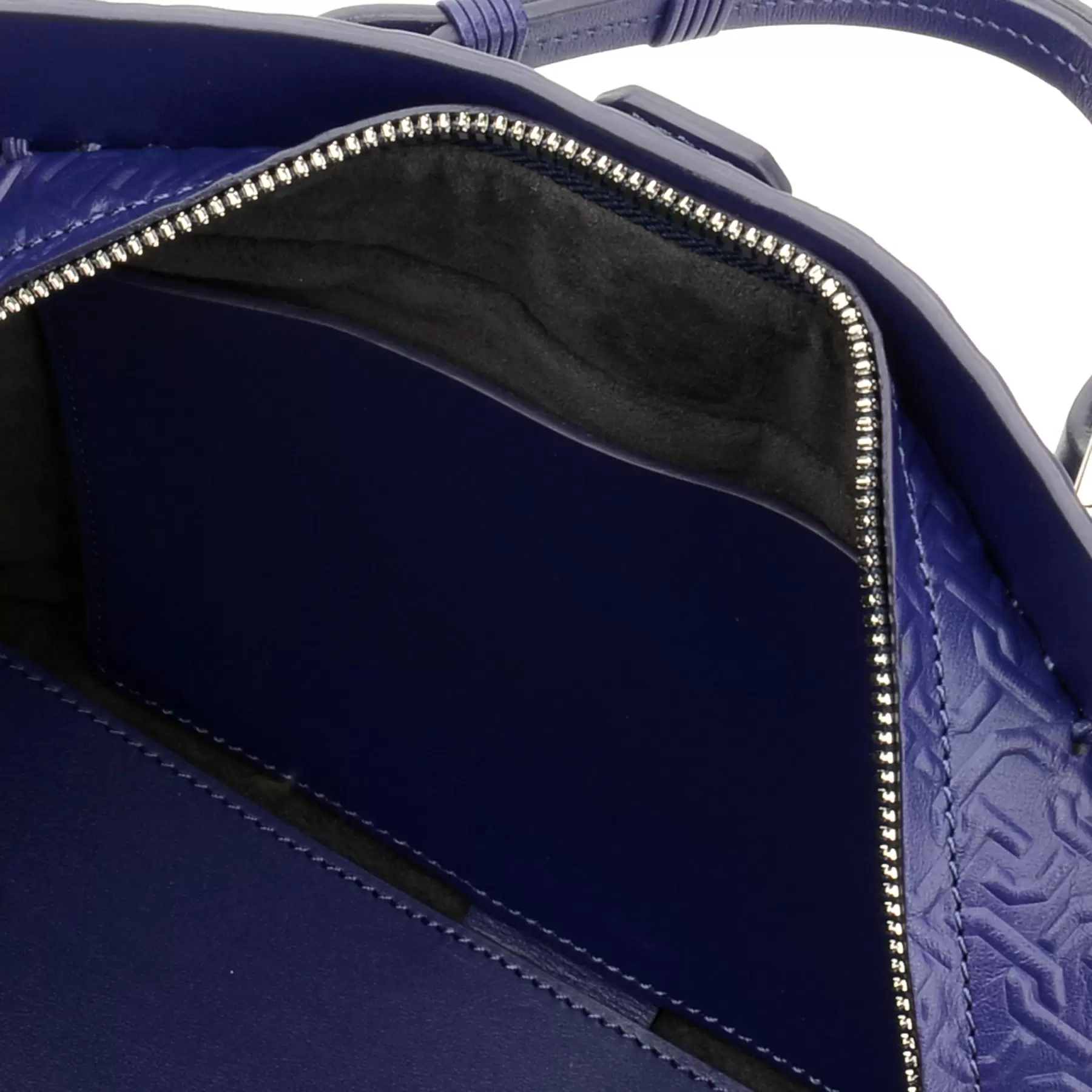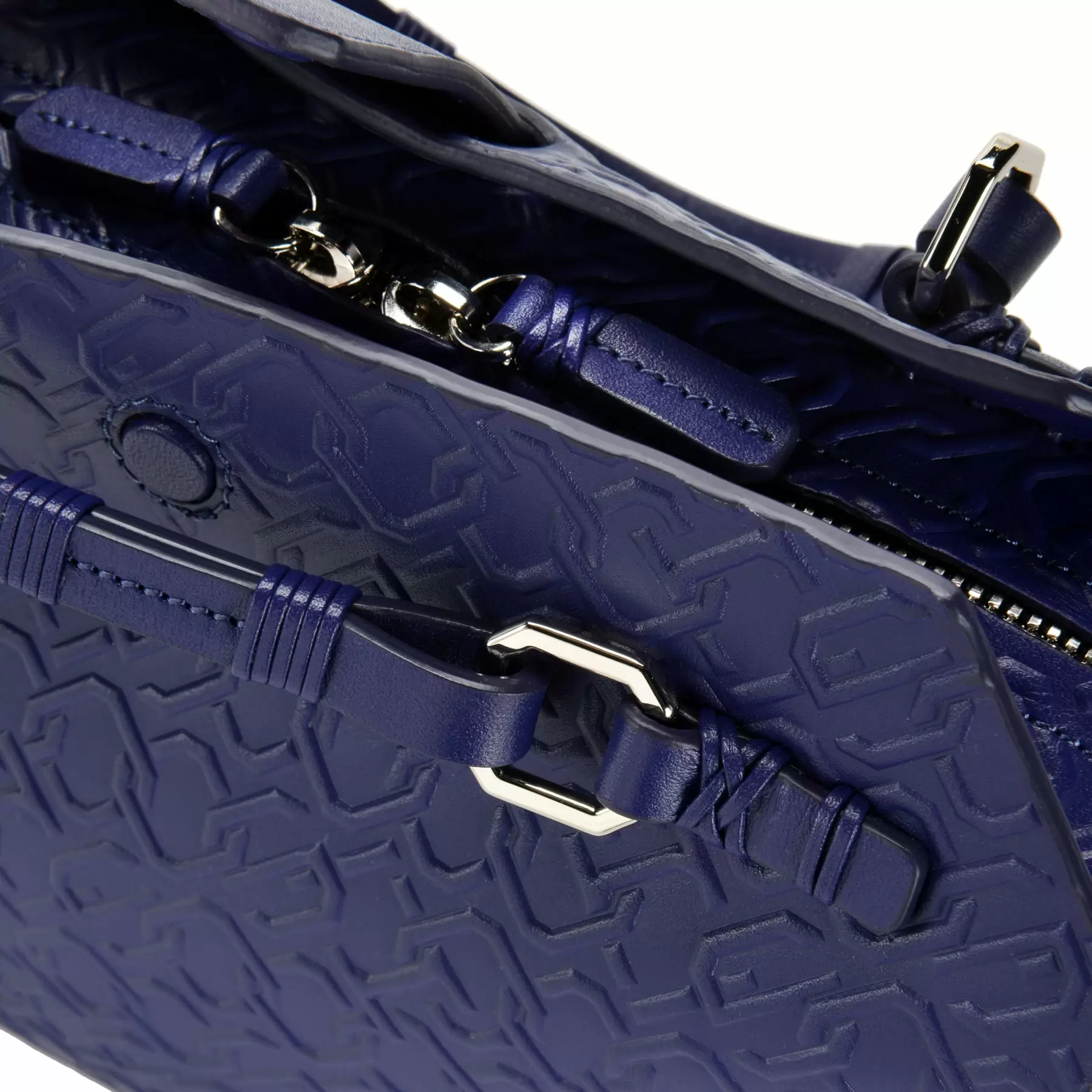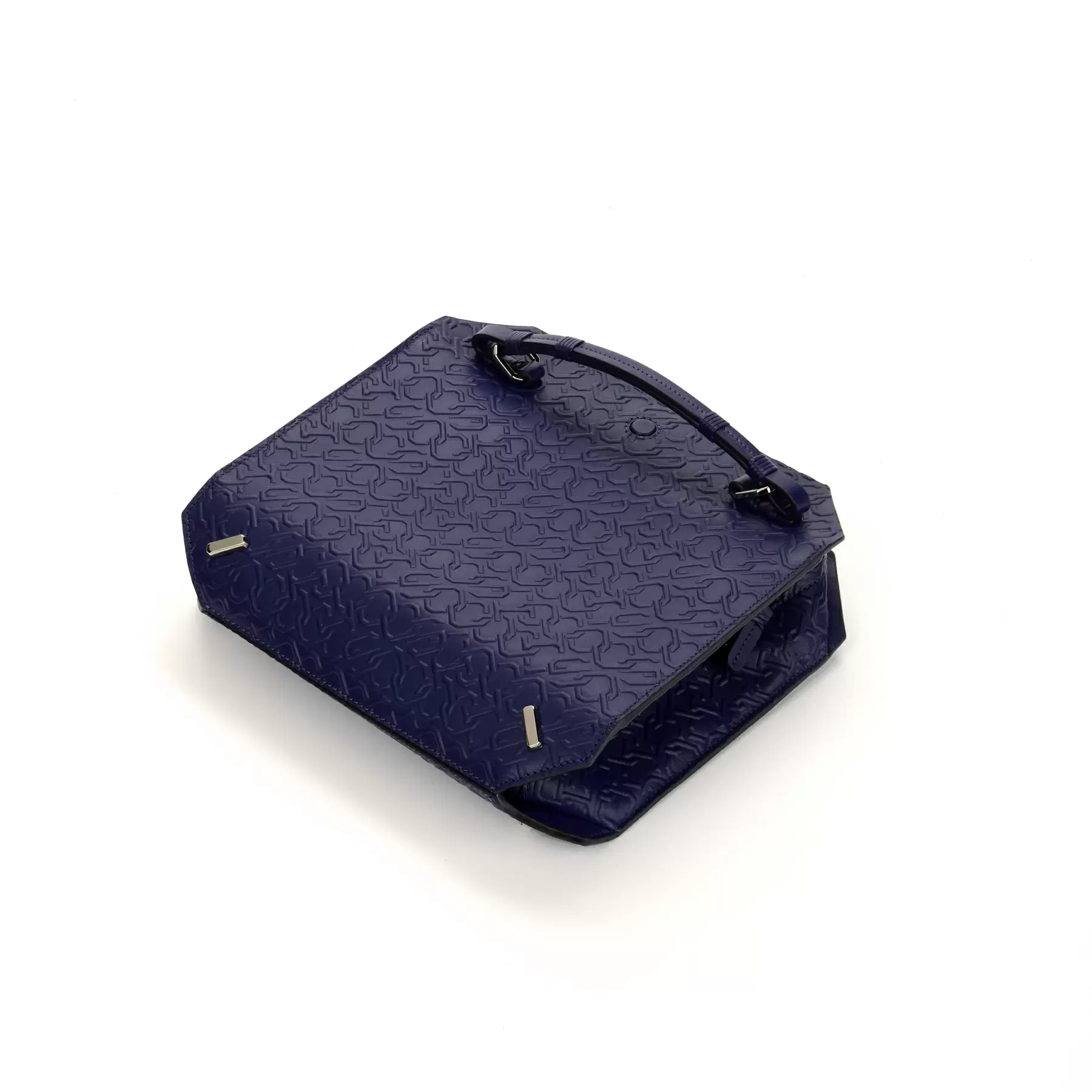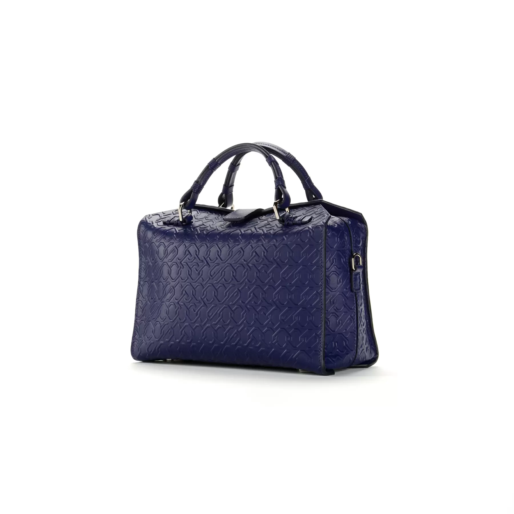 千總の紋にも使われている隅切り四角形をモノグラムデザインに仕上げ、型押しを施したボディー、竹籠バッグを思わせるハンドルの編み方、幾重にも重ねられたコバ塗りなど、日本の職人の美しい手仕事が随所に生かされています。