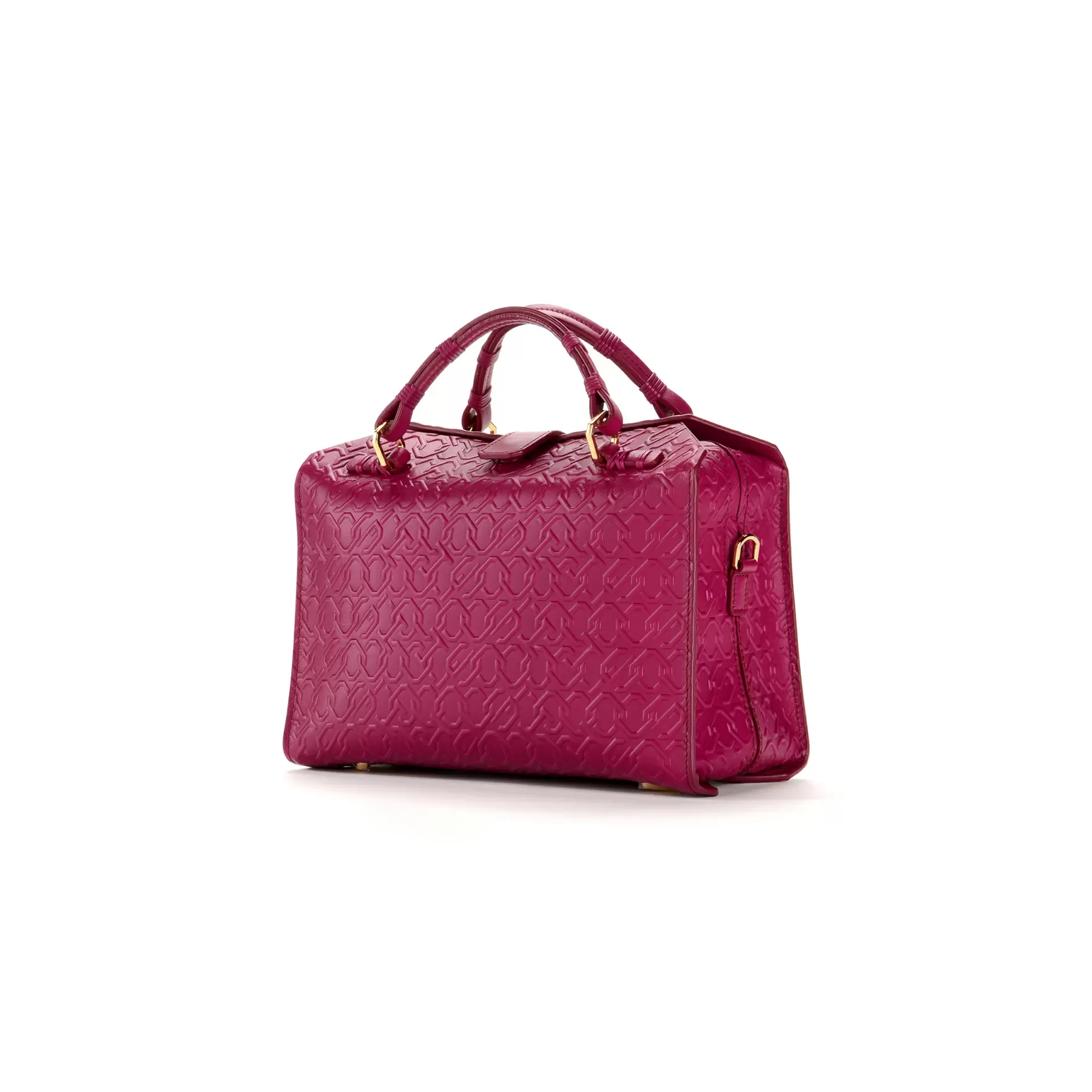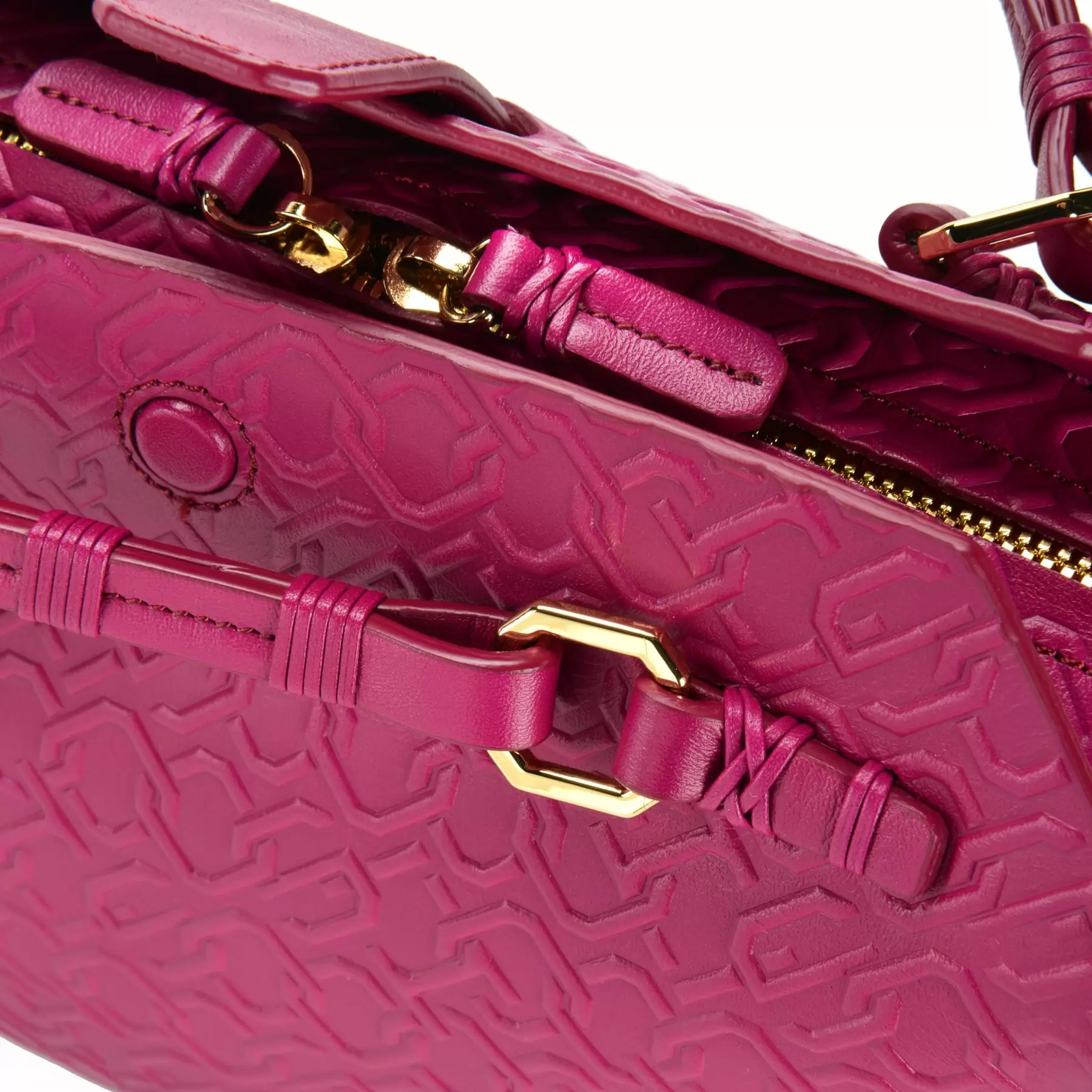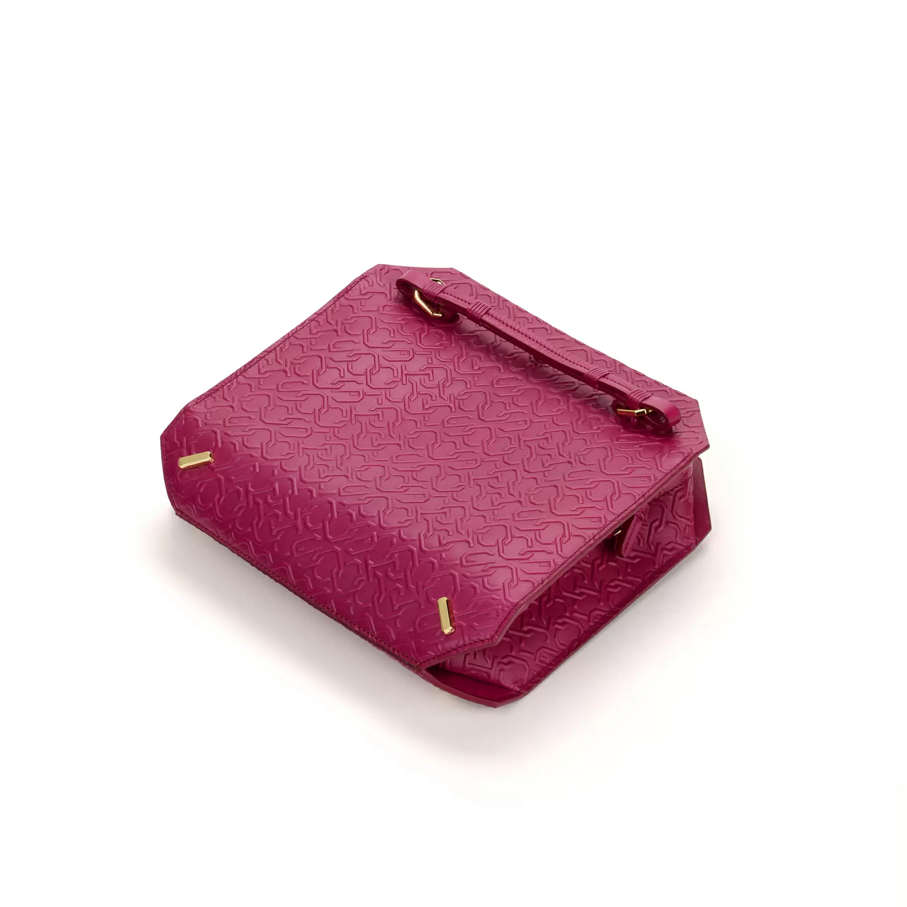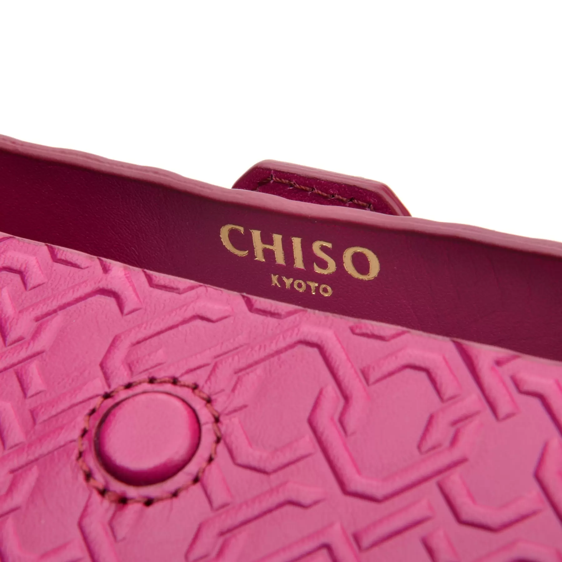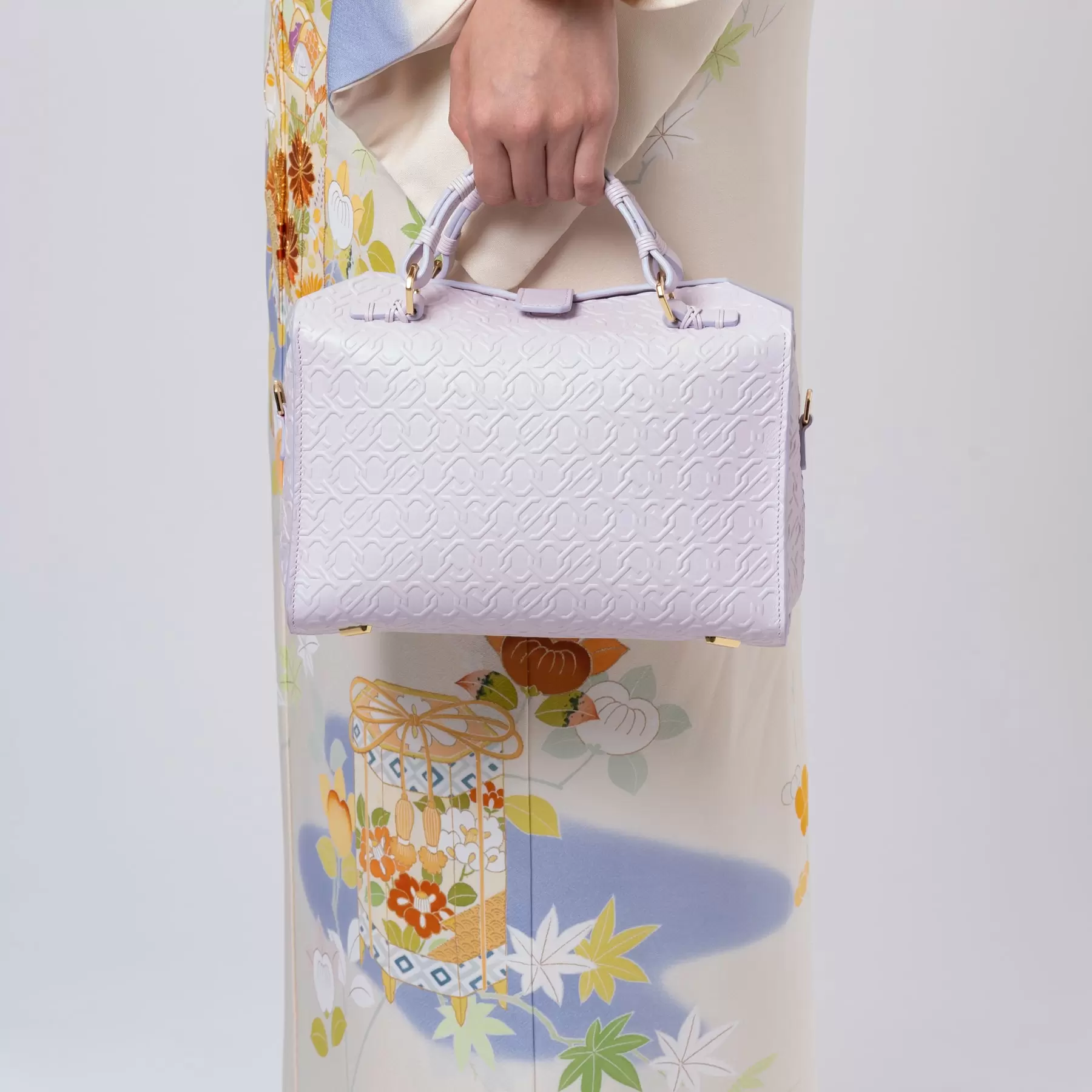 千總の紋にも使われている隅切り四角形をモノグラムデザインに仕上げ、型押しを施したボディー、竹籠バッグを思わせるハンドルの編み方、幾重にも重ねられたコバ塗りなど、日本の職人の美しい手仕事が随所に生かされています。