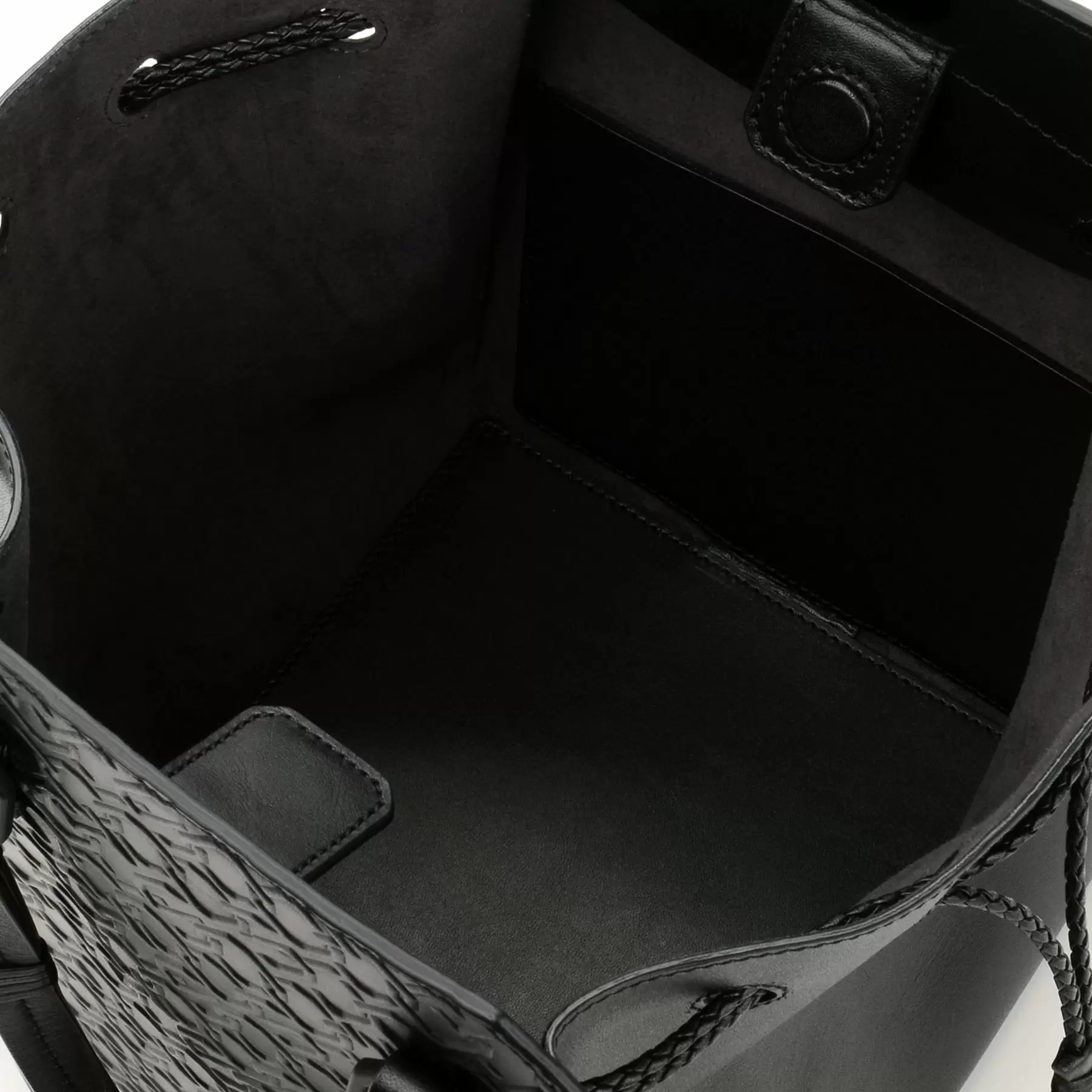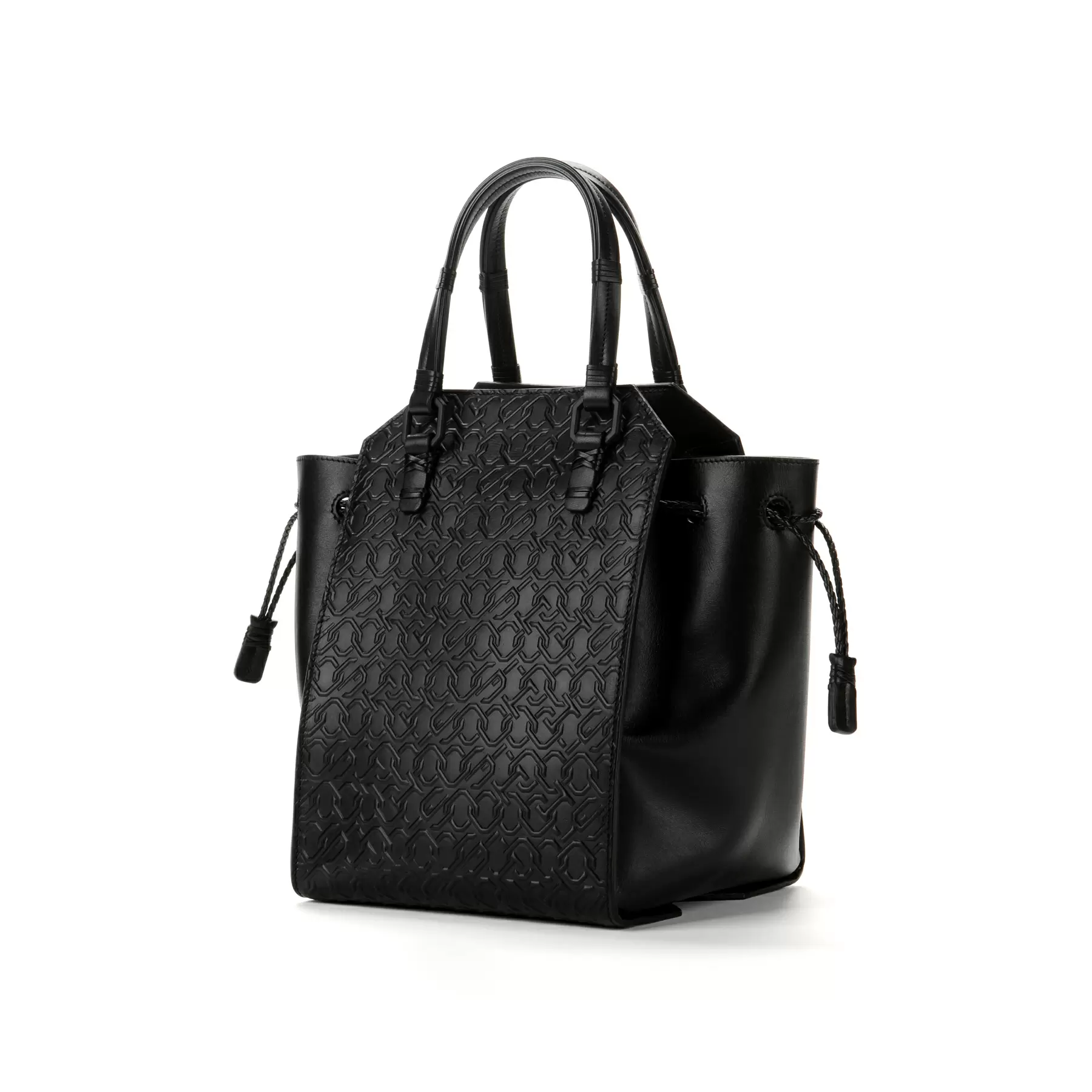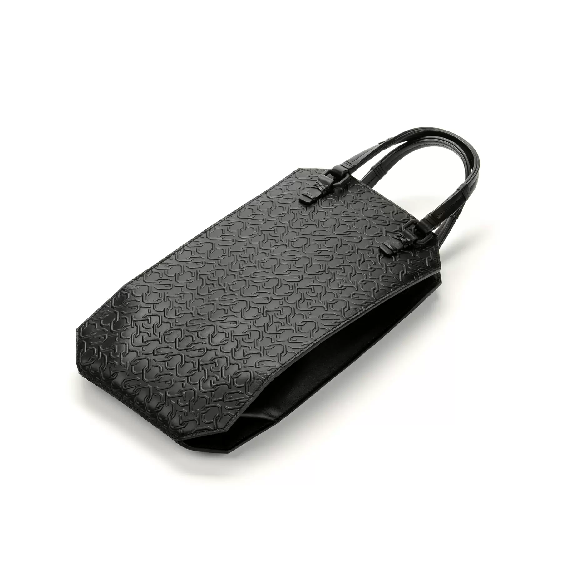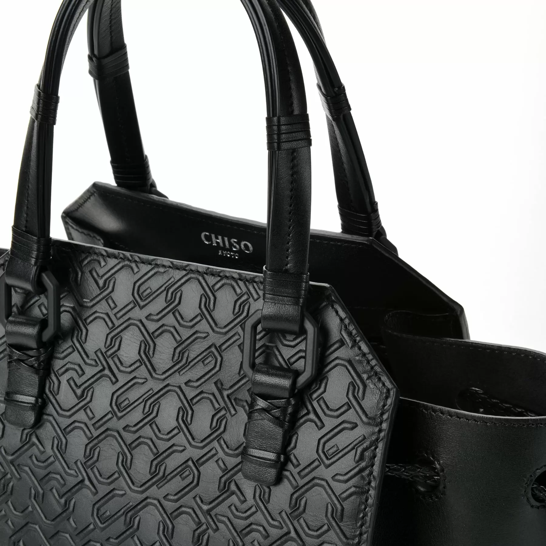 千總の紋にも使われている隅切り四角形をモノグラムデザインに仕上げ、型押しを施したボディー、竹籠バッグを思わせるハンドルの編み方、幾重にも重ねられたコバ塗りなど、日本の職人の美しい手仕事が随所に生かされています。