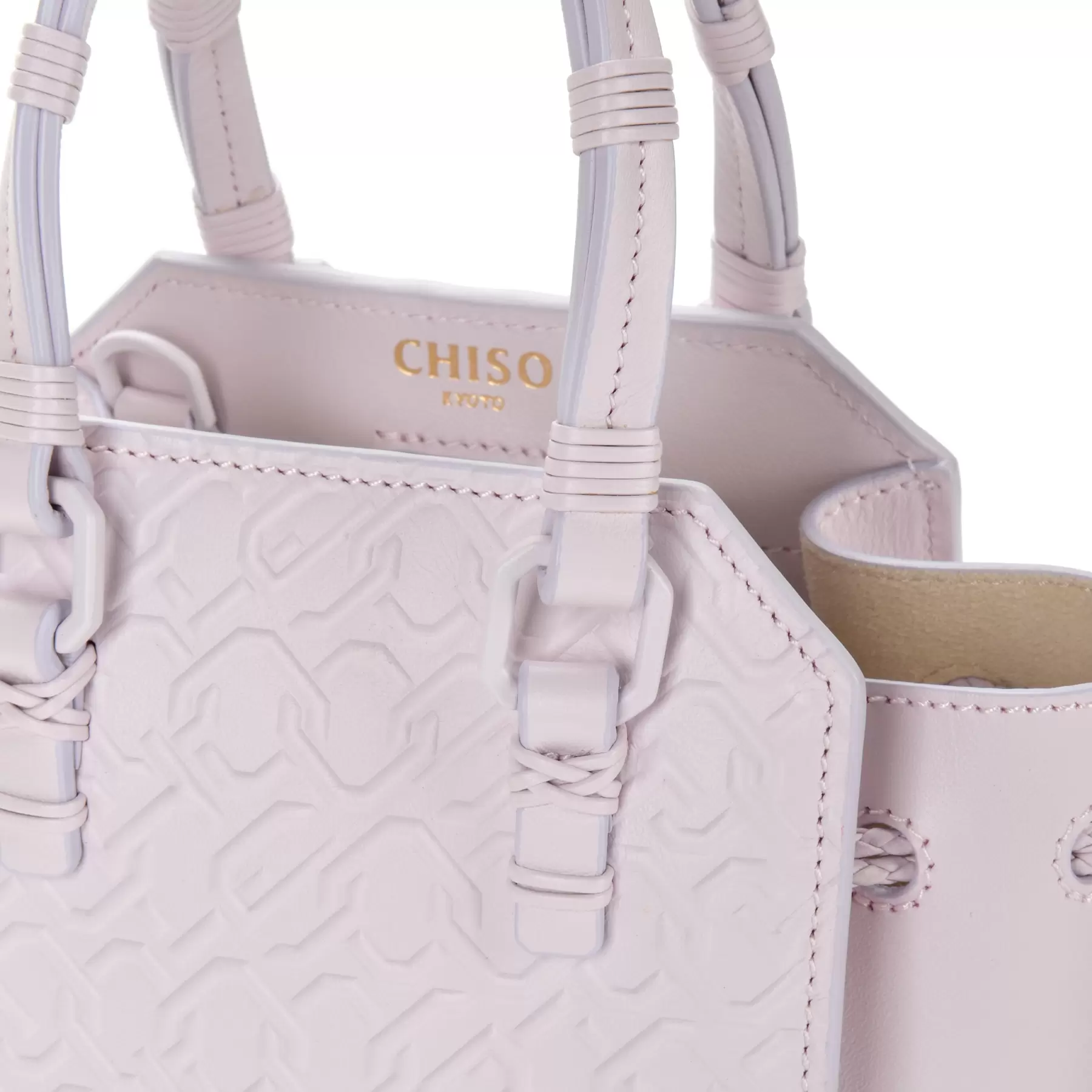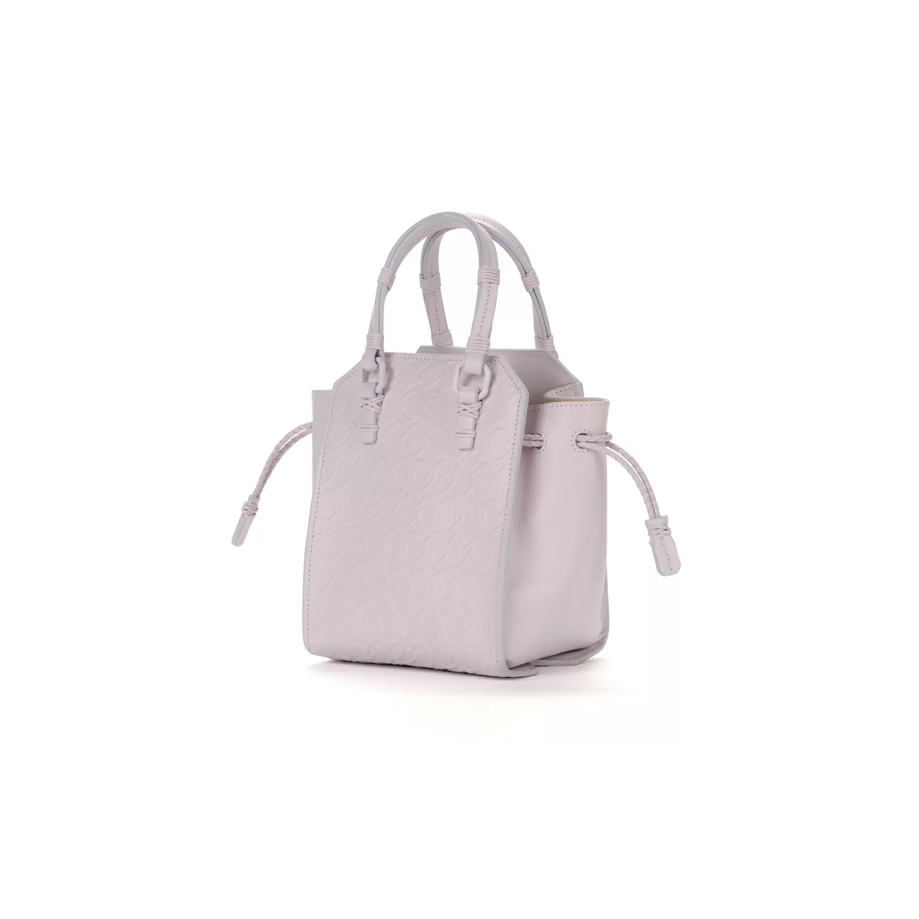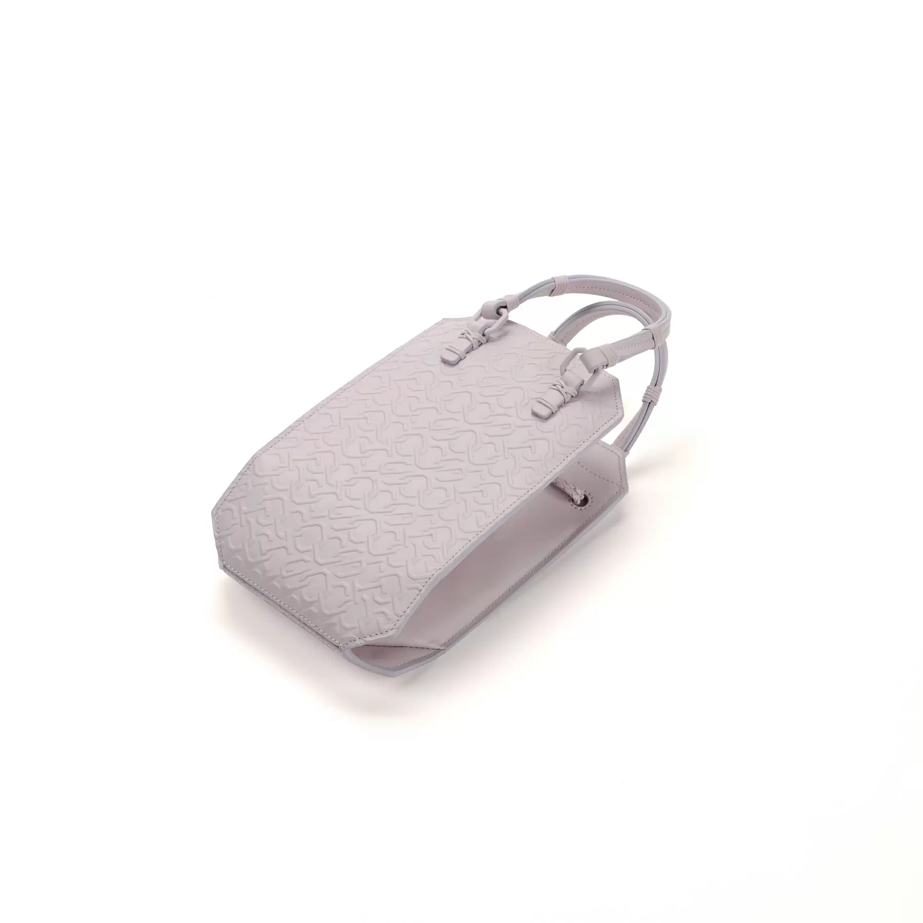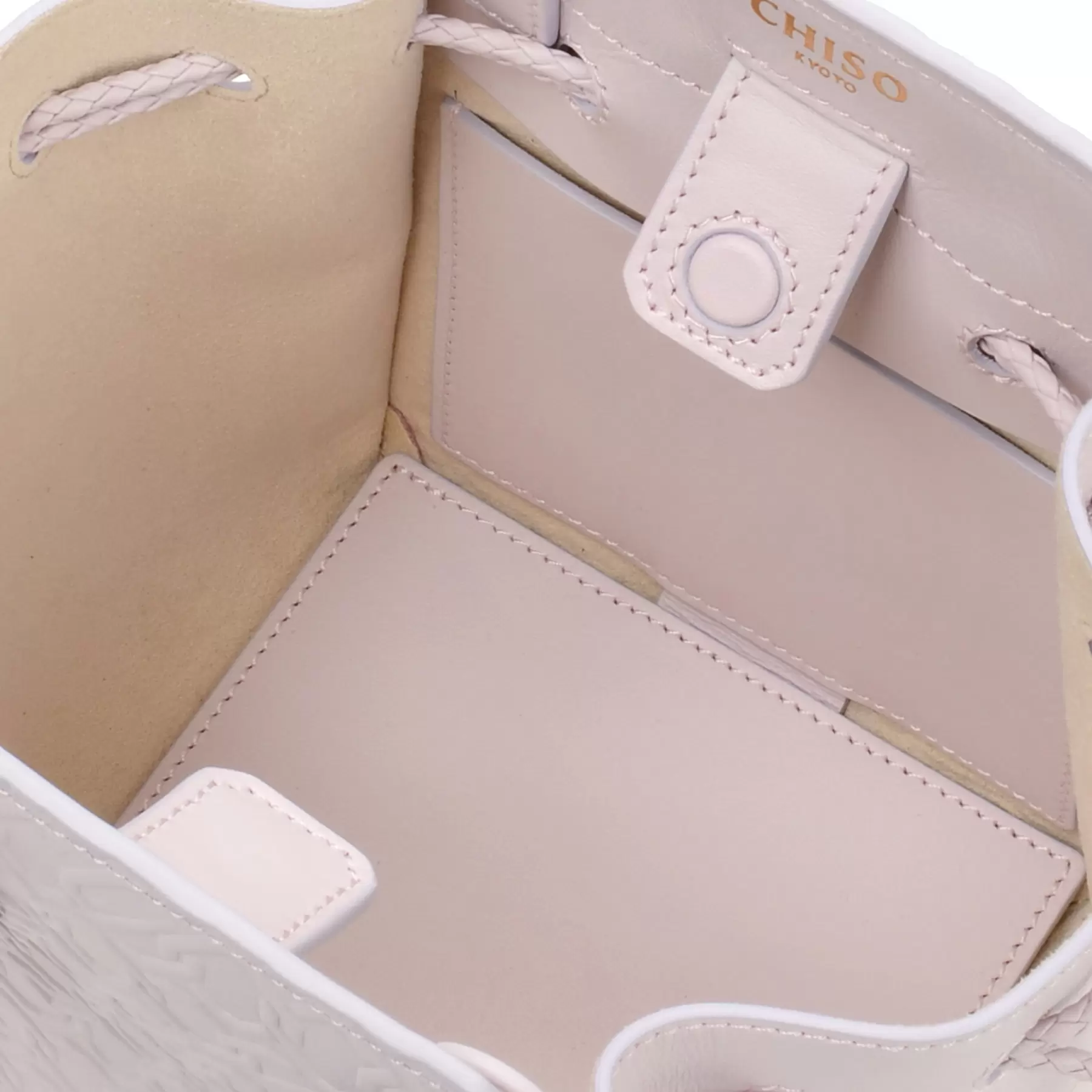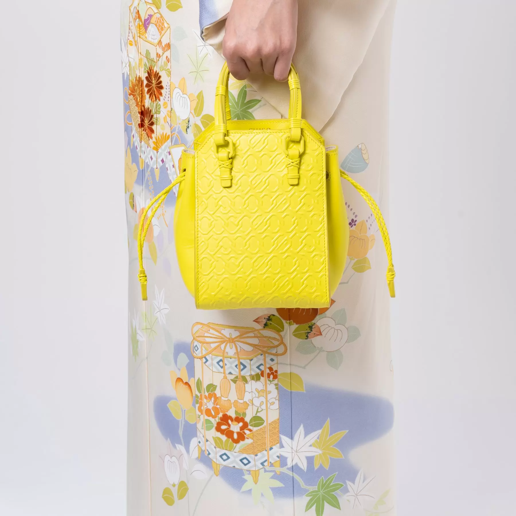 千總の紋にも使われている隅切り四角形をモノグラムデザインに仕上げ、型押しを施したボディー、竹籠バッグを思わせるハンドルの編み方、幾重にも重ねられたコバ塗りなど、日本の職人の美しい手仕事が随所に生かされています。