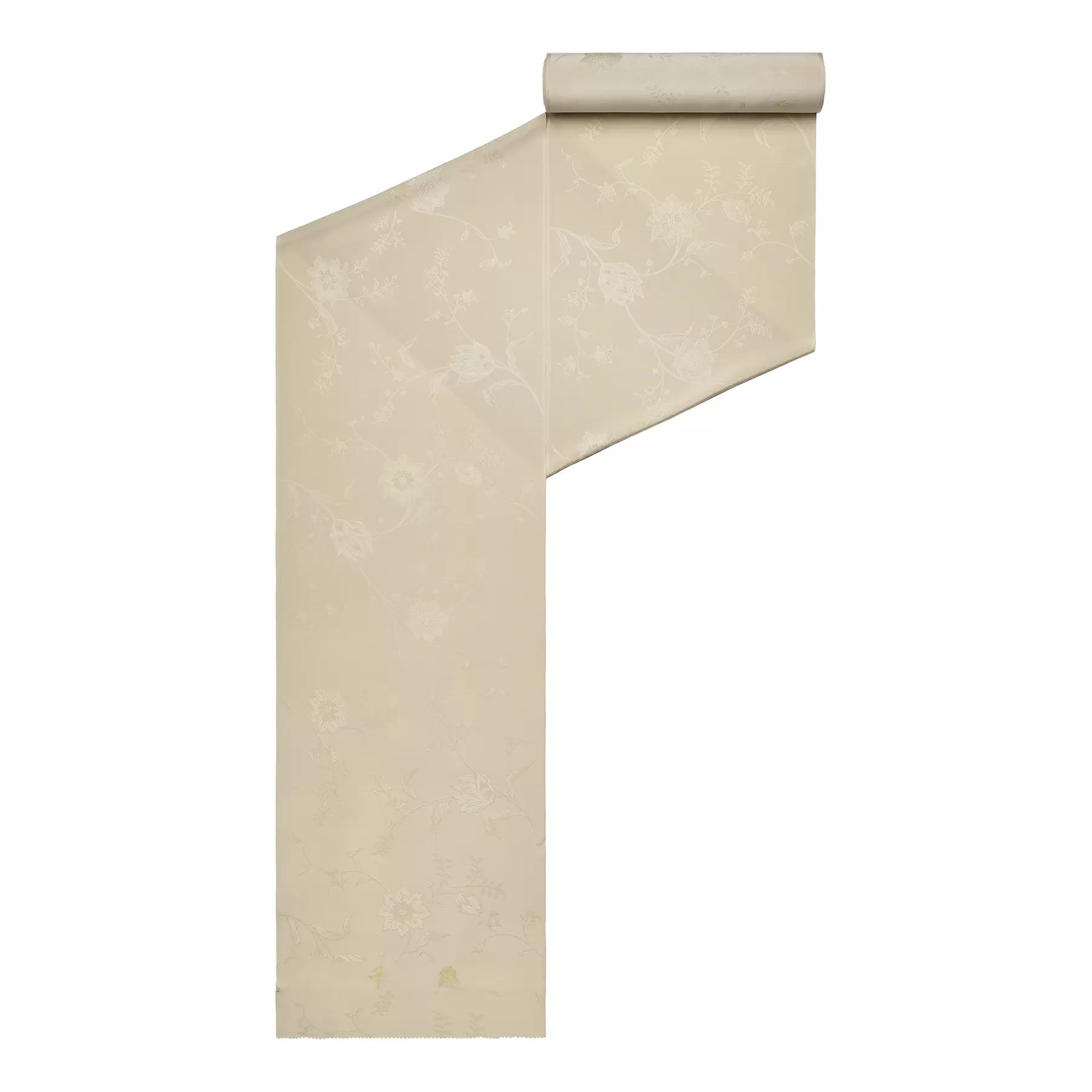 古来の染織品に見られる更紗文様を伸びやかにあしらった豪華な地紋を、クールなベージュに染めたエレガントな色無地です。大柄の唐花が落ち着いた色に華やかさを添えてくれ、パーティーからお茶席まで、幅広くお召いただける使いやすい一枚です。