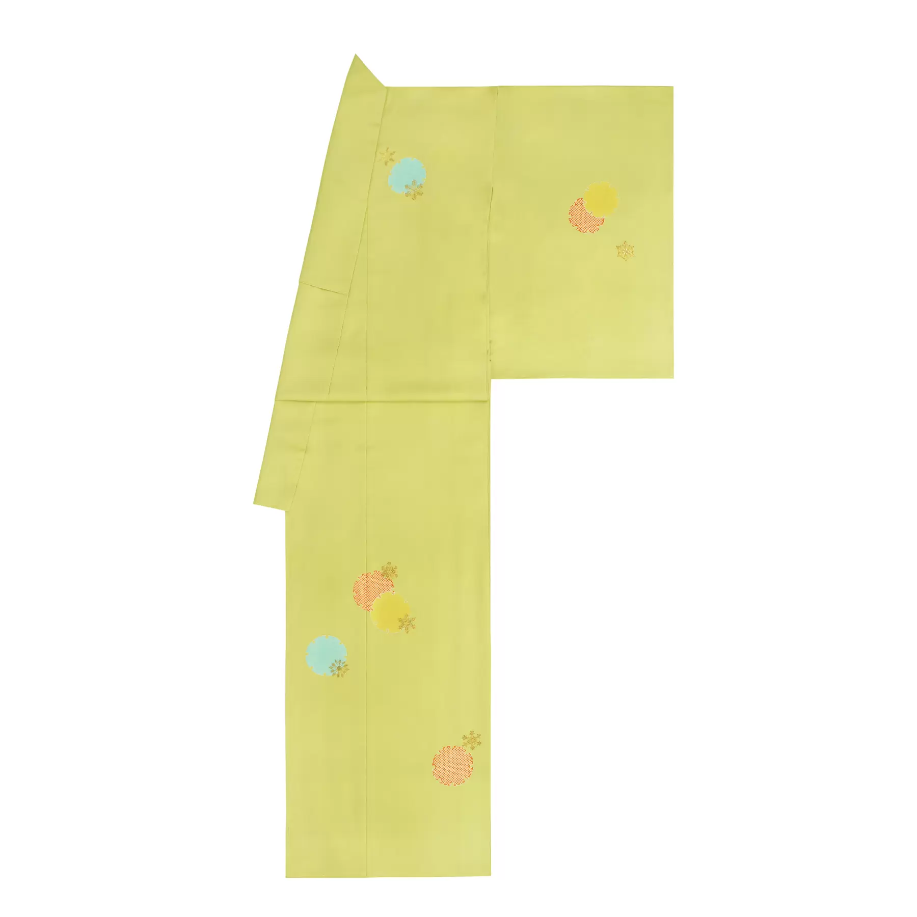 鮮やかな黄緑の地色とカラフルな雪輪の色合わせが楽しい一枚です。目から涼を感じる雪輪と、箔と刺繍で入れられた雪の結晶が可愛らしさの中に大人の女性の品を添えてくれています。