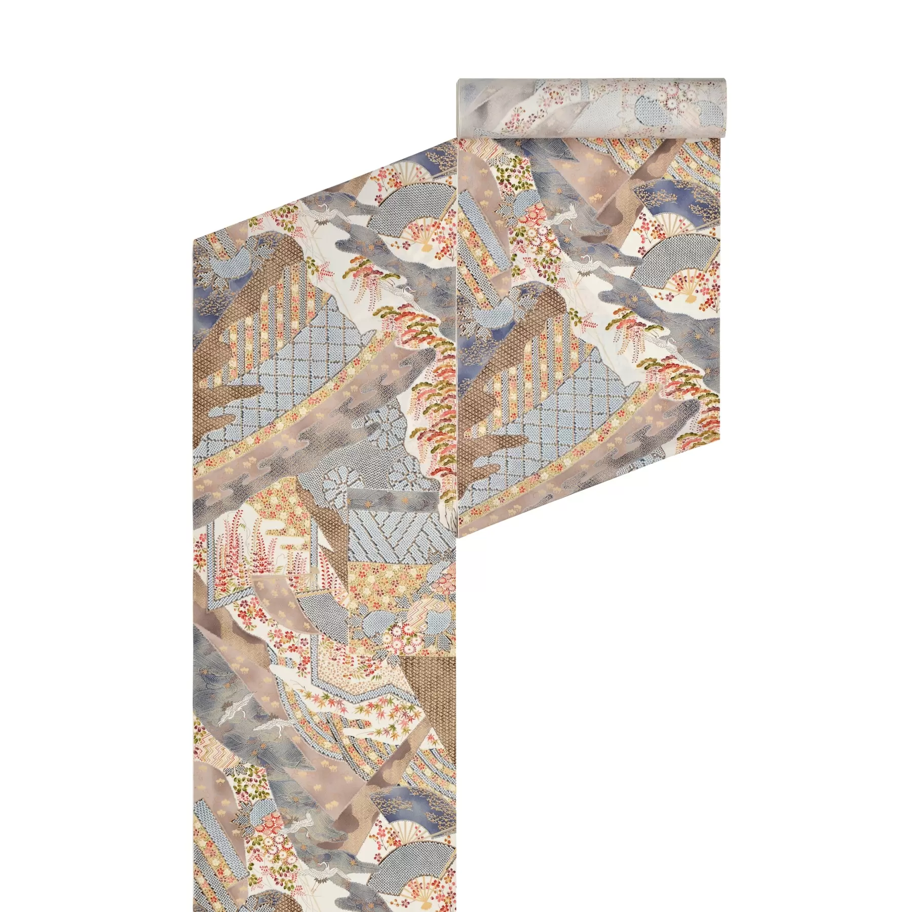 疋田や小紋箔を全体に細かく配し、自然の風景を抽象的に描き出した慶長文様を表現しました。面と曲線が複雑に重なり合うデザインは立体的な着姿を作り上げてくれます。茶や藍の落ち着きのある色彩の上に鮮やかな赤や紫、緑の小花がよく映えます。コーディネートが楽しくなる一枚です。