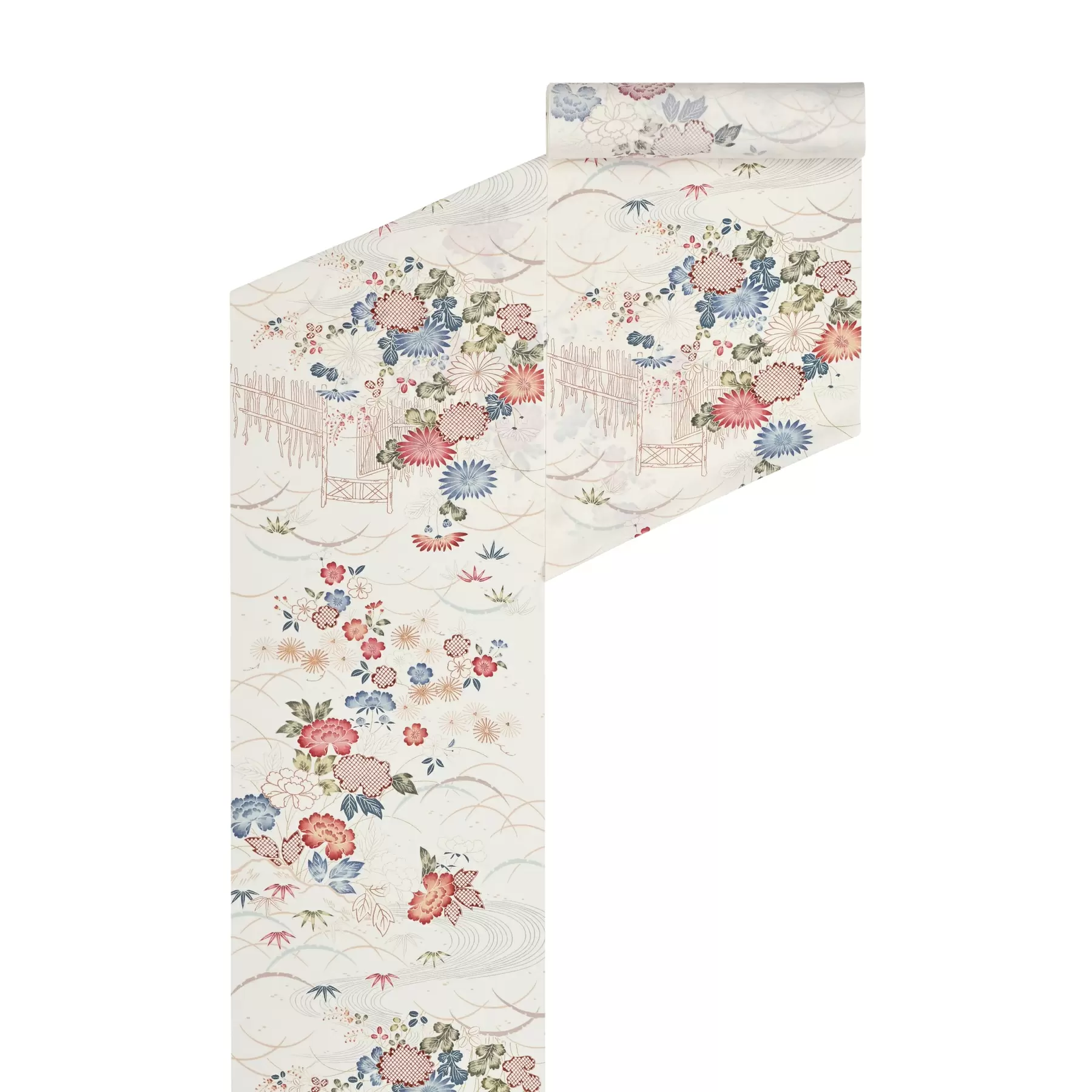 真っ白な生地に大きめの御所解文様が美しく映えるデザイン。落ち着きのある赤や朱、藍色などで染め上げた草花は、細かい暈しが随所に施され、奥行きと可憐さを醸し出しています。パーティーなどの華やかなシーンにもおすすめです。